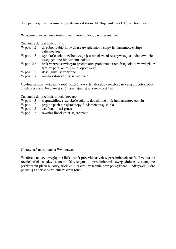 dot.: przetargu na: „Wymianę ogrodzenia od strony Al. Bojowników i DTŚ w Chorzowie”. Wnosimy o wyjaśnienie treści przedmiarów robót do ww. przetargu. Zapytanie do przedmiaru nr 1: W poz. 1.2 do robót rozbiórkowych nie uwzględniono stopy fundamentowej słupa żelbetowego W poz. 1.3 wysokość cokołu żelbetowego jest mniejsza od rzeczywistej, a dodatkowo nie uwzględniono fundamentu cokołu W poz. 2.6 brak w przedstawionym przedmiarze problemu z rozbiórką cokołu w związku z tym, że pełni on rolę muru oporowego W poz. 1.6 ilości gruzu są zaniżone W poz. 1.7 również ilości gruzu są zaniżone Ogólnie na czas wykonania robót rozbiórkowych należałoby rozebrać na całej długości robót chodnik z kostki betonowej nr 6, przynajmniej na szerokości 1m. Zapytanie do przedmiaru dodatkowego: W poz. 1.3 nieprawidłowa szerokość cokołu, dodatkowo brak fundamentów cokołu W poz. 1.2 przy słupach nie ujęto stopy fundamentowej słupka. W poz. 1.5 zaniżono ilości gruzu W poz. 1.6 również ilości gruzu są zaniżone Odpowiedź na zapytania Wykonawcy: W ofercie należy uwzględnić ilości robót przewidzianych w przedmiarach robót. Ewentualne rozbieżności między stanem faktycznym a przedmiarami uwzględnione zostaną po przekazaniu placu budowy, uściśleniu zakresu w terenie oraz po wykonaniu odkrywek, które pozwolą na ścisłe określenie zakresu robót.