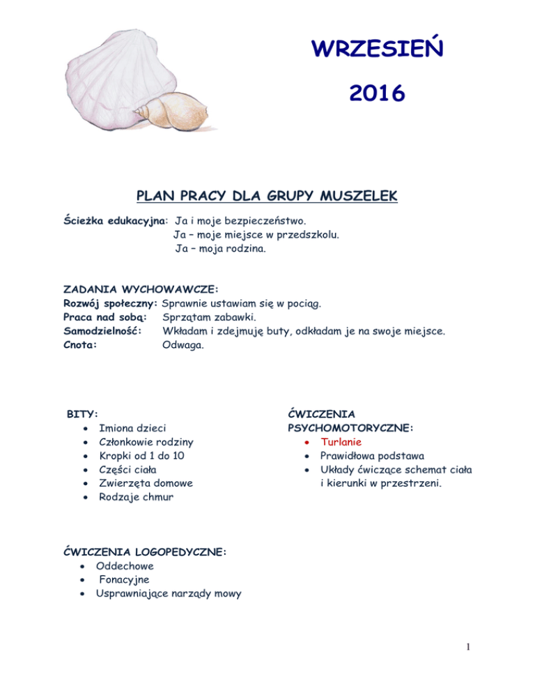 WRZESIEŃ 2016 PLAN PRACY DLA GRUPY MUSZELEK Ścieżka edukacyjna: Ja i moje bezpieczeństwo. Ja – moje miejsce w przedszkolu. Ja – moja rodzina. ZADANIA WYCHOWAWCZE: Rozwój społeczny: Sprawnie ustawiam się w pociąg. Praca nad sobą: Sprzątam zabawki. Samodzielność: Wkładam i zdejmuję buty, odkładam je na swoje miejsce. Cnota: Odwaga. BITY: Imiona dzieci Członkowie rodziny Kropki od 1 do 10 Części ciała Zwierzęta domowe Rodzaje chmur ĆWICZENIA PSYCHOMOTORYCZNE: Turlanie Prawidłowa podstawa Układy ćwiczące schemat ciała i kierunki w przestrzeni. ĆWICZENIA LOGOPEDYCZNE: Oddechowe Fonacyjne Usprawniające narządy mowy 1 WIERSZ : „Mam trzy latka” Irena Suchorzewska Mam trzy latka, dwa i pół, Sięgam główką ponad stół. Do przedszkola chodzę z workiem, Mam fartuszek z muchomorkiem. Pantofelki ładnie zmieniam, Myję ręce do jedzenia. Zjadam wszystko z talerzyka, Tańczę, kiedy gra muzyka. Umiem wierszyk o koteczku, O tchórzliwym koziołeczku, I o piesku, co był w polu, Nauczyłam się w przedszkolu. WIERSZ LOGOPEDYCZNY: Przygoda w lesie Pod lasem w małych chatce, mieszkała mama z ośmiorgiem dzieci, nazywały się: A< O < E< U< I< Y< Ą< Ę. Pewnego razu dzieci poszły na grzyby do lasu, ale nie zabrały ze sobą ani zegarka, ani kompasu – więc zgubiły się i zaczęły rozpaczać: ECH, ECH, ECH, ECH. Ale mama nie traciła nadziei na odnalezienie swoich dzieci, wołała je wiec głośno: A-O, E-U, I-Y, Ą-Ę. Niebawem Dzieci się odnalazły i w rodzinie zapanowała wielka radość: OCH, OCH, OCH. Cieszyły się wszystkie zwierzątka w gospodarstwie: - kotek, który mruczał – MIAŁ, MIAŁ, MIAŁ, MIAŁ - piesek, który szczekał – HAU, HAU, HAU, HAU 2 - koza, która meczała – ME, ME, ME, ME - krowa, która muczała – MU, MU, MU, MU - koń, który rżał – IHA-IHA, IHA-IHA Mama ugotował pyszną kolację, przy której pomogły jej dzieci: CIACH, CIACH, CIACH, MACH, MACH, MACH – MNIAM, MNIAM, MNIAM. Po skończonej kolacji i leśnych przygodach, dzieci szeroko ziewnęły i szybciutko zasnęły: AAAAAAAAAAAAAAAA – CHA PSI, CHA PSI, CHA PSI SIA PIOSENKA: „Jestem sobie przedszkolaczek” (sł. M. Terlikowska, muz. L. Miklaszewski) Jestem sobie przedszkolaczek, Nie grymaszę i nie płaczę, Na bębenku marsza gram, Ram tam tam, ram tam tam. Mamy tu zabawek wiele, Razem bawić się weselej, Bo kolegów dobrych mam, Ram tam tam, ram tam tam. Mamy klocki, kredki, farby, To są nasze wspólne skarby, Bardzo dobrze tutaj nam, Ram tam tam, ram tam tam. Zagadki: Wybrane zagadki Smoka Obiboka Audycje: Wolfgang Amadeusz Mozart – Symfonia nr 40 g-moll cz. I Franciszek Schubert – Pieśń „Polna różyczka” 3 Język angielski: Gry i zabawy integracyjne m.in. 'Who took the cookie from the cookie jar" oraz "Goose, goose, duck" Liczenia w zakresie 5 z wykorzystaniem piosenek m.in "Five Little Speckled Frogs" Five Little Speckled Frogs Sat on a speckled log Eating the most delicious bugs. Yum! Yum! One jumped into the pond Where it was nice and cold Now there are four green speckled frogs Four Little Speckled Frogs Sat on a speckled log.... Three Little Speckled Frogs... Two Little Speckled Frogs... One Little Speckled Frog... 4