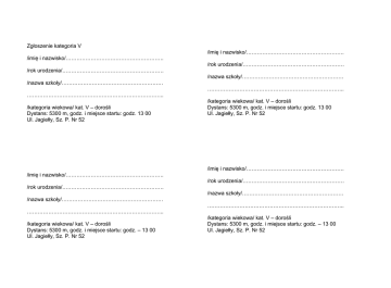 Zgłoszenie kategoria V /imię i nazwisko/………………………………………………. /imię i nazwisko/………………………………………………. /rok urodzenia/………………………………………………… /rok urodzenia/………………………………………………… /nazwa szkoły/………………………………………………… /nazwa szkoły/………………………………………………… ………………………………………………………………….. ………………………………………………………………….. /kategoria wiekowa/ kat. V – dorośli Dystans: 5300 m, godz. i miejsce startu: godz. 13 00 Ul. Jagiełły, Sz. P. Nr 52 /kategoria wiekowa/ kat. V – dorośli Dystans: 5300 m, godz. i miejsce startu: godz. 13 00 Ul. Jagiełły, Sz. P. Nr 52 /imię i nazwisko/………………………………………………. /imię i nazwisko/………………………………………………. /rok urodzenia/………………………………………………… /rok urodzenia/………………………………………………… /nazwa szkoły/………………………………………………… /nazwa szkoły/………………………………………………… ………………………………………………………………….. ………………………………………………………………….. /kategoria wiekowa/ kat. V – dorośli Dystans: 5300 m, godz. i miejsce startu: godz. – 13 00 Ul. Jagiełły, Sz. P. Nr 52 /kategoria wiekowa/ kat. V – dorośli Dystans: 5300 m, godz. i miejsce startu: godz. – 13 00 Ul. Jagiełły, Sz. P. Nr 52