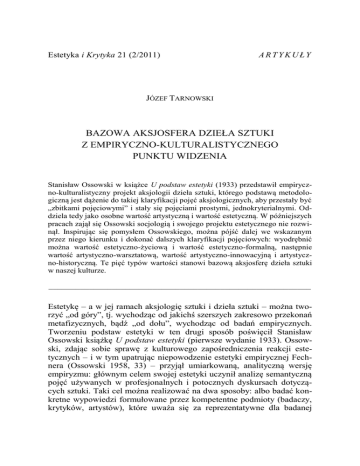 Estetyka i Krytyka 21 (2/2011) ARTYKUŁY JÓZEF TARNOWSKI BAZOWA AKSJOSFERA DZIEŁA SZTUKI Z EMPIRYCZNO-KULTURALISTYCZNEGO PUNKTU WIDZENIA Stanisław Ossowski w książce U podstaw estetyki (1933) przedstawił empiryczno-kulturalistyczny projekt aksjologii dzieła sztuki, którego podstawą metodologiczną jest dążenie do takiej klaryfikacji pojęć aksjologicznych, aby przestały być „zbitkami pojęciowymi” i stały się pojęciami prostymi, jednokryterialnymi. Oddziela tedy jako osobne wartość artystyczną i wartość estetyczną. W późniejszych pracach zajął się Ossowski socjologią i swojego projektu estetycznego nie rozwinął. Inspirując się pomysłem Ossowskiego, można pójść dalej we wskazanym przez niego kierunku i dokonać dalszych klaryfikacji pojęciowych: wyodrębnić można wartość estetyczno-życiową i wartość estetyczno-formalną, następnie wartość artystyczno-warsztatową, wartość artystyczno-innowacyjną i artystyczno-historyczną. Te pięć typów wartości stanowi bazową aksjosferę dzieła sztuki w naszej kulturze. __________________________________________________________ Estetykę – a w jej ramach aksjologię sztuki i dzieła sztuki – można tworzyć „od góry”, tj. wychodząc od jakichś szerszych zakresowo przekonań metafizycznych, bądź „od dołu”, wychodząc od badań empirycznych. Tworzeniu podstaw estetyki w ten drugi sposób poświęcił Stanisław Ossowski książkę U podstaw estetyki (pierwsze wydanie 1933). Ossowski, zdając sobie sprawę z kulturowego zapośredniczenia reakcji estetycznych – i w tym upatrując niepowodzenie estetyki empirycznej Fechnera (Ossowski 1958, 33) – przyjął umiarkowaną, analityczną wersję empiryzmu: głównym celem swojej estetyki uczynił analizę semantyczną pojęć używanych w profesjonalnych i potocznych dyskursach dotyczących sztuki. Taki cel można realizować na dwa sposoby: albo badać konkretne wypowiedzi formułowane przez kompetentne podmioty (badaczy, krytyków, artystów), które uważa się za reprezentatywne dla badanej Józef Tarnowski 152 _______________________________________________________________________________________________________________________________________________________________________________________________________________ świadomości aksjologicznej, albo analizować swoją ogólną wiedzę na ich temat. Ossowski poszedł drugą drogą. Cztery grupy zagadnień postawił w centrum swoich badań: interpretację, ekspresję, reprezentację oraz przeżycia estetyczne w korelacji z wartościowaniem i wartościami dzieła sztuki1. Tu interesuje mnie tylko ostatnia z wymienionych dziedzin. Logicznym punktem wyjścia Ossowskiego jest zagadnienie wartościowania. Przyjęta przezeń metoda dała mu już w punkcie wyjścia ogólne spojrzenie na to zagadnienie. Oto – powiada Ossowski – praktykujemy dwa zasadnicze sposoby wartościowania czegokolwiek: oceniamy albo ze względu na to, jak to powstało, albo ze względu na to, co nam daje. Tak ocenia się wartość towaru w ekonomii, tak ocenia się postępki w prawie karnym, tak ocenia się zasługi ludzi. Tak też ocenia się wartość dzieł sztuki: albo ze względu na to, co nam dają, czyli jakie przeżycia odbiorcze wzbudzają (innymi słowy – jak bardzo się podobają lub nie podobają), albo ze względu na to, jak powstały, tj. jaki ładunek artyzmu zawierają. Diagnoza istniejącej praktyki ocennej odnoszącej się do sztuki jest negatywna: w faktycznych wartościowaniach estetycznych splecione są zazwyczaj owe dwa różne kryteria i to w taki sposób, jakby stanowiły kryterium pojedyncze, w efekcie czego pojęcie wartości estetycznej, które jest korelatem tak rozumianego wartościowania estetycznego, stanowi zbitkę pojęciową, jest pojęciem dwoistym, w którym pomieszane są dwa różne pojęcia wartości ufundowane na dwóch różnych kryteriach oceny. Na podstawie takiej konstatacji Ossowski formułuje program budowy koncepcji aksjologicznej. Celem jest taka klaryfikacja pojęć aksjologicznych, w szczególności pojęć wartości przypisywanych w aktach wartościowania działom sztuki, aby stały się pojęciami jednoistymi, czyli jednokryterialnymi, tzn. aby pojęcie danej wartości miało za swą podstawę jedno kryterium oceny. Następnym krokiem jest nadanie różnym pojęciom osobnych nazw. Fundamentalną ideą Ossowskiego jest rozróżnienie wartościowania estetycznego i wartościowania artystycznego oraz skorelowanych z tymi dwoma typami wartościowania dwóch typów wartości – odpowiednio wartości estetycznej i wartości artystycznej. Gdy wyodrębnimy wyraźnie te dwa rodzaje wartościowania, może się wydać rzeczą niewłaściwą nazywać wartością estetyczną wartość, którą przypisujemy dziełu nie ze względu na przeżycie widza, lecz ze względu na artyzm twórcy, zwłaszcza że jest w obiegu inne, odpowiedniejsze wyrażenie: wartość artystyczna. Nie zmienia to jednak samej sprawy: zamiast mówić o dwóch koncepcjach w a r t o ś c i e s t e t y c z n e j, możemy w dalszym ciągu mówić o dwóch koncepcjach w a r t o ś c i w e s t e t y c e 2. 1 Dokonania Ossowskiego na polu estetyki omówił szczegółowo Bohdan Dziemidok we wstępie do wyboru pism estetycznych Ossowskiego (Dziemidok 2004). 2 S. Ossowski U podstaw estetyki Wiedza Powszechna, Warszawa 1958 s. 285-286. Bazowa aksjosfera dzieła sztuki... 153 _______________________________________________________________________________________________________________________________________________________________________________________________________________ Ossowski dokonał w ten sposób klaryfikacji używanych w praktyce aksjologicznej dwóch pojęć, uwalniając je od skonstatowanej dwoistości, czyli doprowadzając je do postaci – w przekonaniu swoim – jednoistej. Wartościowanie estetyczne ujmuje tedy jako przypisywanie dziełu wartości estetycznej (czyli piękna rozumianego jak