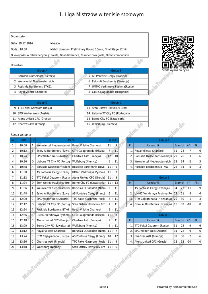 1. Liga Mistrzów w tenisie stołowym Organizator: Data: 29.12.2014 Miejsce: Godz.: 10:00 Match duration: Preliminary Round 10min, Final Stage 12min O kolejności w tabeli decydują: Points, Goal difference, Number own goals, Direct comparison Uczestnik Group A Śledź wyniki na żywo Group B 1 Borussia Dusseldorf (Niemcy) 5 AS Pontoise Cergy (Francja) 2 Weinviertel Niederosterreich 6 Eslov Ai Bordtennis (Szwecja) 3 Roskilde Bordtennis BTK61 7 UMMC Verkhnaya Pyshma(Rosja) 4 Royal Villette Charleroi 8 CTM Cajagranada (Hiszpania) Group C Group D 9 TTC Fakel Gazprom (Rosja) 13 Sten Ostrov Havlickuv Brod 10 SPG Walter Wels (Austria) 14 Lisbona TT City FC (Portugalia 11 Atens United CFC (Grecja) 15 Berno City FC (Szwajcaria) 12 Chartres Astt (Francja) 16 Wolfsburg (Niemcy) Runda Wstępna Nr Godz. Gr 1 10:00 A Weinviertel Niederosterrei Royal Villette Charleroi Mecz 11 : 9 Wynik Group A 2 10:12 B Eslov Ai Bordtennis (Szwe CTM Cajagranada (Hiszpa 7 : 11 1. Royal Villette Charleroi 3 10:24 C SPG Walter Wels (Austria) Chartres Astt (Francja) 4 10:36 D 5 10:48 6 11:00 7 Pl Uczestnik Bramki +/- Pkt. 31 : 24 7 6 12 : 10 2. Borussia Dusseldorf (Niemcy) 29 : 26 3 6 Lisbona TT City FC (Portug Wolfsburg (Niemcy) 5 : 11 3. Weinviertel Niederosterreich 32 : 34 -2 3 A Borussia Dusseldorf (Niem Roskilde Bordtennis BTK6 11 : 6 4. Roskilde Bordtennis BTK61 26 : 34 -8 3 B AS Pontoise Cergy (Francj 11:12 C TTC Fakel Gazprom (Rosja Atens United CFC (Grecja) 11 : 3 8 11:24 D Sten Ostrov Havlickuv Bro Berno City FC (Szwajcaria) 11 : 13 Bramki +/- 9 11:36 A Weinviertel Niederosterrei Borussia Dusseldorf (Niem 9 : 11 1. AS Pontoise Cergy (Francja) 34 : 23 11 9 10 11:48 B Eslov Ai Bordtennis (Szwe AS Pontoise Cergy (Francj 6 : 11 2. UMMC Verkhnaya Pyshma(Ro 29 : 21 8 6 11 12:00 C SPG Walter Wels (Austria) TTC Fakel Gazprom (Rosja 8 : 11 3. CTM Cajagranada (Hiszpania) 29 : 30 -1 3 12 12:12 D Lisbona TT City FC (Portug Sten Ostrov Havlickuv Bro 7 : 11 4. Eslov Ai Bordtennis (Szwecja) 15 : 33 -18 0 13 12:24 A Roskilde Bordtennis BTK6 6 : 11 14 12:36 B UMMC Verkhnaya Pyshma CTM Cajagranada (Hiszpa 11 : 8 15 12:48 C Atens United CFC (Grecja) Chartres Astt (Francja) 9 : 11 16 13:00 D Berno City FC (Szwajcaria) Wolfsburg (Niemcy) 2 : 11 17 13:12 A Royal Villette Charleroi 18 13:24 B CTM Cajagranada (Hiszpa 19 13:36 C Chartres Astt (Francja) TTC Fakel Gazprom (Rosja 11 : 9 20 13:48 D Wolfsburg (Niemcy) Sten Ostrov Havlickuv Bro 11 : 6 UMMC Verkhnaya Pyshma 11 : 7 Royal Villette Charleroi Group B Pl Uczestnik Pkt. Group C Bramki +/- 1. TTC Fakel Gazprom (Rosja) 31 : 22 9 6 Borussia Dusseldorf (Niem 11 : 7 2. SPG Walter Wels (Austria) 31 : 22 9 6 AS Pontoise Cergy (Francj 3. Chartres Astt (Francja) 32 : 30 2 6 4. Atens United CFC (Grecja) 13 : 33 -20 0 10 : 12 Seite 1 Pl Uczestnik Pkt. Powered by MeinTurnierplan.de 1. Liga Mistrzów w tenisie stołowym 21 14:00 A Roskilde Bordtennis BTK6 Weinviertel Niederosterrei 14 : 12 22 14:12 B UMMC Verkhnaya Pyshma Eslov Ai Bordtennis (Szwe 11 : 2 23 14:24 C Atens United CFC (Grecja) SPG Walter Wels (Austria) 1 : 11 24 14:36 D Berno City FC (Szwajcaria) Lisbona TT City FC (Portug 13 : 11 Seite 2 Group D Pl Uczestnik Bramki +/- Pkt. 1. Wolfsburg (Niemcy) 33 : 13 20 9 2. Berno City FC (Szwajcaria) 28 : 33 -5 6 3. Sten Ostrov Havlickuv Brod 28 : 31 -3 3 4. Lisbona TT City FC (Portugali 23 : 35 -12 0 Powered by MeinTurnierplan.de 1. Liga Mistrzów w tenisie stołowym Runda Finałowa Nr Runda Finałowa Beginn Mecz Wynik Ćwierćfinał 1 25 14:56 1. Group A 2. Group B Royal Villette Charleroi UMMC Verkhnaya Pysh 26 15:10 1. Group B Borussia Dusseldorf (Nie AS Pontoise Cergy (Fran Pl Uczestnik 1. 11 : 7 Ćwierćfinał 2 2. Group A k. p.d. 2. 3. 4. 11 : 8 Ćwierćfinał 3 27 15:24 1. Group C 2. Group D TTC Fakel Gazprom (Ros Berno City FC (Szwajcari : Ćwierćfinał 4 28 15:38 2. Group C 1. Group D SPG Walter Wels (Austri Wolfsburg (Niemcy) : Półfinał 1 29 15:52 Zwycięzca ĆF1 Zwycięzca ĆF3 Royal Villette Charleroi spielfrei : Półfinał 2 30 16:06 Zwycięzca ĆF2 Zwycięzca ĆF4 Borussia Dusseldorf (Nie spielfrei : Mecz o miejsce 3 31 16:20 Przegrany PF1 Przegrany PF2 : Finał 32 16:34 Zwycięzca PF1 Zwycięzca PF2 : Seite 3 Powered by MeinTurnierplan.de