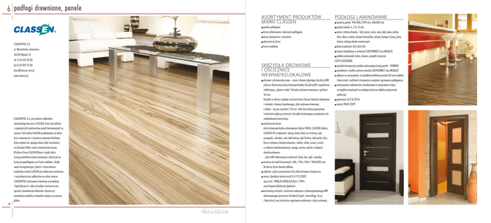 6 podłogi drewniane, panele ASORTYMENT PRODUKTÓW MARKI CLASSEN CLASSEN-POL S.A. ul. Wyzwolenia, Zwonowice panele podłogowe listwy okleinowane i akcesoria podłogowe drzwi wewnętrzne i ościeżnice akcesoria do drzwi fronty meblowe 44-292 Rybnik 13 tel. 0 32 429 20 00 www.classen.pl SKRZYDŁA DRZWIOWE I OŚCIEŻNICE WEWNĄTRZLOKALOWE CLASSEN-POL S.A. jest polskim oddziałem niemieckiego koncernu CLASSEN, który jest jednym z największych producentów paneli laminowanych na świecie. Pod marką CLASSEN produkowane są także drzwi wewnętrzne i ościeżnice wewnątrzlokalowe, które wybiera do swojego domu bądź mieszkania co dziesiąty Polak i wielu mieszkańców Europy. W ofercie firmy CLASSEN Klienci znajdą także szereg produktów wykończeniowych, takich jak np. listwy przypodłogowe czy fronty meblowe. Dzięki swoim kompetencjom, jakości i różnorodności produktów marka CLASSEN jest obdarzana zaufaniem i szacunkiem przez odbiorców na całym świecie. CLASSEN-POL intensywnie inwestuje w produkcję i logistykę po to, żeby w każdym momencie móc sprostać zamówieniom Klientów i dostarczyć zamówione produkty w dowolne miejsce na naszym globie. płytowe i płytowo-płycinowe – rama z drewna iglastego lub płyty MDF, pokryta obustronnie płytą drewnopochodną lub płytą HDF, wypełnienie stabilizujące „plaster miodu” lub płyta wiórowa otworowa o grubości 34 mm. Ponadto w ofercie znajduje się konstrukcja Classen hybryda zbudowana z ramiaka z drewna świerkowego, płyty wiórowo-otworowej i sklejki – łączna szerokość 118 mm. Taka konstrukcja gwarantuje trzykrotnie większą sztywność skrzydła drzwiowego w porównaniu do standardowych konstrukcji. wykończenie drzwi: płyta drewnopochodna okleinowana foliami FINISH, CLASSEN Iridium, CLASSEN CPL w dekorach: akacja, biały, biały ze strukturą, buk europejski, calvados, cedr, dąb bielony, dąb fineline, dąb polski, klon, klon o usłojeniu dwukierunkowym, mahoń, olcha, orzech, orzech o usłojeniu dwukierunkowym, wenge, wiśnia, wiśnia o usłojeniu dwukierunkowym – płyta HDF lakierowana w kolorach: biały, buk, dąb i calvados wymiary skrzydeł drzwiowych: 644 / 744 / 844 / 944x2035 mm. W ofercie drzwi dwuskrzydłowe. szklenie: szyba ornamentowa lub szkło hartowane bezpieczne normy: Aprobata techniczna AT-15-7172/2007, spec.tech.: PN88/B-10085/A2/Az3 z 1998 r. oraz Krajowe Deklaracje Zgodności konstrukcja ościeżnic: ościeżnice wykonane z drewnopochodnego MDF okleinowanego (ościeżnice Standard 2-pack, Camouflage, Arcus i New Arcus) oraz ościeżnice regulowane wykonane z płyty wiórowej. fax 0 32 429 22 00 [email protected] 74 PODŁOGI LAMINOWANE wymiary paneli: 194x1286/1290 mm, 605x282 mm grubość paneli: 6, 7, 8, 12 mm wzory: imitacja drewna – buk, jesion, sosna, wiąz, dąb, jawor, wiśnia, klon, hikora, mahoń, drzewo tasmańskie, afzelia, kempas, brzoza, pinia, listone; imitacja płytek ceramicznych klasy ścieralności: AC3, AC4, AC5 montaż bezklejowy w systemach EASYCONNECT oraz MEGALOC podłoże pod panele: beton, drewno, posadzki żywiczne cechy szczególne: specjalna kompozycja wosków pokrywająca brzegi paneli – ISOWAXX sprawdzone i szybkie systemy montażu EASYCONNECT oraz MEGALOC odporna na zarysowanie, na szkodliwe działanie promieni UV oraz środków chemicznych, możliwość stosowania na wodnym ogrzewaniu podłogowym zastosowanie: budownictwo mieszkaniowe (z wyłączeniem miejsc szczególnie narażonych na zawilgocenie) oraz obiekty użyteczności publicznej gwarancja: od 2 do 30 lat normy: PN-EN 13329