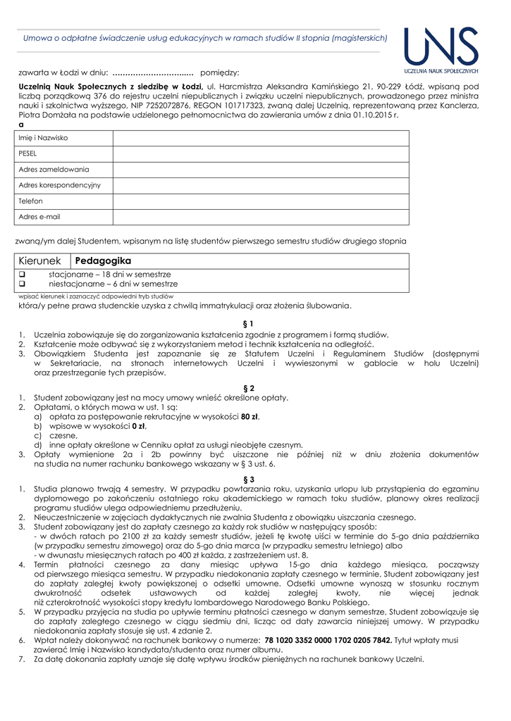 Umowa o odpłatne świadczenie usług edukacyjnych w ramach studiów II stopnia (magisterskich) zawarta w Łodzi w dniu: ………………………..… pomiędzy: Uczelnią Nauk Społecznych z siedzibę w Łodzi, ul. Harcmistrza Aleksandra Kamińskiego 21, 90-229 Łódź, wpisaną pod liczbą porządkową 376 do rejestru uczelni niepublicznych i związku uczelni niepublicznych, prowadzonego przez ministra nauki i szkolnictwa wyższego, NIP 7252072876, REGON 101717323, zwaną dalej Uczelnią, reprezentowaną przez Kanclerza, Piotra Domżała na podstawie udzielonego pełnomocnictwa do zawierania umów z dnia 01.10.2015 r. a Imię i Nazwisko PESEL Adres zameldowania Adres korespondencyjny Telefon Adres e-mail zwaną/ym dalej Studentem, wpisanym na listę studentów pierwszego semestru studiów drugiego stopnia Kierunek Pedagogika stacjonarne – 18 dni w semestrze niestacjonarne – 6 dni w semestrze wpisać kierunek i zaznaczyć odpowiedni tryb studiów która/y pełne prawa studenckie uzyska z chwilą immatrykulacji oraz złożenia ślubowania. 1. 2. 3. 1. 2. 3. 1. 2. 3. 4. 5. 6. 7. §1 Uczelnia zobowiązuje się do zorganizowania kształcenia zgodnie z programem i formą studiów. Kształcenie może odbywać się z wykorzystaniem metod i technik kształcenia na odległość. Obowiązkiem Studenta jest zapoznanie się ze Statutem Uczelni i Regulaminem Studiów (dostępnymi w Sekretariacie, na stronach internetowych Uczelni i wywieszonymi w gablocie w holu Uczelni) oraz przestrzeganie tych przepisów. §2 Student zobowiązany jest na mocy umowy wnieść określone opłaty. Opłatami, o których mowa w ust. 1 są: a) opłata za postępowanie rekrutacyjne w wysokości 80 zł, b) wpisowe w wysokości 0 zł, c) czesne, d) inne opłaty określone w Cenniku opłat za usługi nieobjęte czesnym. Opłaty wymienione 2a i 2b powinny być uiszczone nie później na studia na numer rachunku bankowego wskazany w § 3 ust. 6. niż w dniu złożenia dokumentów §3 Studia planowo trwają 4 semestry. W przypadku powtarzania roku, uzyskania urlopu lub przystąpienia do egzaminu dyplomowego po zakończeniu ostatniego roku akademickiego w ramach toku studiów, planowy okres realizacji programu studiów ulega odpowiedniemu przedłużeniu. Nieuczestniczenie w zajęciach dydaktycznych nie zwalnia Studenta z obowiązku uiszczania czesnego. Student zobowiązany jest do zapłaty czesnego za każdy rok studiów w następujący sposób: - w dwóch ratach po 2100 zł za każdy semestr studiów, jeżeli tę kwotę uiści w terminie do 5-go dnia października (w przypadku semestru zimowego) oraz do 5-go dnia marca (w przypadku semestru letniego) albo - w dwunastu miesięcznych ratach po 400 zł każda, z zastrzeżeniem ust. 8. Termin płatności czesnego za dany miesiąc upływa 15-go dnia każdego miesiąca, począwszy od pierwszego miesiąca semestru. W przypadku niedokonania zapłaty czesnego w terminie, Student zobowiązany jest do zapłaty zaległej kwoty powiększonej o odsetki umowne. Odsetki umowne wynoszą w stosunku rocznym dwukrotność odsetek ustawowych od każdej zaległej kwoty, nie więcej jednak niż czterokrotność wysokości stopy kredytu lombardowego Narodowego Banku Polskiego. W przypadku przyjęcia na studia po upływie terminu płatności czesnego w danym semestrze, Student zobowiązuje się do zapłaty zaległego czesnego w ciągu siedmiu dni, licząc od daty zawarcia niniejszej umowy. W przypadku niedokonania zapłaty stosuje się ust. 4 zdanie 2. Wpłat należy dokonywać na rachunek bankowy o numerze: 78 1020 3352 0000 1702 0205 7842. Tytuł wpłaty musi zawierać Imię i Nazwisko kandydata/studenta oraz numer albumu. Za datę dokonania zapłaty uznaje się datę wpływu środków pieniężnych na rachunek bankowy Uczelni. 8. 1. 2. 3. 4. 5. 6. 1. 2. 1. 2. Student może zapłacić ratę czesnego za dany miesiąc: - w wysokości 350 zł, pod warunkiem jej wpłaty do 5-go dnia miesiąca. §4 Strony umowy zgodnie postanawiają, że Uczelnia może dokonać, nie później niż na 14 dni przed rozpoczęciem kolejnego semestru, zmiany wysokości czesnego (waloryzacja umowna), przy czym każda zmiana wysokości czesnego nie może przekroczyć kwoty uzyskanej z przemnożenia wysokości czesnego wskazanej w § 3 ust. 3 i 8 przez wskaźnik inflacji za ubiegły rok liczony do miesiąca poprzedzającego zmianę wysokości czesnego ogłaszany przez Prezesa Głównego Urzędu Statystycznego powiększony o 10 % wysokości czesnego wskazanej w § 3 ust. 3 i 8. Zmiana wysokości czesnego wymaga wydania stosownego Zarządzenia Kanclerza Uczelni, przekazania jego treści Studentowi co najmniej na podany przez Studenta adres poczty elektronicznej oraz ogłoszenia treści Zarządzenia w gablocie w holu Uczelni, z zastrzeżeniem ust.2. Student, który nie wyraża zgody na zmianę czesnego, ma prawo w ciągu 7 dni od powzięcia wiadomości o zmianie wysokości czesnego rozwiązać niniejszą umowę. W takim przypadku umowa rozwiązuje się z ostatnim dniem semestru poprzedzającego nowy semestr, którego dotyczy zmiana wysokości czesnego. Oświadczenie Studenta o rozwiązaniu umowy powinno być złożone w formie pisemnej w Sekretariacie Uczelni. W przypadku niezachowania przez Studenta formy oraz terminu złożenia oświadczenia o rozwiązaniu umowy przyjmuje się, że Student wyraża zgodę na zmianę wysokości czesnego. Uczelnia może dokonać w oznaczonym okresie obniżenia wysokości czesnego określonego w § 3 ust. 3 i 8. Obniżenie wysokości czesnego dokonane będzie na podstawie Zarządzenia Kanclerza Uczelni, przekazania jego treści Studentowi co najmniej na podany przez Studenta adres poczty elektronicznej oraz ogłoszenia treści Zarządzenia w gablocie w holu Uczelni, co będzie skutkować zmianą treści umowy bez potrzeby podpisania aneksu. W przypadku zwiększania innych opłat, o których stanowi § 2 ust. 2 lit. d umowy, stosuje się ust. 1 i 2 powyżej, z tym że podstawą przemnożenia jes
