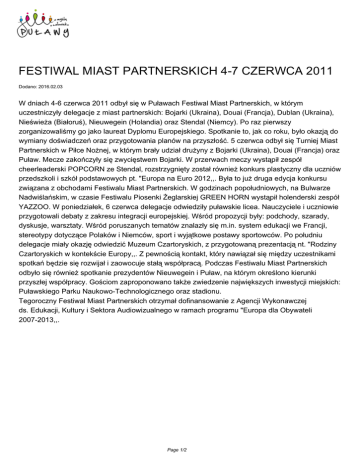 FESTIWAL MIAST PARTNERSKICH 4-7 CZERWCA 2011 Dodano: 2016.02.03 W dniach 4-6 czerwca 2011 odbył się w Puławach Festiwal Miast Partnerskich, w którym uczestniczyły delegacje z miast partnerskich: Bojarki (Ukraina), Douai (Francja), Dublan (Ukraina), Nieświeża (Białoruś), Nieuwegein (Holandia) oraz Stendal (Niemcy). Po raz pierwszy zorganizowaliśmy go jako laureat Dyplomu Europejskiego. Spotkanie to, jak co roku, było okazją do wymiany doświadczeń oraz przygotowania planów na przyszłość. 5 czerwca odbył się Turniej Miast Partnerskich w Piłce Nożnej, w którym brały udział drużyny z Bojarki (Ukraina), Douai (Francja) oraz Puław. Mecze zakończyły się zwycięstwem Bojarki. W przerwach meczy wystąpił zespół cheerleaderski POPCORN ze Stendal, rozstrzygnięty został również konkurs plastyczny dla uczniów przedszkoli i szkół podstawowych pt. "Europa na Euro 2012,,. Była to już druga edycja konkursu związana z obchodami Festiwalu Miast Partnerskich. W godzinach popołudniowych, na Bulwarze Nadwiślańskim, w czasie Festiwalu Piosenki Żeglarskiej GREEN HORN wystąpił holenderski zespół YAZZOO. W poniedziałek, 6 czerwca delegacje odwiedziły puławskie licea. Nauczyciele i uczniowie przygotowali debaty z zakresu integracji europejskiej. Wśród propozycji były: podchody, szarady, dyskusje, warsztaty. Wśród poruszanych tematów znalazły się m.in. system edukacji we Francji, stereotypy dotyczące Polaków i Niemców, sport i wyjątkowe postawy sportowców. Po południu delegacje miały okazję odwiedzić Muzeum Czartoryskich, z przygotowaną prezentacją nt. "Rodziny Czartoryskich w kontekście Europy,,. Z pewnością kontakt, który nawiązał się między uczestnikami spotkań będzie się rozwijał i zaowocuje stałą współpracą. Podczas Festiwalu Miast Partnerskich odbyło się również spotkanie prezydentów Nieuwegein i Puław, na którym określono kierunki przyszłej współpracy. Gościom zaproponowano także zwiedzenie największych inwestycji miejskich: Puławskiego Parku Naukowo-Technologicznego oraz stadionu. Tegoroczny Festiwal Miast Partnerskich otrzymał dofinansowanie z Agencji Wykonawczej ds. Edukacji, Kultury i Sektora Audiowizualnego w ramach programu "Europa dla Obywateli 2007-2013,,. Page 1/2 Źródło: Page 2/2