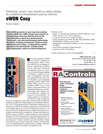 Efektywny, prosty i tani sposób na zdalny dostęp do urządzeń przemysłowych poprzez Internet eWON Cosy Mirosław Majewski Firma eWON wprowadza na rynek nową linię produktów o nazwie eWON Cosy. eWON, którego nazwa wywodzi się od angielskiego zwrotu Eyes Watching Over the Net, jest producentem urządzeń oraz oprogramowania i związanych z nim usług umożliwiających zdalny dostęp do maszyn i instalacji przemysłowych. Główna siedziba zlokalizowana jest w Belgii, a zasięg globalny uzyskany jest poprzez sieć dystrybutorów. Produkty cechuje duża innowacyjność, jakość oraz łatwość konfiguracji. Wybrane cechy: zz oparte na sprawdzonej platformie eWON 2005CD (1 port WAN, 4 porty LAN, 1 port szeregowy); zz 1 wejście cyfrowe oraz 1 wyjście cyfrowe; zz diody sygnalizacyjne PWR, DI, DO, SER, MODEM, USER; zz konfiguracja za pomocą strony Web; zz przemysłowe wykonanie (zasilanie 24 V DC, montaż na szynie DIN); zz przemysłowe protokoły komunikacyjne; zz„przezroczystość” komunikacji. Więcej informacji na stronie: www.ewon.biz. RAControls Sp. z o.o. Autoryzowany Dystrybutor eWON tel. 32-788 77 28 fax 32-788 77 10 e-mail: [email protected] N owa linia produktów eWON Cosy stanowi uzupełnienie dotychczasowej oferty routerów eWON CD, posiadających bardzo rozbudowane możliwości, jak: logowanie zmiennych, wizualizacja oparta na serwerze web umożliwiająca podgląd i interakcję z obiektem za pomocą przeglądarki internetowej, programowanie przy użyciu skryptów czy też opcjonalne modemy PSTN, ISDN, GSM (GPRS, EDGE, 3G). Przy czym produkty eWON Cosy to urządzenia o prostszej budowie, minimalnej konfiguracji, w bardzo atrakcyjnej cenie, dedykowane do uzyskiwania zdalnego połączenia do sterowników i instalacji poprzez LAN Internet. Sterownik zostaje podłączony do portu szeregowego bądź portu ethernetowego urządzenia, natomiast urządzenie zostaje podłączone do Internetu poprzez sieć LAN. Po przeprowadzeniu minimalnej konfiguracji uzyskiwana jest możliwość zdalnego połączenia ze sterownikiem z dowolnego miejsca na świecie z dostępem do Internetu w celach serwisowych, diagnostycznych, monitorowania pracy oraz przeprowadzania zmian w programie. Dostęp uzyskiwany jest poprzez serwery Talk2M z wykorzystaniem szyfrowanego połączenia VPN. Rozwiązanie takie eliminuje konieczność montowania stosowanych dotychczas modemów telefonicznych, zapewniając dużo większy komfort i pewność działania. Dzięki temu możliwe jest znaczące obniżenie kosztów uruchamiania i serwisu instalacji poprzez ograniczenie wyjazdów. Znacząco można też skrócić czas reakcji w przypadku awarii. n reklama Nr 11 l Listopad 2011 r. l 93