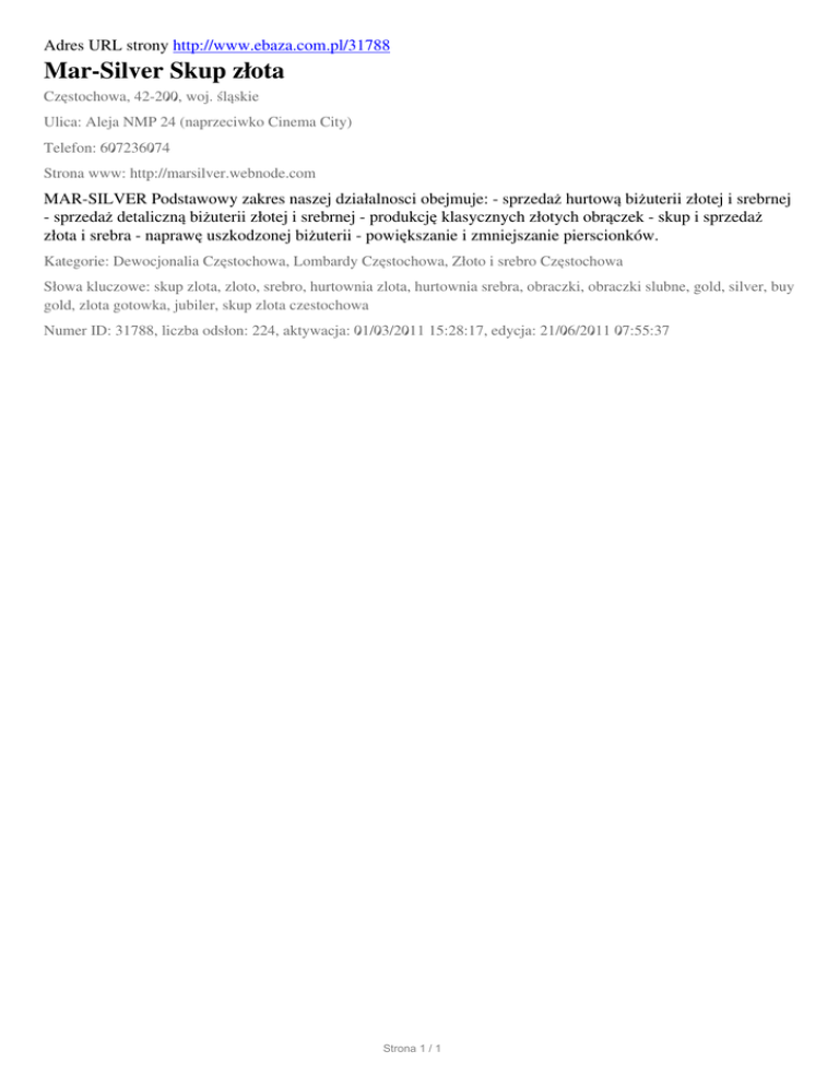 Mar-Silver Skup zlota, Czestochowa, Aleja NMP 24