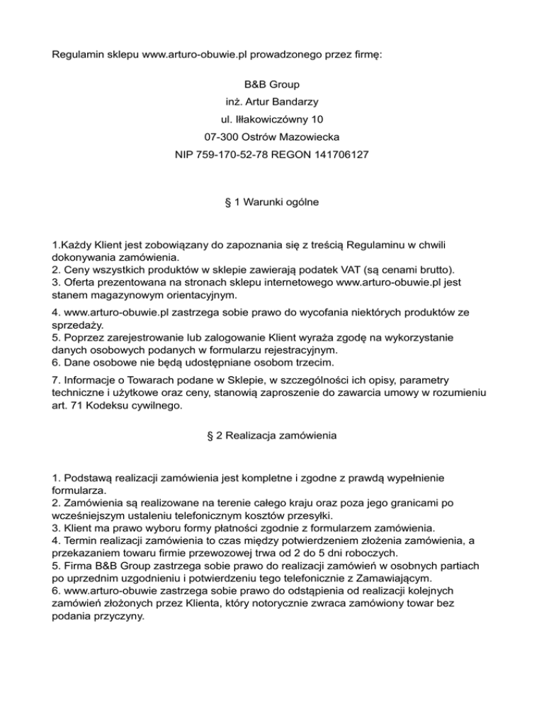Regulamin sklepu www.arturo-obuwie.pl prowadzonego przez firmę: B&B Group inż. Artur Bandarzy ul. Iłłakowiczówny 10 07-300 Ostrów Mazowiecka NIP 759-170-52-78 REGON 141706127 § 1 Warunki ogólne 1.Każdy Klient jest zobowiązany do zapoznania się z treścią Regulaminu w chwili dokonywania zamówienia. 2. Ceny wszystkich produktów w sklepie zawierają podatek VAT (są cenami brutto). 3. Oferta prezentowana na stronach sklepu internetowego www.arturo-obuwie.pl jest stanem magazynowym orientacyjnym. 4. www.arturo-obuwie.pl zastrzega sobie prawo do wycofania niektórych produktów ze sprzedaży. 5. Poprzez zarejestrowanie lub zalogowanie Klient wyraża zgodę na wykorzystanie danych osobowych podanych w formularzu rejestracyjnym. 6. Dane osobowe nie będą udostępniane osobom trzecim. 7. Informacje o Towarach podane w Sklepie, w szczególności ich opisy, parametry techniczne i użytkowe oraz ceny, stanowią zaproszenie do zawarcia umowy w rozumieniu art. 71 Kodeksu cywilnego. § 2 Realizacja zamówienia 1. Podstawą realizacji zamówienia jest kompletne i zgodne z prawdą wypełnienie formularza. 2. Zamówienia są realizowane na terenie całego kraju oraz poza jego granicami po wcześniejszym ustaleniu telefonicznym kosztów przesyłki. 3. Klient ma prawo wyboru formy płatności zgodnie z formularzem zamówienia. 4. Termin realizacji zamówienia to czas między potwierdzeniem złożenia zamówienia, a przekazaniem towaru firmie przewozowej trwa od 2 do 5 dni roboczych. 5. Firma B&B Group zastrzega sobie prawo do realizacji zamówień w osobnych partiach po uprzednim uzgodnieniu i potwierdzeniu tego telefonicznie z Zamawiającym. 6. www.arturo-obuwie zastrzega sobie prawo do odstąpienia od realizacji kolejnych zamówień złożonych przez Klienta, który notorycznie zwraca zamówiony towar bez podania przyczyny. § 3 Rodzaje płatności Proponuje cztery wygodne formy opłaty za złożone zamówienie: 1. Płatność za pobraniem - przy odbiorze przesyłki, 2. Przedpłata na konto - dokonana bezpośrednio po złożeniu zamówienia; 3. Płatność poprzez system płatności – dokonana w trakcie składania zamówienia; 4. Płatność w kasie przy odbiorze osobistym. Płatność za pobraniem Zapłata za zamówiony towar następuje przy odbiorze paczki. Jeżeli paczka została wysłana za pośrednictwem Poczty Polskiej, należy za nią zapłacić listonoszowi przy odbiorze. Natomiast w przypadku przesyłki kurierskiej, opłatę za zamówienie należy uiścić kurierowi podczas dostarczenia przesyłki. Kwota, którą należy zapłacić to suma wartości złożonego zamówienia oraz kosztu przesyłki. Kwotę tę można znaleźć na samym końcu podsumowania zamówienia jak i na kopii zamówienia, jakie otrzymają Państwo na swój adres e-mail po jego złożeniu. Przedpłata na konto Wygodną i szybką formą płatności jest przedpłata na konto. W tym przypadku należy wpłacić całą kwotę wartości zamówienia, łącznie z kosztami wysyłki, na konto www.arturoobuwie.pl wskazane w przesłanym Państwu potwierdzeniu zamówienia. W tytule przelewu prosimy o podanie wszystkich numerów zamówień, za które płatność jest regulowana. Od chwili odnotowania wpłaty, zamówienie zostanie przekazane do realizacji. Nasz numer konta: Bank Spółdzielczy w Ostrowi Mazowieckiej 87 89230008 0029 2160 2000 0001 W przypadku, gdy wpłata za złożone zamówienie nie zostanie odnotowana w ciągu 7 dni od daty jego złożenia, nasz system automatycznie wyśle przypomnienie o dokonaniu wpłaty. Zamówienie zostanie ostatecznie usunięte, gdy wpłata na koncie www.arturoobuwie.pl nie zostanie odnotowana w ciągu 14 dni. Płatność poprzez system platnosci internetowych Przy wyborze tej formy płatności w trakcie składania zamówienia na www.arturo-obuwie.pl, zostaną Państwo automatycznie przekierowani na stronę płatności internetowych w celu sfinalizowania transakcji. W systemie można płacić kartą kredytową jak i za pomocą przelewu z konta internetowego. Powyższa forma płatności jest w pełni bezpieczna, gdyż wymiana informacji pomiędzy sklepem a serwisem jest szyfrowana w oparciu o technologię SSL. Informacje docierają do banku w sposób w pełni bezpieczny i nie są narażone na kradzież. W przypadku nieudanej autoryzacji, prosimy o kontakt telefoniczny z Biurem Obsługi Klienta w celu dokonania zmiany formy płatności. Płatności online, kartami płatniczymi i kredytowymi realizowane są przez: karty płatnicze: PayPro SA Agent Rozliczeniowy, ul. Kanclerska 15, 60-327 Poznań, wpisany do Rejestru Przedsiębiorców Krajowego Rejestru Sądowego prowadzonego przez Sąd Rejonowy Poznań Nowe Miasto i Wilda w Poznaniu, VIII Wydział Gospodarczy Krajowego Rejestru Sądowego pod numerem KRS 0000347935, NIP 7792369887, Regon 301345068. płatności online: Przelewy24.pl DialCom24 Sp. z o.o. ul. Kanclerska 15, 60-327 Poznań oraz: PayU.pl – spółka PayU S.A. z siedzibą w Poznaniu (adres siedziby: ul. Grunwaldzka 182, 60-166 Poznań), wpisana do Rejestru Przedsiębiorców Krajowego Rejestru Sądowego pod numerem 0000274399, akta rejestrowe przechowywane przez Sąd Rejonowy Poznań – Nowe Miasto i Wilda w Poznaniu, kapitał zakładowy w wysokości 4.000.000 zł w całości opłacony, NIP: 779-23-08-495. § 4 Zwroty i reklamacje 1. Konsument może odstąpić od Umowy sprzedaży Towarów zawartej na odległość bez podania przyczyny, składając stosowne oświadczenie na piśmie, w terminie 14 (czternastu) dni od wydania Konsumentowi Towaru. Do zachowania terminu wystarczy wysłanie stosownego oświadczenia przed jego upływem na następujący adres Usługodawcy: B&B Group inż. Artur Bandarzy; Oficerska 15; 07-310 Ostrów Mazowiecka 2. W przypadku zwrotu towaru związanego ze zgłoszeniem niezgodności towaru z umową, odstąpieniem od umowy bądź wymianą pełnowartościowego towaru na inny na zasadach określonych w Regulaminie sklepu, bardzo prosimy o: •zwrócenie tow