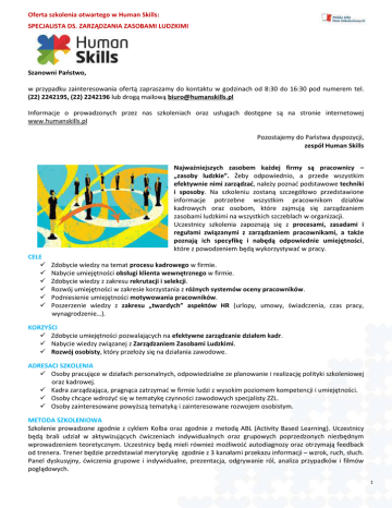 Oferta szkolenia otwartego w Human Skills: SPECJALISTA DS. ZARZĄDZANIA ZASOBAMI LUDZKIMI Szanowni Państwo, w przypadku zainteresowania ofertą zapraszamy do kontaktu w godzinach od 8:30 do 16:30 pod numerem tel. (22) 2242195, (22) 2242196 lub drogą mailową [email protected] Informacje o prowadzonych przez nas szkoleniach oraz usługach dostępne są na stronie internetowej www.humanskills.pl Pozostajemy do Państwa dyspozycji, zespół Human Skills Najważniejszych zasobem każdej firmy są pracownicy – „zasoby ludzkie”. Żeby odpowiednio, a przede wszystkim efektywnie nimi zarządzać, należy poznać podstawowe techniki i sposoby. Na szkoleniu zostaną szczegółowo przedstawione informacje potrzebne wszystkim pracownikom działów kadrowych oraz osobom, które zajmują się zarządzaniem zasobami ludzkimi na wszystkich szczeblach w organizacji. Uczestnicy szkolenia zapoznają się z procesami, zasadami i regułami związanymi z zarządzaniem pracownikami, a także poznają ich specyfikę i nabędą odpowiednie umiejętności, które z powodzeniem będą wykorzystywać w pracy. CELE Zdobycie wiedzy na temat procesu kadrowego w firmie. Nabycie umiejętności obsługi klienta wewnętrznego w firmie. Zdobycie wiedzy z zakresu rekrutacji i selekcji. Rozwój umiejętności w zakresie korzystania z różnych systemów oceny pracowników. Podniesienie umiejętności motywowania pracowników. Poszerzenie wiedzy z zakresu „twardych” aspektów HR (urlopy, umowy, świadczenia, czas pracy, wynagrodzenie…). KORZYŚCI Zdobycie umiejętności pozwalających na efektywne zarządzanie działem kadr. Nabycie wiedzy związanej z Zarządzaniem Zasobami Ludzkimi. Rozwój osobisty, który przełoży się na działania zawodowe. ADRESACI SZKOLENIA Osoby pracujące w działach personalnych, odpowiedzialne ze planowanie i realizację polityki szkoleniowej oraz kadrowej. Kadra zarządzająca, pragnąca zatrzymać w firmie ludzi z wysokim poziomem kompetencji i umiejętności. Osoby chcące wdrożyć się w tematykę czynności zawodowych specjalisty ZZL. Osoby zainteresowane powyższą tematyką i zainteresowane rozwojem osobistym. METODA SZKOLENIOWA Szkolenie prowadzone zgodnie z cyklem Kolba oraz zgodnie z metodą ABL (Activity Based Learning). Uczestnicy będą brali udział w aktywizujących ćwiczeniach indywidualnych oraz grupowych poprzedzonych niezbędnym wprowadzeniem teoretycznym. Uczestnicy będą mieli również możliwość autodiagnozy oraz otrzymają feedback od trenera. Trener będzie przedstawiał merytorykę zgodnie z 3 kanałami przekazu informacji – wzrok, ruch, słuch. Panel dyskusyjny, ćwiczenia grupowe i indywidualne, prezentacja, odgrywanie ról, analiza przypadków i filmów poglądowych. 1 Oferta szkolenia otwartego w Human Skills: SPECJALISTA DS. ZARZĄDZANIA ZASOBAMI LUDZKIMI PROGRAM SZKOLENIA DZIEŃ I 09:00 – 09:30 Rozpoczęcie szkolenia. Wstęp - omówienie celów szkolenia oraz potrzeb uczestników. 09:30 – 12:30 PROCES KADROWY 1. Model procesu kadrowego w firmie, 2. Modele działu personalnego w zależności od etapu rozwoju firmy, 3. Praktyczne problemy funkcjonowania działu HR w nowoczesnej organizacji, 4. Wpływ HR na biznes. ZARZĄDZANIE PERSONELEM A MARKETING WEWNĘTRZNY 1. Rola usługowa działu personalnego wobec klienta wewnętrznego czyli pracownika, 2. Tworzenie wartości poprzez wysoką jakość obsługi klienta wewnętrznego, 3. Profil idealnego pracownika działu HR w firmie. 12:30 – 13:10 Przerwa na obiad 13:10 – 15:00 OGÓLNE WARUNKI DOTYCZĄCE ZATRUDNIANIA I ZWALNIANIA PRACOWNIKÓW SPORZĄDZANIE UMÓW O PRACĘ I PRZYJMOWANIE DO PRACY WYNAGRODZENIE ZA PRACĘ I INNE ŚWIADCZENIA OBOWIĄZKI PRACODAWCY I PRACOWNIKA ASPEKTY DOTYCZĄCE CZASU PRACY URLOPY PRACOWNICZE (WYPOCZYNKOWE, BEZPŁATNE, RODZICIELSKIE) PODSUMOWANIE I PYTANIA 15:30 – 16:00 Podsumowanie i zakończenie pierwszego szkolenia. DZIEŃ II 09:00 – 09:30 Rozpoczęcie szkolenia. Wstęp - omówienie celów szkolenia oraz potrzeb uczestników. 09:30 – 12:30 PROCES REKRUTACJI I SELEKCJI 1. Opis stanowiska pracy, 2. Ogłoszenie rekrutacyjne+model idealnego kandydata, 3. Proces selekcji, 4. Wybrane błędy najczęściej popełniane w trakcie procesu rekrutacji i selekcji, 5. Kwestie etyczne procesu rekrutacji, 6. Omówienie procedury rekrutacji i selekcji i firmie. 12:30 – 13:10 Przerwa na obiad 13:10 – 15:00 OCENA EFEKTYWNOŚCI PRACOWNIKA 1. Miejsce systemu okresowej oceny w polityce personalnej, 2. Znaczenie systemu ocen okresowych pracowników, 3. Oczekiwania pracowników wobec systemu ocen okresowych, 4. Oczekiwania w stosunku do osoby oceniającej, 5. Podstawowe funkcje systemu ocen, 6. Typowe błędy popełniane w trakcie procesu oceniania pracowników przez przełożonych, 7. Pytania pomocnicze w przygotowaniu oceny pracowniczej, 8. Rozmowa oceniająca oraz wskazówki praktyczne do rozmowy, 9. Model efektywnej komunikacji, 10. Model oceny pracowniczej, 11. Wyznaczanie celów na następny okres, 12. Inne metody oceny (AC, 360%, i inne), 13. Omówienie procedury oceny okresowej pracownika. 2 Oferta szkolenia otwartego w Human Skills: SPECJALISTA DS. ZARZĄDZANIA ZASOBAMI LUDZKIMI METODY ZWIĘKSZENIA EFEKTYWNOŚCI PRACOWNIKÓW 1. Adaptacja, motywowanie, coaching – wybrane elementy. 15:30 – 16:00 Podsumowanie i zakończenie szkolenia. OPINIE „Podobały mi się ćwiczenia indywidualne.”; „Bardzo pomogły mi informacje zwrotne od trenera.”; „Duża wiedza merytoryczna trenera.”; „Zdecydowanie najlepsza część to ocena efektywności pracownika.”; „Uzyskałam wyczerpujące odpowiedzi na wszystkie pytania, dziękuję.”; „Przydatne dla mnie były case study z własnego doświadczenia.”. TERMINY: zgodnie z harmonogramem. CENA STAŁA: 1390 zł netto (+23% VAT)= 1709,70 zł brutto. PROFIL TRENERA: przesyłamy jako dodatkowy załącznik. Zwolnienie z VAT – jeżeli szkolenie będzie opłacone w 70% lub w całości ze środków publicznych. CENA ZAWIERA: 