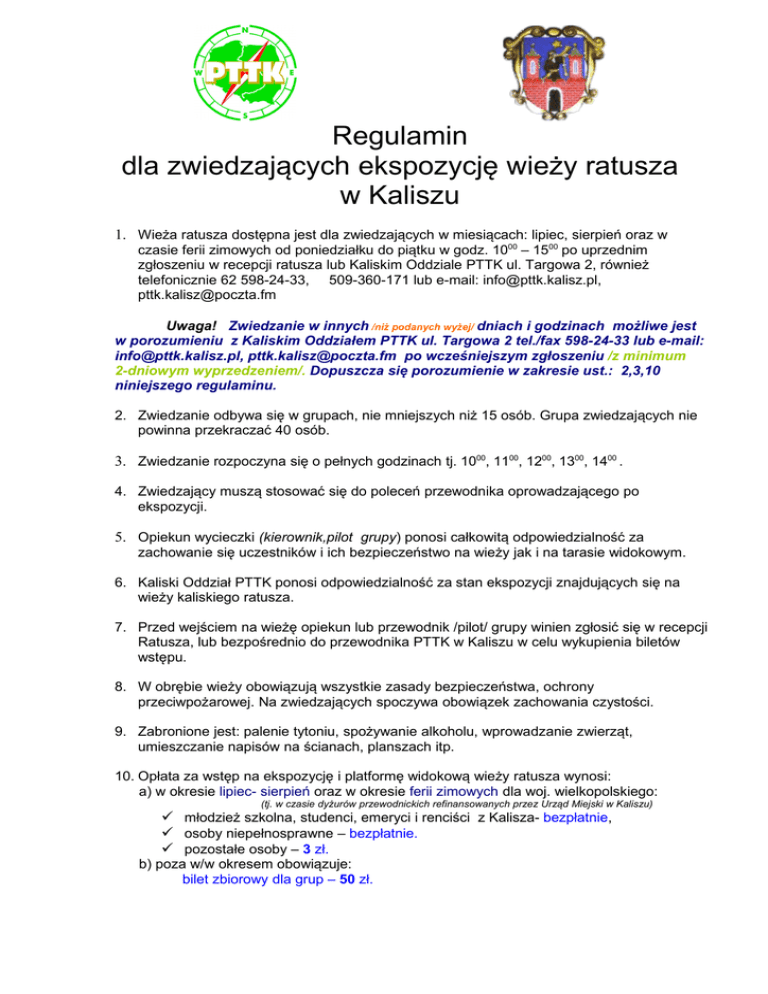 Regulamin dla zwiedzających ekspozycję wieży ratusza w Kaliszu 1. Wieża ratusza dostępna jest dla zwiedzających w miesiącach: lipiec, sierpień oraz w czasie ferii zimowych od poniedziałku do piątku w godz. 1000 – 1500 po uprzednim zgłoszeniu w recepcji ratusza lub Kaliskim Oddziale PTTK ul. Targowa 2, również telefonicznie 62 598-24-33, 509-360-171 lub e-mail: [email protected], [email protected] Uwaga! Zwiedzanie w innych /niż podanych wyżej/ dniach i godzinach możliwe jest w porozumieniu z Kaliskim Oddziałem PTTK ul. Targowa 2 tel./fax 598-24-33 lub e-mail: [email protected], [email protected] po wcześniejszym zgłoszeniu /z minimum 2-dniowym wyprzedzeniem/. Dopuszcza się porozumienie w zakresie ust.: 2,3,10 niniejszego regulaminu. 2. Zwiedzanie odbywa się w grupach, nie mniejszych niż 15 osób. Grupa zwiedzających nie powinna przekraczać 40 osób. 3. Zwiedzanie rozpoczyna się o pełnych godzinach tj. 1000, 1100, 1200, 1300, 1400 . 4. Zwiedzający muszą stosować się do poleceń przewodnika oprowadzającego po ekspozycji. 5. Opiekun wycieczki (kierownik,pilot grupy) ponosi całkowitą odpowiedzialność za zachowanie się uczestników i ich bezpieczeństwo na wieży jak i na tarasie widokowym. 6. Kaliski Oddział PTTK ponosi odpowiedzialność za stan ekspozycji znajdujących się na wieży kaliskiego ratusza. 7. Przed wejściem na wieżę opiekun lub przewodnik /pilot/ grupy winien zgłosić się w recepcji Ratusza, lub bezpośrednio do przewodnika PTTK w Kaliszu w celu wykupienia biletów wstępu. 8. W obrębie wieży obowiązują wszystkie zasady bezpieczeństwa, ochrony przeciwpożarowej. Na zwiedzających spoczywa obowiązek zachowania czystości. 9. Zabronione jest: palenie tytoniu, spożywanie alkoholu, wprowadzanie zwierząt, umieszczanie napisów na ścianach, planszach itp. 10. Opłata za wstęp na ekspozycję i platformę widokową wieży ratusza wynosi: a) w okresie lipiec- sierpień oraz w okresie ferii zimowych dla woj. wielkopolskiego: (tj. w czasie dyżurów przewodnickich refinansowanych przez Urząd Miejski w Kaliszu) młodzież szkolna, studenci, emeryci i renciści z Kalisza- bezpłatnie, osoby niepełnosprawne – bezpłatnie. pozostałe osoby – 3 zł. b) poza w/w okresem obowiązuje: bilet zbiorowy dla grup – 50 zł. Niniejszy regulamin obowiązuje od 1 grudnia 2010 r.