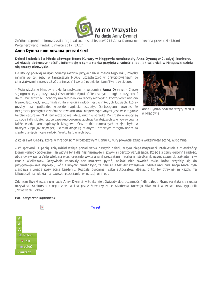 Źródło: http://old.mimowszystko.org/pl/aktualnosci/biezace/1217,Anna-Dymna-nominowana-przez-dzieci.html Wygenerowano: Piątek, 3 marca 2017, 13:17 Anna Dymna nominowana przez dzieci Dzieci i młodzież z Młodzieżowego Domu Kultury w Mrągowie nominowały Annę Dymną w 2. edycji konkursu „Gwiazdy dobroczynności”. Informację o tym aktorka przyjęła z radością, bo, jak twierdzi, w Mrągowie dzieją się rzeczy niezwykłe. Do stolicy polskiej muzyki country aktorka przyjechała w marcu tego roku, między innymi po to, żeby w tamtejszym MDK-u uczestniczyć w przygotowaniach do charytatywnej imprezy „Być dla Innych” i czytać poezję ks. Jana Twardowskiego. – Moja wizyta w Mrągowie była fantastyczna! – wspomina Anna Dymna. – Cieszę się ogromnie, że, przy okazji Olsztyńskich Spotkań Teatralnych, mogłam przyjechać do tej miejscowości. Zobaczyłam tam bowiem rzeczy niezwykłe. Początkowo miałam tremę, lecz kiedy zrozumiałam, ile energii i radości jest w młodych ludziach, którzy przybyli na spotkanie, wszelkie napięcia ustąpiły. Dostrzegłam również, że integracja pomiędzy dziećmi sprawnymi oraz niepełnosprawnymi jest w Mrągowie bardzo naturalna. Nikt tam niczego nie udaje, nikt nie narzeka. Po prostu wszyscy są ze sobą i dla siebie. Jest to zapewne ogromna zasługa tamtejszych wychowawców, a także władz samorządowych Mrągowa. Oby takich normalnych miejsc było w naszym kraju jak najwięcej. Bardzo dziękuję młodym i starszym mrągowianom za ciepłe przyjęcie i całą radość. Warto było u nich być. Anna Dymna podczas wizyty w MDK w Mrągowie Z kolei Ewa Gnozy, która w mrągowskim Młodzieżowym Domu Kultury prowadzi zajęcia wokalno-taneczne, wspomina: – W spotkaniu z panią Anią udział wzięła ponad setka naszych dzieci, w tym niepełnosprawni intelektualnie mieszkańcy Domu Pomocy Społecznej. Ta wizyta była dla nas naprawdę niezwykła i bardzo wzruszająca. Dzieciaki czuły ogromną radość, obdarowały panią Anię wieloma własnoręcznie wykonanymi prezentami: laurkami, stroikami, nawet czapą do zakładania w czasie Wielkanocy. Oczywiście zadawały też mnóstwo pytań, pośród nich również takie, które przydały się do przygotowywania imprezy „Być dla Innych”. Widać było, że pani Ania też jest szczęśliwa. Oddała nam całe swoje serce, była cierpliwa i uwagę poświęcała każdemu. Rozdała ogromną liczbę autografów, dbając o to, by otrzymał je każdy. Ta kilkugodzinna wizyta na zawsze pozostanie w naszej pamięci. Zdaniem Ewy Gnozy, nominacja Anny Dymnej w konkursie „Gwiazdy dobroczynności” dla całego Mrągowa stała się rzeczą oczywistą. Konkurs ten organizowana jest przez Stowarzyszenie Akademia Rozwoju Filantropii w Polsce oraz tygodnik „Newsweek Polska”. Fot. Krzysztof Dąbkowski Tweet