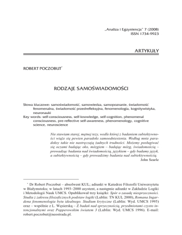 Rodzaje samowiadomoci 5 Analiza i Egzystencja 7 (2008) ISSN 1734-9923 ARTYKU£Y ROBERT POCZOBUT* RODZAJE SAMOWIADOMOCI S³owa kluczowe: samowiadomoæ, samowiedza, samopoznanie, wiadomoæ fenomenalna, wiadomoæ przedrefleksyjna, fenomenologia, kognitywistyka, neuronauki Key words: self-consciousness, self-knowledge, self-cognition, phenomenal consciousness, pre-reflective self-awareness, phenomenology, cognitive science, neuroscience Nie stawiam starej, mêtnej tezy, wedle której z badaniem subiektywnoci wi¹¿e siê pewien paradoks samoodniesienia. Wed³ug mnie paradoksy takie nie nastrêczaj¹ ¿adnych trudnoci. Mo¿emy pos³ugiwaæ siê oczami badaj¹c oko, mózgiem badaj¹c mózg, wiadomoci¹ prowadz¹c badania nad wiadomoci¹, jêzykiem gdy badamy jêzyk, a subiektywnoci¹ gdy prowadzimy badania nad subiektywnoci¹. John Searle Dr Robert Poczobut absolwent KUL; adiunkt w Katedrze Filozofii Uniwersytetu w Bia³ymstoku; w latach 19932000 asystent, a nastêpnie adiunkt w Zak³adzie Logiki i Metodologii Nauk UMCS. Opublikowa³ trzy ksi¹¿ki: Spór o zasadê niesprzecznoci. Studia z zakresu filozoficznych podstaw logiki (Lublin: TN KUL 2000), Romana Ingardena fenomenologia bytu idealnego. Studium krytyczne (Lublin: Wyd. UMCS 1995) oraz wspólnie z L. Wêsiersk¹ Z badañ nad sprzecznoci¹, przedmiotami czysto intencjonalnymi oraz Popperowskim wiatem 3 (Lublin: Wyd. UMCS 1996). E-mail: [email protected]. * 6 Robert Poczobut Unless a mental process is self-conscious there will be nothing it is like to undergo the process, and it therefore cannot be a phenomenally conscious process. [...] A minimal form of self-consciousness is a constant structural feature of conscious experience. It is the non-reflective consciousness which renders the reflection possible. Shaun Gallagher, Dan Zahavi 1. Samopoznanie i samowiedza wstêpna charakterystyka 1.1. W popularnej literaturze filozoficznej czasami zamiennie u¿ywa siê terminów: samopoznanie, samowiedza i samowiadomoæ. Jednak z uwagi na elementarne dystynkcje, jakie wprowadzono w tradycji analitycznej i fenomenologicznej, jest to zbyt daleko id¹ce uproszczenie. Uwzglêdniaj¹c ró¿nice znaczeniowe zwi¹zane z technicznym u¿yciem terminów poznanie, wiedza i wiadomoæ, mo¿emy przenieæ je na ich odpowiedniki zawieraj¹ce przedrostek samo-. Elementem wspólnym kategoriom samopoznania, samowiedzy i samowiadomoci jest moment samoodniesienia lub samozwrotnoci, który w ka¿dym wypadku realizuje siê w nieco inny sposób i ma inaczej okrelony przedmiot (dotyczy to g³ównie samowiadomoci)1. 1.2. Sporód wymienionych kategorii najbardziej ogólny charakter ma samopoznanie. Jeli za cechê konstytutywn¹ poznania uznamy pozyskanie informacji o czym, to cech¹ konstytutywn¹ samopoznania bêdzie pozyskanie informacji przez system poznawczy na temat samego siebie. Przedmiotem samopoznania mog¹ byæ wszelkie zdarzenia, procesy oraz stany zachodz¹ce w obrêbie samopoznaj¹cego siê systemu, a tak¿e relacje i oddzia³ywania, w jakich pozostaje on z szeroko rozumianym rodowiskiem. Przy czym, inaczej poznajemy procesy zachodz¹ce w komórkach naszego mózgu, inaczej subiektywne stany wiadome, jeszcze inaczej w³asn¹ przesz³oæ oraz relacje, w jakich pozostajemy ze rodowiskiem. Niektóre rodzaje samopoznania wymagaj¹ udzia³u wiadomoci, inne dokonuj¹ siê podprogowo. Mózg, jako system kontrolny organizmu, nie- 1 Przedrostek samo- mo¿e wskazywaæ na to, co jest przedmiotem poznania (poznanie samego siebie) lub na sposób realizacji tego poznania (poznawanie siebie w³asnymi rodkami, tj. bez udzia³u innych podmiotów lub narzêdzi poznania). Rodzaje samowiadomoci 7 ustannie pozyskuje informacje oraz tworzy wewnêtrzne reprezentacje procesów zachodz¹cych w naszych cia³ach bez ¿adnego udzia³u wiadomoci. Istotne jest to, ¿e ka¿dy akt samopoznania (wiadomy i niewiadomy) ma charakter aspektowy, tzn. zawsze dotyczy tylko okrelonego fragmentu nas samych. W efekcie ca³ociowy model, jaki system poznawczy konstruuje na swój temat, zmienia siê w czasie, stanowi¹c syntezê ujêæ cz¹stkowych. Samopoznawanie jest procesem, który nigdy siê nie koñczy. Nie mo¿na znaæ siebie w sposób adekwatny (ca³kowity). Zawsze pozostaje pewien horyzont wykraczaj¹cy poza zakres aktualnego samopoznania2. 1.3. Mówi¹c o samopoznaniu mo¿na mieæ na uwadze czynnoæ pozyskiwania informacji o sobie samym (samopoznawanie) b¹d wytwór tej¿e czynnoci. Wytworami czynnoci samopoznawania s¹ ró¿nego rodzaju autoreprezentacje wyobra¿enia, pojêcia, s¹dy, teorie oraz modele, jakie system poznawczy generuje na swój temat. Nie ulega w¹tpliwoci, ¿e co najmniej niektóre sporód tworzonych przez nas autoreprezentacji mog¹ byæ b³êdne b¹d fa³szywe. Samopoznanie nie jest jednowartociowe, lecz dopuszcza mo¿liwoæ wyst¹pienia b³êdów poznawczych. Zarówno indywidualne systemy poznawcze, jak i ca³e spo³ecznoci, mog¹ wytwarzaæ b³êdne reprezentacje na swój temat. Nasze subiektywne przekonanie o dobrej znajomoci siebie czêsto okazuje siê iluzoryczne. Znane s¹ efekty wypierania informacji na swój temat, pielêgnowania autoiluzji, produkowania fa³szywych wspomnieñ czy wyranego samozak³amania [self-deception]. Wiadomo, ¿e uszkodzenie okrelonych partii mózgu skutkuje os³abieniem lub zanikiem niektórych form samopoznania. Natomiast poznanie tzw. w³asnoci dyspozycyjnych jest mo¿liwe tylko w szczególnych sytuacjach, w interakcji ze rodowiskiem naturalnym i spo³ecznym (w myl zasady: na tyle siebie znamy, na ile zostalimy sprawdzeni). 1.4. Poszczególne systemy poznawcze mog¹ dysponowaæ ró¿n¹ kompetencj¹ samopoznawcz¹. W grê wchodz¹ tu: (a) ró¿nice miêdzy indywiduami w obrêbie gatunku (przedmiot zainteresowania psychologii ró¿nic indywidualnych); (b) ró¿nice miêdzy indywiduami nale¿¹cymi do ró¿nych gatunków (przedmiot zainteresowania psychologii ewolucyjnej i porów- O rozmaitych ograniczeniach samopoznania z punktu widzenia psycho