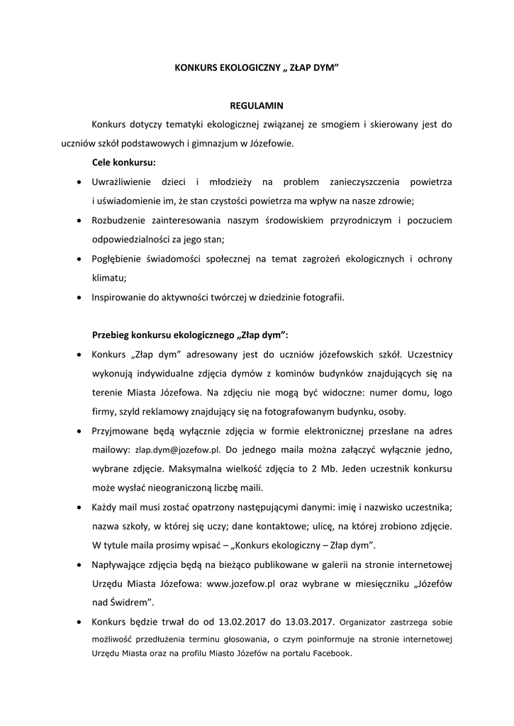 KONKURS EKOLOGICZNY „ ZŁAP DYM” REGULAMIN Konkurs dotyczy tematyki ekologicznej związanej ze smogiem i skierowany jest do uczniów szkół podstawowych i gimnazjum w Józefowie. Cele konkursu: Uwrażliwienie dzieci i młodzieży na problem zanieczyszczenia powietrza i uświadomienie im, że stan czystości powietrza ma wpływ na nasze zdrowie; Rozbudzenie zainteresowania naszym środowiskiem przyrodniczym i poczuciem odpowiedzialności za jego stan; Pogłębienie świadomości społecznej na temat zagrożeń ekologicznych i ochrony klimatu; Inspirowanie do aktywności twórczej w dziedzinie fotografii. Przebieg konkursu ekologicznego „Złap dym”: Konkurs „Złap dym” adresowany jest do uczniów józefowskich szkół. Uczestnicy wykonują indywidualne zdjęcia dymów z kominów budynków znajdujących się na terenie Miasta Józefowa. Na zdjęciu nie mogą być widoczne: numer domu, logo firmy, szyld reklamowy znajdujący się na fotografowanym budynku, osoby. Przyjmowane będą wyłącznie zdjęcia w formie elektronicznej przesłane na adres mailowy: [email protected]. Do jednego maila można załączyć wyłącznie jedno, wybrane zdjęcie. Maksymalna wielkość zdjęcia to 2 Mb. Jeden uczestnik konkursu może wysłać nieograniczoną liczbę maili. Każdy mail musi zostać opatrzony następującymi danymi: imię i nazwisko uczestnika; nazwa szkoły, w której się uczy; dane kontaktowe; ulicę, na której zrobiono zdjęcie. W tytule maila prosimy wpisać – „Konkurs ekologiczny – Złap dym”. Napływające zdjęcia będą na bieżąco publikowane w galerii na stronie internetowej Urzędu Miasta Józefowa: www.jozefow.pl oraz wybrane w miesięczniku „Józefów nad Świdrem”. Konkurs będzie trwał do od 13.02.2017 do 13.03.2017. Organizator zastrzega sobie możliwość przedłużenia terminu głosowania, o czym poinformuje na stronie internetowej Urzędu Miasta oraz na profilu Miasto Józefów na portalu Facebook. Rozstrzygnięcie konkursu nastąpi nie później niż 24.03. br. Wyboru najlepszych zdjęć dokona komisja, oceniając: pomysł, oryginalność ujęcia i poziom wykonania. Uczniowie za zajęcie pierwszego, drugiego, trzeciego miejsca i wyróżnieni otrzymają nagrody rzeczowe. Dla zdobywcy pierwszego miejsca przewidziano tablet, a dwóch kolejnych smartfony. Nagrody nie mogą być wymienione na pieniądze. Przyznana zostanie również nagroda specjalna Burmistrza Miasta Józefowa dla osoby, która wyśle największą liczbę zdjęć. Zgłoszenie uczestnictwa na konkurs oznacza wyrażenie zgody na nieodpłatne wykorzystanie prac w mediach, druku, publikowanie ich w Internecie, umieszczenie na nośnikach cyfrowych oraz eksponowanie ich w innych miejscach z podaniem danych osobowych w celu propagowania konkursu. Dane osobowe będą wykorzystane jedynie do promocji konkursu. Ocena jury jest ostateczna i niepodważalna. Dane osobowe uczestników Konkursu nie będą wykorzystywane przez Urząd Miasta Józefowa w celach promocyjnych, informacyjnych, reklamowych i marketingowych. Będą przetwarzane wyłącznie w celu prawidłowego przeprowadzenia Konkursu. Administratorem danych jest Urząd Miasta Józefowa. W kwestiach nieuregulowanych niniejszym Regulaminem stosuje się przepisy kodeksu cywilnego oraz ustawy z dnia 29 października 1997 r. o ochronie danych osobowych (Dz. U. 2002 r., Nr 101, poz. 926 z późn. zmianami).