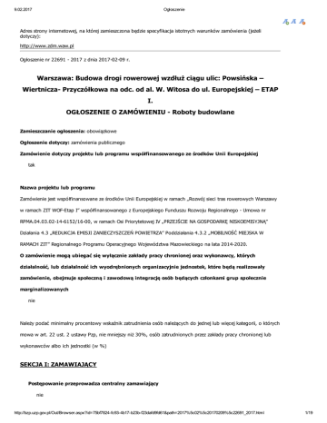 9.02.2017 Ogłoszenie Adres strony internetowej, na której zamieszczona będzie specyfikacja istotnych warunków zamówienia (jeżeli dotyczy): http://www.zdm.waw.pl Ogłoszenie nr 22691 2017 z dnia 20170209 r. Warszawa: Budowa drogi rowerowej wzdłuż ciągu ulic: Powsińska – Wiertnicza Przyczółkowa na odc. od al. W. Witosa do ul. Europejskiej – ETAP I. OGŁOSZENIE O ZAMÓWIENIU Roboty budowlane Zamieszczanie ogłoszenia: obowiązkowe Ogłoszenie dotyczy: zamówienia publicznego Zamówienie dotyczy projektu lub programu współfinansowanego ze środków Unii Europejskiej tak Nazwa projektu lub programu Zamówienie jest współfinansowane ze środków Unii Europejskiej w ramach „Rozwój sieci tras rowerowych Warszawy w ramach ZIT WOFEtap I” współfinansowanego z Europejskiego Funduszu Rozwoju Regionalnego Umowa nr RPMA.04.03.02146152/1600, w ramach Osi Priorytetowej IV „PRZEJŚCIE NA GOSPODARKĘ NISKOEMISYJNĄ” Działania 4.3 „REDUKCJA EMISJI ZANIECZYSZCZEŃ POWIETRZA” Poddziałania 4.3.2 „MOBILNOŚĆ MIEJSKA W RAMACH ZIT” Regionalnego Programu Operacyjnego Województwa Mazowieckiego na lata 20142020. O zamówienie mogą ubiegać się wyłącznie zakłady pracy chronionej oraz wykonawcy, których działalność, lub działalność ich wyodrębnionych organizacyjnie jednostek, które będą realizowały zamówienie, obejmuje społeczną i zawodową integrację osób będących członkami grup społecznie marginalizowanych nie Należy podać minimalny procentowy wskaźnik zatrudnienia osób należących do jednej lub więcej kategorii, o których mowa w art. 22 ust. 2 ustawy Pzp, nie mniejszy niż 30%, osób zatrudnionych przez zakłady pracy chronionej lub wykonawców albo ich jednostki (w %) SEKCJA I: ZAMAWIAJĄCY Postępowanie przeprowadza centralny zamawiający nie http://bzp.uzp.gov.pl/Out/Browser.aspx?id=75bf7824fc934b17b23bf23dafd9fd61&path=2017%5c02%5c20170209%5c22691_2017.html 1/19 9.02.2017 Ogłoszenie Postępowanie przeprowadza podmiot, któremu zamawiający powierzył/powierzyli przeprowadzenie postępowania nie Informacje na temat podmiotu któremu zamawiający powierzył/powierzyli prowadzenie postępowania: Postępowanie jest przeprowadzane wspólnie przez zamawiających nie Jeżeli tak, należy wymienić zamawiających, którzy wspólnie przeprowadzają postępowanie oraz podać adresy ich siedzib, krajowe numery identyfikacyjne oraz osoby do kontaktów wraz z danymi do kontaktów: Postępowanie jest przeprowadzane wspólnie z zamawiającymi z innych państw członkowskich Unii Europejskiej nie W przypadku przeprowadzania postępowania wspólnie z zamawiającymi z innych państw członkowskich Unii Europejskiej – mające zastosowanie krajowe prawo zamówień publicznych: Informacje dodatkowe: I. 1) NAZWA I ADRES: Miasto Stołeczne Warszawa Zarząd Dróg Miejskich, krajowy numer identyfikacyjny , ul. ul. Chmielna 120, 00801 Warszawa, woj. mazowieckie, państwo Polska, tel. 22 55 89 000, email [email protected], faks 228 909 211. Adres strony internetowej (URL): www.zdm.waw.pl I. 2) RODZAJ ZAMAWIAJĄCEGO: Administracja samorządowa I.3) WSPÓLNE UDZIELANIE ZAMÓWIENIA (jeżeli dotyczy): Podział obowiązków między zamawiającymi w przypadku wspólnego przeprowadzania postępowania, w tym w przypadku wspólnego przeprowadzania postępowania z zamawiającymi z innych państw członkowskich Unii Europejskiej (który z zamawiających jest odpowiedzialny za przeprowadzenie postępowania, czy i w jakim zakresie za przeprowadzenie postępowania odpowiadają pozostali zamawiający, czy zamówienie będzie udzielane przez każdego z zamawiających indywidualnie, czy zamówienie zostanie udzielone w imieniu i na rzecz pozostałych zamawiających): I.4) KOMUNIKACJA: Nieograniczony, pełny i bezpośredni dostęp do dokumentów z postępowania można uzyskać pod adresem (URL) http://bzp.uzp.gov.pl/Out/Browser.aspx?id=75bf7824fc934b17b23bf23dafd9fd61&path=2017%5c02%5c20170209%5c22691_2017.html 2/19 9.02.2017 Ogłoszenie tak www.zdm.waw.pl Adres strony internetowej, na której zamieszczona będzie specyfikacja istotnych warunków zamówienia nie www.zdm.waw.pl Dostęp do dokumentów z postępowania jest ograniczony więcej informacji można uzyskać pod adresem nie Oferty lub wnioski o dopuszczenie do udziału w postępowaniu należy przesyłać: Elektronicznie nie adres Dopuszczone jest przesłanie ofert lub wniosków o dopuszczenie do udziału w postępowaniu w inny sposób: tak Inny sposób: Zarząd Dróg Miejskich ul. Chmielna 120, 00801 Warszawa, Kancelaria Wymagane jest przesłanie ofert lub wniosków o dopuszczenie do udziału w postępowaniu w inny sposób: nie Adres: Komunikacja elektroniczna wymaga korzystania z narzędzi i urządzeń lub formatów plików, które nie są ogólnie dostępne nie Nieograniczony, pełny, bezpośredni i bezpłatny dostęp do tych narzędzi można uzyskać pod adresem: (URL) SEKCJA II: PRZEDMIOT ZAMÓWIENIA http://bzp.uzp.gov.pl/Out/Browser.aspx?id=75bf7824fc934b17b23bf23dafd9fd61&path=2017%5c02%5c20170209%5c22691_2017.html 3/19 9.02.2017 Ogłoszenie II.1) Nazwa nadana zamówieniu przez zamawiającego: Budowa drogi rowerowej wzdłuż ciągu ulic: Powsińska – Wiertnicza Przyczółkowa na odc. od al. W. Witosa do ul. Europejskiej – ETAP I. Numer referencyjny: DPZ/7/PN/7/17 Przed wszczęciem postępowania o udzielenie zamówienia przeprowadzono dialog techniczny nie II.2) Rodzaj zamówienia: roboty budowlane II.3) Informacja o możliwości składania ofert częściowych Zamówienie podzielone jest na części: Nie (wielkość, zakres, rodzaj i ilość dostaw, usług lub robót budowlanych lub określenie zapotrzebowania i wymagań ) a w przypadku partnerstwa innowacyjnego II.4) Krótki opis przedmiotu zamówienia określenie zapotrzebowania na innowacyjny produkt, usługę lub roboty budowlane: Przedmiotem zamówienia jest wykonanie robót budowlanomontażowych w zakresie: budowy dróg rowerowych, przebudowy i remontu ch