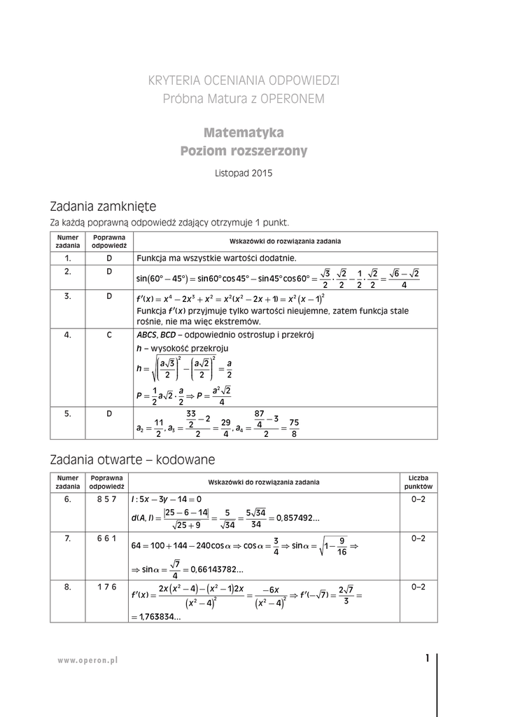 KRYTERIA OCENIANIA ODPOWIEDZI Próbna Matura z OPERONEM Matematyka Poziom rozszerzony Listopad 2015 Zadania zamknięte Za każdą poprawną odpowiedź zdający otrzymuje 1 punkt. Numer zadania Poprawna odpowiedź 1. D 2. D 3. D f ′( x ) = x 4 − 2 x 3 + x 2 = x 2( x 2 − 2 x + 1) = x 2 ( x − 1) Funkcja f ¢( x ) przyjmuje tylko wartości nieujemne, zatem funkcja stale rośnie, nie ma więc ekstremów. 4. C ABCS, BCD – odpowiednio ostrosłup i przekrój Wskazówki do rozwiązania zadania Funkcja ma wszystkie wartości dodatnie. sin(60° − 45°) = sin 60° cos 45° − sin 45° cos 60° = 6− 2 3 2 1 2 ⋅ − ⋅ = 2 2 2 2 4 2 h – wysokość przekroju 2 2 a 3 a 2 a − = h = 2 2 2 a a2 2 1 a 2⋅ ⇒P= 2 2 4 33 87 −2 −3 11 29 75 2 a2 = , a3 = = , a4 = 4 = 2 2 4 2 8 P= 5. D Zadania otwarte – kodowane Numer zadania Poprawna odpowiedź 6. 857 661 25 − 6 − 14 176 25 + 9 = 5 34 = 5 34 = 0, 857492... 34 64 = 100 + 144 − 240 cos a ⇒ cos a = ⇒ sin a = 8. 0–2 l : 5 x − 3y − 14 = 0 d( A, l ) = 7. Liczba punktów Wskazówki do rozwiązania zadania f ′( x ) = 3 9 ⇒ sin a = 1− ⇒ 4 16 0–2 7 = 0,66143782... 4 2 x ( x 2 − 4) − ( x 2 − 1)2 x (x 2 2 − 4) = −6 x (x 2 2 − 4) ⇒ f ′(− 7 ) = 2 7 = 3 0–2 = 1,763834... w w w. o p e r o n . p l 1 Matematyka. Poziom rozszerzony Próbna Matura z OPERONEM i „Gazetą Wyborczą” Numer zadania Poprawna odpowiedź 9. 090 10. 259 Wskazówki do rozwiązania zadania 2 + 2n n 1 n2 + n 2 + 4 + 6 + ... + 2n 2 lim = = = lim = lim 2 2 n→+∞ n→+∞ 11n − 1 n→+∞ 11n2 − 1 11 11n − 1 = 0, 090909... 3 x13 + x23 = ( x1 + x2 ) − 3 x1 x2 ( x1 + x2 ) = −b3 c b − 3 ⋅ − = 3 a a a Liczba punktów 0–2 0–2 = −73 − 12 (−7) = −343 + 84 = −259 Zadania otwarte Numer zadania 11. Modelowe etapy rozwiązywania zadania Rozwiązanie: 1 log24 6 = a ⇒ log6 24 = a log6 256 = log6 44 = 4 log6 4 4 log6 4 = 4 ⋅ log6 12. Liczba punktów 0–3 1 4 (1 − a) 24 = 4 (log6 24 − log6 6) = 4 − 1 = a a 6 Istotny postęp: 1 Zapisanie równości: log24 6 = a ⇒ log6 24 = a Pokonanie zasadniczych trudności: 24 Zapisanie równości: log6 256 = log6 44 = 4 log6 4 = 4 ⋅ log6 6 1 Rozwiązanie pełne: Wykazanie tezy zadania: 4 (1 − a) 1 4 (log6 24 − log6 6) = 4 − 1 = a a 3 Rozwiązanie: S = (3, − 5), r = 34 2 0–3 l : 4 x + 3y + C = 0 d( S, l ) = r ⇔ 12 − 15 + C 16 + 9 = 34 ⇒ C = 5 34 + 3 ∨ C = −5 34 + 3 Styczne mają wzory: 4 x + 3y + 5 34 + 3 = 0, 4 x + 3 x − 5 34 + 3 Istotny postęp: Wyznaczenie środka i promienia okręgu: S = (3, − 5), r = 34 1 Pokonanie zasadniczych trudności: Zapisanie stycznej w postaci l : 4 x + 3y + C = 0 i warunku styczności: 2 d( S, l ) = r ⇔ 12 − 15 + C 16 + 9 = 34 Rozwiązanie pełne: Rozwiązanie równania i zapisanie odpowiedzi: C = 5 34 + 3 ∨ C = −5 34 + 3 Styczne mają wzory: 4 x + 3y + 5 34 + 3 = 0, 4 x + 3 x − 5 34 + 3 w w w. o p e r o n . p l 3 2 Matematyka. Poziom rozszerzony Próbna Matura z OPERONEM i „Gazetą Wyborczą” Numer zadania 13. Modelowe etapy rozwiązywania zadania Rozwiązanie: a ≠ 0 ∧ ∆ > 0 ⇒ m ∈ (−∞, − 6) ∪ (2, + ∞) Liczba punktów 0–4 2 2 (m + 5) = x1 x2 ⇒ (m + 5) = 4 ⇒ m + 5 = 2 ∨ m + 5 = −2 m = −3 ∨ m = −7 – pierwsza liczba nie spełnia warunku ∆ > 0 m = −7 14. Postęp: Zapisanie i rozwiązanie warunków: a ≠ 0 ∧ ∆ > 0 ⇒ m ∈ (−∞,−6) ∪ (2, +∞) 1 Istotny postęp: 2 Zapisanie trzeciego warunku w postaci: ( m + 5) = x1 x2 2 Pokonanie zasadniczych trudności: Zapisanie trzeciego warunku w postaci: 2 (m + 5) = 4 ⇒ m + 5 = 2 ∨ m + 5 = −2 3 Rozwiązanie pełne: Wyznaczenie części wspólnej rozwiązań wszystkich warunków: m = −7 4 Rozwiązanie: h = EF – wysokość trójkąta BDE a2 3 1 a a 3 P∆BDE = = ⋅ ⋅h⇒h= 32 2 2 8 a 3 FB a 3a = 8 ⇒ FB = ⇒ DF = a 8 8 a 3 2 2 a 3 3 tga = 8 ⇒ tga = ⇒ a = 30° 3a 3 8 Postęp: Wprowadzenie oznaczeń: h = EF – wysokość trójkąta BDE a2 3 1 a a 3 P∆BDE = = ⋅ ⋅h⇒h= 32 2 2 8 Istotny postęp: a 3 FB a = 8 ⇒ FB = Obliczenie długości odcinka FB : a 8 a 3 2 2 Pokonanie zasadniczych trudności: a a 3a Obliczenie długości odcinka DF : DF = − = 2 8 8 Rozwiązanie pełne: a 3 3 ⇒ a = 30° Wyznaczenie kąta a : tga = 8 ⇒ tga = 3a 3 8 w w w. o p e r o n . p l 0–4 1 2 3 4 3 Matematyka. Poziom rozszerzony Próbna Matura z OPERONEM i „Gazetą Wyborczą” Numer zadania 15. Modelowe etapy rozwiązywania zadania Rozwiązanie: p sin 2 x + cos 4 x = 0 ⇒ sin 2 x + sin − 4 x = 0 2 p p 2x + − 4x 2x − + 4x p p 2 2 2 sin cos = 0 ⇒ sin − x + = 0 ∨ cos 3 x − = 0 ⇒ 2 2 4 4 p p p p p kp ⇒ − x + = k p ∨ 3 x − = + k p ⇒ x = − k p ∨ x = + ,k ∈C 4 4 2 4 4 3 Istotny postęp: 16. p Zapisanie równania w postaci: sin 2 x + cos 4 x = 0 ⇒ sin 2 x + sin − 4 x = 0 2 p p 2x + − 4x 2x − + 4x 2 2 2 sin cos =0 2 2 Pokonanie zasadniczych trudności: p p 2x + − 4x 2x − + 4x 2 2 = 0 ∨ cos =0 Zapisanie alternatywy równań: sin 2 2 Rozwiązanie prawie pełne: Zapisanie rozwiązań w postaci: p p p p p kp ,k ∈C − x + = k p ∨ 3 x − = + k p ⇒ x = − k p ∨ x = + 4 4 2 4 4 3 Rozwiązanie pełne: Zapisanie rozwiązań w postaci: p p kp x = − kp ∨ x = + ,k ∈C 4 4 3 Rozwiązanie: 1 pr2h = p ⇒ h = 2 r 2p r 1 + r3 P ( x ) = 2p rh + 2p r 2 = 2 + 2p r 2 , P( x ) = 2p ,r >0 r r 2r 3 − 1 1 P′( x ) = 2p , P′ ( x ) = 0 ⇔ r = 3 2 r 2 1 Po przeanalizowaniu znaków pochodnej otrzymujemy: w punkcie r = 3 funk2 cja osiąga minimum, które jest jednocześnie najmniejszą wartością funkcji. I część: Wyznaczenie wzoru funkcji określającej pole walca Wyznaczenie zależności między promieniem podstawy i wysokością walca: 1 pr2h = p ⇒ h = 2 r Wyznaczenie wzoru na pole całkowite walca: 2p r 1 + r3 P ( r, h) = 2p rh + 2p r 2 = 2 + 2p r 2 , P( r ) = 2p r r Wyznaczenie dziedziny funkcji: r ∈ (0, + ∞) II część: Zbadanie pochodnej i wyznaczenie ekstrem
