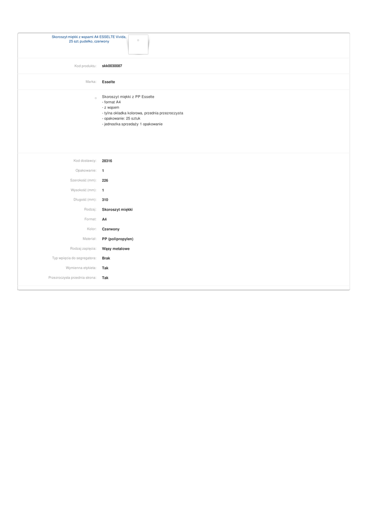 Skoroszyt miękki z wąsami A4 ESSELTE Vivida, 25 szt. pudełko, czerwony Kod produktu: Marka: skk0030087 Esselte Skoroszyt miękki z PP Esselte - format A4 - z wąsem - tylna okładka kolorowa, przednia przezroczysta - opakowanie: 25 sztuk - jednostka sprzedaży 1 opakowanie Kod dostawcy: Opakowanie: 28316 1 Szerokość (mm): 226 Wysokość (mm): 1 Długość (mm): 310 Rodzaj: Skoroszyt miękki Format: A4 Kolor: Materiał: Rodzaj zapięcia: Typ wpięcia do segregatora: Czerwony PP (polipropylen) Wąsy metalowe Brak Wymienna etykieta: Tak Przezroczysta przednia strona: Tak