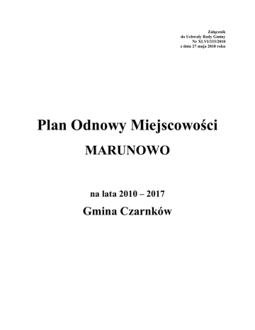 Załącznik do Uchwały Rady Gminy Nr XLVI/333/2010 z dnia 27 maja 2010 roku Plan Odnowy Miejscowości MARUNOWO na lata 2010 – 2017 Gmina Czarnków PLAN ODNOWY MIEJSCOWOŚCI MARUNOWO ______________________________________________________________________________ SPIS TREŚCI I. Ogólna charakterystyka wsi …………………………………………… 3 II. Inwentaryzacja zasobów wsi …....……………………………………. 6 1. Zasoby przyrodnicze, klimat ………………………………………… 6 2. Dziedzictwo kulturowe, historyczne i religijne ……………………… 9 3. Infrastruktura społeczna ……………………………………………… 12 4. Przestrzeń i infrastruktura techniczna ……………………………… .. 13 5. Gospodarka i rolnictwo ……………………………………….... ……. 14 6. Kapitał społeczny i ludzki ………………………………………… … 15 III. Ocena potencjalnych moŜliwości ( Analiza SWOT) ………………… 17 IV. Wykaz planowanych zadań inwestycyjnych i przedsięwzięć aktywizujących społeczność lokalną w okresie 2010-2017………………………………………………….. 19 2 PLAN ODNOWY MIEJSCOWOŚCI MARUNOWO ______________________________________________________________________________ I. OGÓLNA CHARAKTERYSTYKA WSI Wieś Marunowo połoŜona jest we wschodniej części gminy Czarnków w powiecie czarnkowsko – trzcianeckim (województwo wielkopolskie), przy drodze wojewódzkiej nr 183 Sarbia – ChodzieŜ. Jest wsią najbardziej wysuniętą na wschód w gminie Czarnków. Pierwsza udokumentowana wzmianka o Marunowie pochodzi z 1623 roku, kiedy to właściciel Czarnkowa, Adam Czarnkowski osiedlił na tym terenie niemieckich farmerów mlecznych z Prus Wschodnich, którzy nadali wsi nazwę Fizerige, wkrótce przekształcona na Fitzerie. 3 PLAN ODNOWY MIEJSCOWOŚCI MARUNOWO ______________________________________________________________________________ Skąd wzięła się nazwa Fizerige? Prawdopodobnie od rzeczki Rygi, obecnie kanału, który swoje ujście ma w rzece Flinta, która dalej wpada do Wełny. Nazwa Fitzerie, z pewnością wzięła się z potocznego języka i oficjalnie obowiązywała do 1 maja 1922 roku, bowiem właśnie w tym dniu nastąpiło uroczyste wyświęcenie gospodarstw niemieckich i przemianowanie nazwy Fitzerie na gromadę Marunowo. Układ gospodarstw do teraz zachował swój pierwotny, średniowieczny kształt typu owalnicy, skupiający domostwa wokół połoŜonego w centrum stawu i sali wiejskiej, a dawniej takŜe kościoła i kuźni. Nieoficjalnie obecnie istnieje równieŜ podział na Marunowo "Górne" i "Dolne". PołoŜone nieopodal wsie, charakteryzują się skoncentrowaną i rozproszoną zabudową kilkunastu gospodarstw. Całość tworzy jedno sołectwo o liczbie 278 mieszkańców. Fot. Widok wsi „z lotu ptaka” 4 PLAN ODNOWY MIEJSCOWOŚCI MARUNOWO ______________________________________________________________________________ Wieś ma charakter rolniczo-leśny, z przewagą gospodarstw nastawionych na produkcję Ŝywca wieprzowego, w tym kilka wielkoobszarowych, nowoczesnych gospodarstw rolnych. Atutem wsi są piękne, sosnowe lasy rozciągające się na wschód od wsi, będące rajem dla miłośników grzybobrania i rowerowych wycieczek oraz coraz bardziej zanikające na polskich wsiach poczucie ciszy i spokoju, a bardzo cenione zarówno wśród mieszkańców, jak i „gości” odwiedzających Marunowo. Niestety połoŜenie wsi z punktu widzenia rozwoju miejscowości nie jest korzystne. Dość daleka odległość od ośrodków miejskich, usytuowanie przy stosunkowo mało ruchliwej trasie, a takŜe brak połączeń komunikacji autobusowej powoduje, iŜ nie przybywa we wsi nowych budynków mieszkalnych oraz zakładów oferujących miejsca pracy, a w konsekwencji wieś nie rozwija się. Wielką rolę w promowaniu Marunowa na skalę lokalną odgrywa sala wiejska, w której organizowane są róŜne imprezy kierowane dla mieszkańców wsi, takie jak: „Dzień Kobiet”, „Dzień Seniora” oraz dla mieszkańców gminy i powiatu: przyjęcia okolicznościowe, zabawy straŜackie, coroczna zabawa Andrzejkowa i Sylwestrowa. Na skalę globalną wieś promuje działająca od lutego 2007 roku oficjalna strona internetowa wsi: www.marunowo.pl , załoŜona z inicjatywy Rady Sołeckiej. 5 PLAN ODNOWY MIEJSCOWOŚCI MARUNOWO ______________________________________________________________________________ II. INWENTARYZACJA ZASOBÓW WSI 1. Zasoby przyrodnicze, klimat Pod względem regionalizacji przyrodniczo-leśnej obszar Marunowa połoŜony jest w Krainie III Wielkopolsko-Pomorskiej, w Dzielnicy 4 Kotliny Gorzowskiej, Mezoregionu Puszczy Noteckiej. Według regionalizacji fizyczno-geograficznej J. Kondrackiego (1988 r.) tereny te zaliczono do Podprowincji Pojezierza Południowobałtyckiego, Makroregionu Pradoliny Noteckiej (Toruńsko- Eberswaldzkiej), Mezoregionu Doliny Środkowej Noteci. Postoje lądolodu zwane oscylacjami, a dokładniej oscylacja czarnkowska pozostawiła łuk moren czołowych ciągnący się od Ciszkowa przez Górę, Pianówkę, Czarnków do Gębic. Jest to najpiękniejszy ciąg moren czołowych w byłym woj. Fot. Zachód słońca. pilskim, na co wpłynęło jego podcięcie przez wody płynące pradoliną Noteci – Warty. Na przedpolach wymienionych ciągów moreny czołowej wody roztopowe rozmywały morenę denną i tworzyły niewielkie piaszczyste pola sandrowe. Obszar Marunowa ukształtowany został w czasie ostatniego zlodowacenia (bałtyckiego) Fot. Widok lasu sosnowego w regionie poznańskim. Typ krajobrazu naturalnego to równinny i falisty krajobraz 6 PLAN ODNOWY MIEJSCOWOŚCI MARUNOWO ______________________________________________________________________________ fluwioglacjalny, a roślinnością potencjalną są siedliska boru suchego i mieszanego. W klasyfikacji genetycznej, gleby leśne zaliczane są do gleb bielico