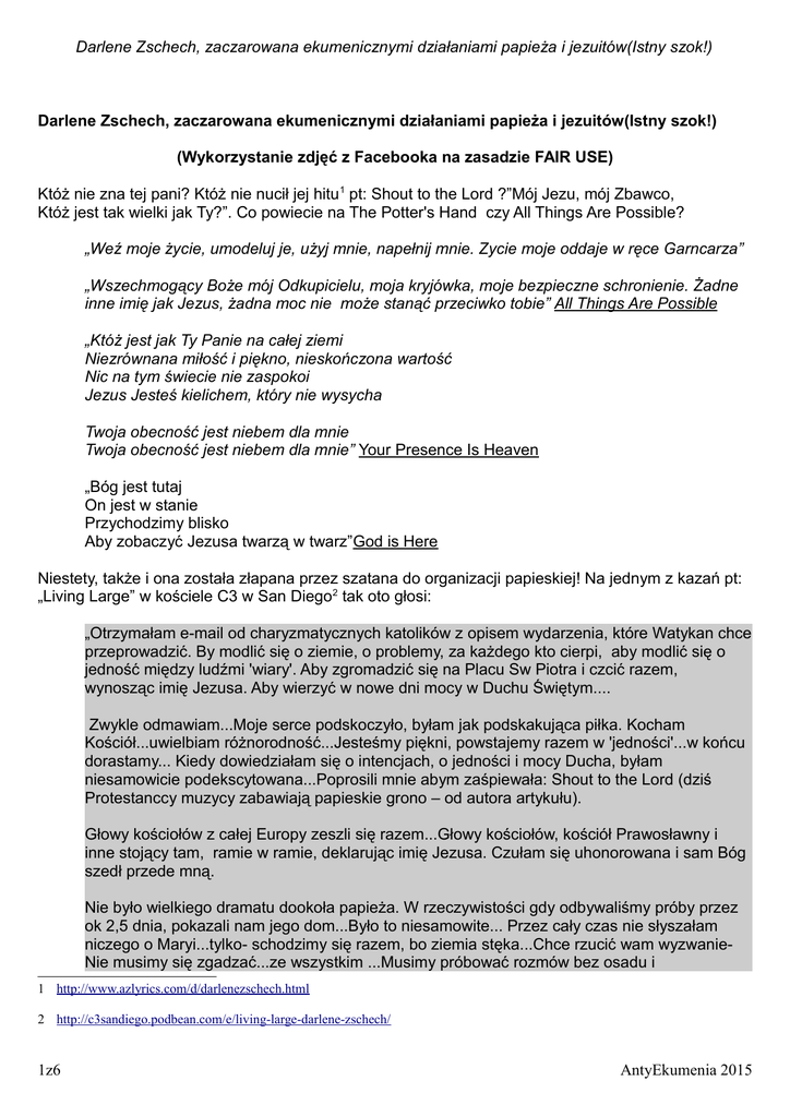 Darlene Zschech, zaczarowana ekumenicznymi działaniami papieża i jezuitów(Istny szok!) Darlene Zschech, zaczarowana ekumenicznymi działaniami papieża i jezuitów(Istny szok!) (Wykorzystanie zdjęć z Facebooka na zasadzie FAIR USE) Któż nie zna tej pani? Któż nie nucił jej hitu 1 pt: Shout to the Lord ?”Mój Jezu, mój Zbawco, Któż jest tak wielki jak Ty?”. Co powiecie na The Potter's Hand czy All Things Are Possible? „Weź moje życie, umodeluj je, użyj mnie, napełnij mnie. Zycie moje oddaje w ręce Garncarza” „Wszechmogący Boże mój Odkupicielu, moja kryjówka, moje bezpieczne schronienie. Żadne inne imię jak Jezus, żadna moc nie może stanąć przeciwko tobie” All Things Are Possible „Któż jest jak Ty Panie na całej ziemi Niezrównana miłość i piękno, nieskończona wartość Nic na tym świecie nie zaspokoi Jezus Jesteś kielichem, który nie wysycha Twoja obecność jest niebem dla mnie Twoja obecność jest niebem dla mnie” Your Presence Is Heaven „Bóg jest tutaj On jest w stanie Przychodzimy blisko Aby zobaczyć Jezusa twarzą w twarz”God is Here Niestety, także i ona została złapana przez szatana do organizacji papieskiej! Na jednym z kazań pt: „Living Large” w kościele C3 w San Diego2 tak oto głosi: „Otrzymałam e-mail od charyzmatycznych katolików z opisem wydarzenia, które Watykan chce przeprowadzić. By modlić się o ziemie, o problemy, za każdego kto cierpi, aby modlić się o jedność między ludźmi 'wiary'. Aby zgromadzić się na Placu Sw Piotra i czcić razem, wynosząc imię Jezusa. Aby wierzyć w nowe dni mocy w Duchu Świętym.... Zwykle odmawiam...Moje serce podskoczyło, byłam jak podskakująca piłka. Kocham Kościół...uwielbiam różnorodność...Jesteśmy piękni, powstajemy razem w 'jedności'...w końcu dorastamy... Kiedy dowiedziałam się o intencjach, o jedności i mocy Ducha, byłam niesamowicie podekscytowana...Poprosili mnie abym zaśpiewała: Shout to the Lord (dziś Protestanccy muzycy zabawiają papieskie grono – od autora artykułu). Głowy kościołów z całej Europy zeszli się razem...Głowy kościołów, kościół Prawosławny i inne stojący tam, ramie w ramie, deklarując imię Jezusa. Czułam się uhonorowana i sam Bóg szedł przede mną. Nie było wielkiego dramatu dookoła papieża. W rzeczywistości gdy odbywaliśmy próby przez ok 2,5 dnia, pokazali nam jego dom...Było to niesamowite... Przez cały czas nie słyszałam niczego o Maryi...tylko- schodzimy się razem, bo ziemia stęka...Chce rzucić wam wyzwanieNie musimy się zgadzać...ze wszystkim ...Musimy próbować rozmów bez osadu i 1 http://www.azlyrics.com/d/darlenezschech.html 2 http://c3sandiego.podbean.com/e/living-large-darlene-zschech/ 1z6 AntyEkumenia 2015 Darlene Zschech, zaczarowana ekumenicznymi działaniami papieża i jezuitów(Istny szok!) nonsensu...Lata wcześniej, gdy byłam zaangażowana w Katolicki Dzień Młodzieży, leciwy ksiądz i ja usiedliśmy by pogadać. Chcieli abyśmy poprowadzili uwielbianie, więc siadłam i zapytałam: Jak możemy wam usłużyć? ” Oto skandal dzisiejszych pseudo Zielonoświątkowców i pseudo- Charyzmatyków- powtarzają nauki papieża! Usługują katolicyzmowi! Kaza ci odrzucić Pismo, bo przecież katolicyzm nie ma racji w żadnej kwestii! Kaza ci traktować niezbawionych ludzi jako zbawionych! Abyś przestał 'upartej ewangelizacji katolików' i 'przestał noszenia drewna do lasu'...Skandal nad skandale! Można ja zobaczyć na Placu 'św Piotra' w poniższym nagraniu wideo: www.youtube.com/watch?v=7zI6p1rxMt8 Don Moen, Darlene Zschech wystąpili obok Andrea Bocelli(który jest oddany papiestwu i Maryi) a wydarzenie ekumeniczne nosi nazwę 'Voices in Prayer'(Glosy w Modlitwie) na placu przed Watykanem w celebracji zwiedzenia! 3 I ponownie, jest to organizowane przez Konia Trojańskiego, który został wypuszczony przez Jezuitów- Odnowę w Duchu Świętym zwana dookoła świata jako 'katoliccy charyzmatycy'. To wydarzenie jest zorganizowane pod pretekstem 'prześladowanego kościoła'. W Polsce to samo robi papieskie zwiedzenie pod nazwa Głos Prześladowanych Chrześcijan na czele z Zielonoświątkowym pastorem, Darlene ma ponad 1 ml fanów na Facebooku. Nie kryje się ze zdjęcia z jej ekumenicznych spotkań zwiedzenia: 3 Lipca 2015 r. 3 http://www.christiantoday.com/article/darlene.zschech.andrea.bocelli.sing.at.prayer.for.persecuted.church.event.hosted.by.pope.fra ncis/57935.htm 2z6 AntyEkumenia 2015 Darlene Zschech, zaczarowana ekumenicznymi działaniami papieża i jezuitów(Istny szok!) Darlene Zchech z Franciszkiem- Facebook „Uhonorowana aby zaśpiewać w tym tygodniu u boku A.Bocelli, Dona Moena, Noa razem z papieżem Franciszkiem i tysiącami czcicieli zbierających się na placu Sw. Piotra w Watykanie. Jest to celebracja jedności i pokoju w Odnowie Ducha Świętego. Niesamowite dni dla Ciała Chrystusa. Informacja o wydarzeniu pod linkiem, choć jest po włosku” https://www.facebook.com/darlenezschech?fref=ts https://www.facebook.com/DonMoenMusic 3z6 AntyEkumenia 2015 Darlene Zschech, zaczarowana ekumenicznymi działaniami papieża i jezuitów(Istny szok!) Don Moen na placu przed Watykanem. 4z6 AntyEkumenia 2015 Darlene Zschech, zaczarowana ekumenicznymi działaniami papieża i jezuitów(Istny szok!) Jedynym słowem jakie można tu wrzucić jest: zdrada, kłamstwo i fałsz papieskich zabiegów! D.Zschech podąża w ślady strategii nakręconej podczas Soboru Watykańskiego II. Po raz kolejny naczyniem zwiedzenia jest odnowa w 'Duchu Świętym'. Obserwujemy totalne zerwanie z Chrześcijaństwem Biblijnym i prawdziwym Jezusem, który mówi aby nie dać się zwieść, ze nie wszystko co podaje się za Niego jest prawdziwe! Tu jednak biegną ślepo i służą przeciwnikowi. Ta droga upadł David DuPlessis, DuPlantis, Ulf Ekman, Kenneth Copeland...To nie oni zawrócili katolików, to katolicy ich podeszli i przeciągnęli do papieskiego oszustwa...Zauw