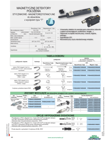 MAGNETYCZNE DETEKTORY POŁOŻENIA STYCZNIKOWE - MAGNETOREZYSTANCYJNE do siłowników z wycięciem typu "T" Stycznikowy 2 żyły Magnetorezyst. 3 żyły Moc przełączana (maks.) 5 W / 5 VA 3W wolne końcówki 5 do 120 VDC/AC Napięcie 10 do 30 V DC przełączania M12 5 do 50 V AC/5 do 60 V DC Maks. prąd przełączania 100 mA Maks. spadek napicia <5V < 2,5 V Powtarzalność < 0,2 mm Temperatura pracy -25°C do +70°C -25°C do +85°C Klasa ochrony IP 67 Certyfikaty • Uniwersalny detektor do szerokiej gamy siłowników (siłowniki z pętami wzmacniającymi, profilowane, okrągłe ...) • Odporność na ciężkie warunki pracy: zwarcia, drgania, wstrząsy... • Sygnalizacja LED • Mocowanie przy użyciu standardowego wkrętaka CE UL i cUL (2m - M8) CE żółta dioda (LED) przy zwartych kontaktach TABELA DOBORU detektor (do montażu bezpośrednio w siłownikach z wycięciem "T") kod podłączenie podłączenie / złączka ilustracja Stycznikowy 2 żyły z polaryzacją kabel z PUR, długość 2 lub 5 m, przekrój żyły 0,14 mm2, wolne końcówki ocynowane brązowy: + niebieski: - kabel z PUR, długość 0,3 m + złączka z wtykiem, Ø M8 - 3 wtyki 3 1 Magnetorezystancyjny 3 żyły (z polaryzacją) brązowy: + niebieski: czarny: obciążenie 3 kabel z PUR, długość 0,3 m + złącze skręcane z wtykami Ø M12 - 3 wtyki + 1 4 2m P494A0021300A00 P494A0022300A00 5m P494A0021100A00 P494A0022100A00 P494A0021500A00 P494A0022600A00 P494A0021700A00 P494A0022800A00 P494A0021400A00 P494A0022500A00 obciążenie _ 3 Magnet. 3 żyły 1 4 4 Stycznikowy 2 żyły 1 3 4 obciążenie + _ 3 3 wtykowe, gniazdowe złącze Ø M8 1 3 1 4 4 + _ obciążenie ZESTAWY MOCUJĄCE (do siłowników okrągłych lub z prętami wzmacniającymi) typ Ø siłow. kod ilustracja siłownika mm dla detektorów T 32-40 P494A3129200A00 pręty wzmacniające - PES 450 50-63 kod dla detektorów M8 P494A5129200A00 P499A2440617A00 80 -100 P494A8129200A00 125P494AP129200A00 160-200 - typ Ø sił. ilustracja mm siłownika 12 okrągły16 ISOCLAIR 20 25 32 40 50 63 kod dla detektorów T plastik stal nierdzewna P494AJ129300A00 P494AK129600A00 P494AK129300A00 P494AK129600A00 P494AL129300A00 P494AL129600A00 P494AM129300A00 P494AL129600A00 P494A3129300A00 P494A3129600A00 P494A4129300A00 P494A4129600A00 P494A5129600A00 P494A6129600A00 Produkowane w Polsce Produkty preferowane OPCJE I WYPOSAŻENIE DODATKOWE Przedłużacz z PVC, długość 5 m, 3 żyły 0,25 mm2 ze złączem wkręcanym M8 z gniazdami (drugi koniec odizolowane końcówki) niebieska żyła niewykorzystana (stycznik) - IP67 Przedłużacz z PVC, długość 5 m, 3 żyły 0,25 mm2 ze złączem wkręcanym M12 z gniazdami (drugi koniec odizolowane końcówki) niebieska żyła niewykorzystana (stycznik) - IP67 Prosty łącznik z gniazdami 3-wtykowy Ø M8, IP67 44 5m PVC 5m PVC brązowy niebieski czarny =1 =3 =4 brązowy niebieski czarny =1 =3 =4 CM5 www.asconumatics.pl 1 1 2 4 3 3 1 4 3 4 P4994406200N001 P4994406210N001 P4994406220N001 2014/R03 Dostępność, konstrukcja i dane techniczne mogą ulec zmianie bez uprzedzenia. Wszystkie prawa zastrzeżone. Sygnalizacja