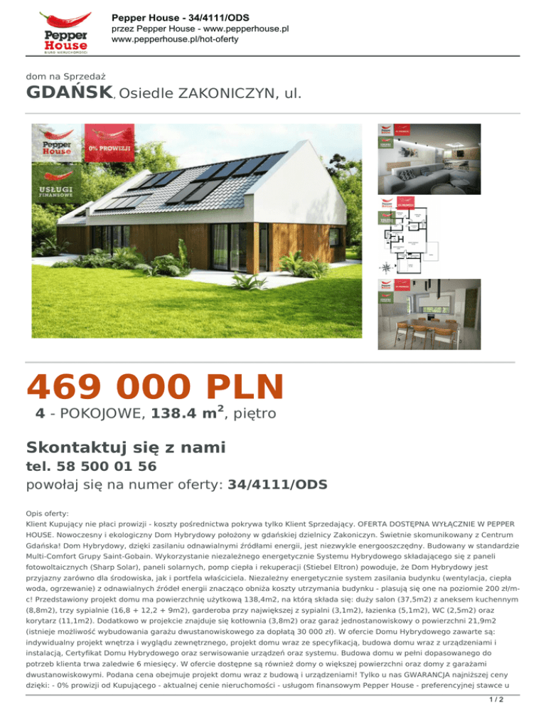 Pepper House - 34/4111/ODS przez Pepper House - www.pepperhouse.pl www.pepperhouse.pl/hot-oferty dom na Sprzedaż GDAŃSK, Osiedle ZAKONICZYN, ul. 469 000 PLN 4 - POKOJOWE, 138.4 m2, piętro Skontaktuj się z nami tel. 58 500 01 56 powołaj się na numer oferty: 34/4111/ODS Opis oferty: Klient Kupujący nie płaci prowizji - koszty pośrednictwa pokrywa tylko Klient Sprzedający. OFERTA DOSTĘPNA WYŁĄCZNIE W PEPPER HOUSE. Nowoczesny i ekologiczny Dom Hybrydowy położony w gdańskiej dzielnicy Zakoniczyn. Świetnie skomunikowany z Centrum Gdańska! Dom Hybrydowy, dzięki zasilaniu odnawialnymi źródłami energii, jest niezwykle energooszczędny. Budowany w standardzie Multi-Comfort Grupy Saint-Gobain. Wykorzystanie niezależnego energetycznie Systemu Hybrydowego składającego się z paneli fotowoltaicznych (Sharp Solar), paneli solarnych, pomp ciepła i rekuperacji (Stiebel Eltron) powoduje, że Dom Hybrydowy jest przyjazny zarówno dla środowiska, jak i portfela właściciela. Niezależny energetycznie system zasilania budynku (wentylacja, ciepła woda, ogrzewanie) z odnawialnych źródeł energii znacząco obniża koszty utrzymania budynku - plasują się one na poziomie 200 zł/mc! Przedstawiony projekt domu ma powierzchnię użytkową 138,4m2, na którą składa się: duży salon (37,5m2) z aneksem kuchennym (8,8m2), trzy sypialnie (16,8 + 12,2 + 9m2), garderoba przy największej z sypialni (3,1m2), łazienka (5,1m2), WC (2,5m2) oraz korytarz (11,1m2). Dodatkowo w projekcie znajduje się kotłownia (3,8m2) oraz garaż jednostanowiskowy o powierzchni 21,9m2 (istnieje możliwość wybudowania garażu dwustanowiskowego za dopłatą 30 000 zł). W ofercie Domu Hybrydowego zawarte są: indywidualny projekt wnętrza i wyglądu zewnętrznego, projekt domu wraz ze specyfikacją, budowa domu wraz z urządzeniami i instalacją, Certyfikat Domu Hybrydowego oraz serwisowanie urządzeń oraz systemu. Budowa domu w pełni dopasowanego do potrzeb klienta trwa zaledwie 6 miesięcy. W ofercie dostępne są również domy o większej powierzchni oraz domy z garażami dwustanowiskowymi. Podana cena obejmuje projekt domu wraz z budową i urządzeniami! Tylko u nas GWARANCJA najniższej ceny dzięki: - 0% prowizji od Kupującego - aktualnej cenie nieruchomości - usługom finansowym Pepper House - preferencyjnej stawce u 1/2 Pepper House - 34/4111/ODS przez Pepper House - www.pepperhouse.pl www.pepperhouse.pl/hot-oferty Notariusza Tylko u nas GWARANCJA bezpieczeństwa dzięki: - obsłudze prawnej Kancelarii Koprowski Gąsior Gierzyńska Ludwichowska - nadzorowi licencjonowanego Pośrednika (nr licencji 6884) - polisie OC w PZU SA - ubezpieczeniu kupowanej nieruchomości (szczegóły na naszej stronie). 2/2 Powered by TCPDF (www.tcpdf.org)