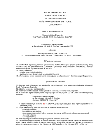 REGULAMIN KONKURSU NA PROJEKT PLAKATU DO PRZEDSTAWIENIA PAŃSTWOWEJ OPERY BAŁTYCKIEJ „CHOPINART” Dnia 15 października 2009 Akademia Sztuk Pięknych, Targ Węglowy 6, 80-836 Gdańsk, zwana dalej ASP i Państwowa Opera Bałtycka, al. Zwycięstwa 15, 80-219 Gdańsk, zwana dalej POB ogłaszają KONKURS NA PROJEKT PLAKATU DO PRZEDSTAWIENIA PAŃSTWOWEJ OPERY BAŁTYCKIEJ „CHOPINART” 1.Przedmiot konkursu 1.1. ASP i POB ogłaszają konkurs (zwany dalej KONKURSEM) na projekt plakatu (zwany dalej PROJEKTEM) do przedstawienia „Chopinart” (zwanego dalej PRZEDSTAWIENIEM), którego premiera odbędzie się w POB dnia 26.02.2010. 1.2.Projekt powinien: - nawiązywać do tańca/baletu, - być inspirowany życiem i/lub twórczością Chopina 1.3.Informacje na temat przedstawienia znajdują się w załączniku nr 1 do niniejszego Regulaminu. 2.Ogólne warunki konkursu 2.1.Konkurs jest skierowany do studentów indywidualnych oraz zespołów studentów Akademii Sztuk Pięknych w Gdańsku 2.2.Udział w konkursie jest bezpłatny. 2.3.Każdy student lub zespół może zgłosić do konkursu dowolną ilość projektów. 2.4.W konkursie będą rozpatrywane projekty zapisane na płytach CD lub DVD, nadesłane pocztą na adres: Państwowa Opera Bałtycka Al. Zwycięstwa 15, 80-219 Gdańsk dopisek: KONKURS „Chopinart” w nieprzekraczalnym terminie do 15.01.2010, przy czym decyduje data wpływu projektów do Opery Bałtyckiej. 2.5.Do projektu należy dołączyć informacje o jego autorze/autorach: a/ imię i nazwisko b/ rok i kierunek studiów c/ adres zamieszkania (i adres korespondencyjny, jeśli inny od adresu zamieszkania) d/ numer telefonu e/ adres mailowy 2.6.Rozstrzygnięcie konkursu nastąpi najpóźniej do dnia 01.02.2010. 2.7.Osoby nadsyłające projekty w ramach konkursu wyrażają tym samym zgodę na przetwarzanie przez Operę Bałtycką swoich danych osobowych wyłącznie na potrzeby konkursu (ustawa o ochronie danych osobowych z dn. 29 sierpnia 1997 roku Dz.U. Nr 133, poz. 833 z późn. zm.) 1 2.8.Zgłoszenie projektu do konkursu jest jednoznaczne z przyjęciem warunków niniejszego regulaminu. 2.9.Przekazanie projektu oznacza jednocześnie, że autor projektu oświadcza, iż projekt nie narusza praw osób trzecich, w szczególności nie narusza ich majątkowych i osobistych praw autorskich. W przypadku wystąpienia przez osobę trzecią z roszczeniami wynikającymi z tytułu naruszenia praw określonych powyżej, autor projektu zwróci Operze Bałtyckiej koszty poniesione w związku ze skierowaniem przeciwko niej roszczeń odszkodowawczych, zwalniając tym samym Operę Bałtycką od wszelkich zobowiązań, jakie powstaną z tego tytułu. 3.Wymagania, jakie powinien spełniać projekt 3.1.Projekt, dostarczony na płycie CD lub DVD, powinien spełniać następujące wymagania: b/ plik graficzny PDF, TIFF, EPS lub JPEG w rozdzielczości 300 dpi c/ format B1 w pionie d/ kolor 4/0 c/ projekt przygotowany do druku na papierze kreda matt 135 g, 3mm na spad, tzw. pass partouss 3.2.Projekt powinien zawierać: a/ logotyp Opery Bałtyckiej, logotyp 60-lecia Opery Bałtyckiej, nazwę: Opera Bałtycka. Logotypy są dostępne na stronie internetowej www.operabaltycka.pl. b/ Logotyp Roku Chopinowskiego. Logotyp jest dostępny na stronie www.mkidn.gov.pl. c/ tytuł przedstawienia „Chopinart” d/ na dole projektu autor powinien zostawić wolny pas wysokości 10 cm na logotypy sponsorów i partnerów Opery Bałtyckiej. W tym miejscu znajdzie się między innymi logotyp ASP. 3.3.Autor ma prawo umieścić na projekcie swoje nazwisko i/lub logotyp. 4.Ocena projektów i przyznanie nagrody 4.1.Projekty będą oceniane przez komisję, zwaną dalej KOMISJĄ, składającą się z 2 przedstawicieli POB i 1 przedstawiciela ASP. 4.2.Komisja wybierze jeden projekt (zwany dalej ZWYCIĘSKIM PROJEKTEM) który zdobędzie nagrodę w konkursie (zwaną dalej NAGRODĄ). 4.3.Decyzja Komisji jest niepodważalna. Od decyzji komisji nie przysługuje odwołanie. 4.4.Komisja ma prawo nie podawać uzasadnienia wyboru nagrodzonego projektu. 4.5.Komisja ma prawo nie nagrodzić żadnego z nadesłanych projektów. 4.6.Decyzja komisji i zwycięski projekt zostaną opublikowana na stronie internetowej ASP www.asp.gda.pl i POB Bałtyckiej www.operabaltycka.pl . 5.Nagroda w konkursie 5.1.Nagrodą w konkursie jest a/ nagroda pieniężna w wysokości 4000PLN brutto przekazana w formie umowy o dzieło podpisanej z przez autora zwycięskiego projektu z POB (przedmiot umowy: projekt plakatu i przekazanie na wyłączność majątkowych praw autorskich do niego). a/ promocja zwycięskiego projektu poprzez wykorzystanie go w materiałach promujących przedstawienie i ich druk na koszt POB; b/ 1 podwójne zaproszenie na premierę przedstawienia „Chopinart” – 26.02.2010. W przypadku gdy zwycięski projekt będzie pracą zbiorową – zaproszenie dla wszystkich członków zespołu. 2 6.Wykorzystanie zwycięskiego projektu 6.1.Zwycięski projekt stanie się własnością POB, w zamian za ufundowaną nagrodę. Jest to jednoznaczne z przejęciem przez POB praw autorskich do projektu oraz z możliwością wykorzystania go dla własnych potrzeb. 6.2.Wszelkie kwestie związane z użytkowaniem projektu zostaną uregulowane w umowie, o której mowa w pkt. 5.1.a/ . Odmowa podpisania wyżej wymienionej umowy będzie jednoznaczna z rezygnacją z nagrody. W takiej sytuacji komisja, o której mowa w pkt 4.1. będzie miała prawo wybrać jako zwycięski inny projekt. 6.3.POB zastrzega sobie prawo do modyfikacji zwycięskiego projektu w porozumieniu z jego autorem. 6.4.POB zastrzega sobie prawo do użycia projektu we wszystkich materiałach promujących przedstawienie (tzn. plakat, ulotka, program, repertuar POB, strona www.operabaltycka.pl itp). 6.5.Autor zwycięskiego projektu otrzyma na własny użytek po 10 sztuk każdego wydrukowanego materiału promocyjnego (tzn. plakatu, ulotki, programu, repertuaru POB), w jakim zostanie użyty jego projekt. 7.Posta