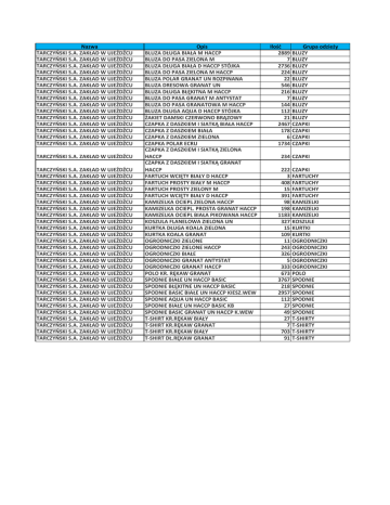 Nazwa TARCZYŃSKI S.A. ZAKŁAD W UJEŹDŹCU TARCZYŃSKI S.A. ZAKŁAD W UJEŹDŹCU TARCZYŃSKI S.A. ZAKŁAD W UJEŹDŹCU TARCZYŃSKI S.A. ZAKŁAD W UJEŹDŹCU TARCZYŃSKI S.A. ZAKŁAD W UJEŹDŹCU TARCZYŃSKI S.A. ZAKŁAD W UJEŹDŹCU TARCZYŃSKI S.A. ZAKŁAD W UJEŹDŹCU TARCZYŃSKI S.A. ZAKŁAD W UJEŹDŹCU TARCZYŃSKI S.A. ZAKŁAD W UJEŹDŹCU TARCZYŃSKI S.A. ZAKŁAD W UJEŹDŹCU TARCZYŃSKI S.A. ZAKŁAD W UJEŹDŹCU TARCZYŃSKI S.A. ZAKŁAD W UJEŹDŹCU TARCZYŃSKI S.A. ZAKŁAD W UJEŹDŹCU TARCZYŃSKI S.A. ZAKŁAD W UJEŹDŹCU TARCZYŃSKI S.A. ZAKŁAD W UJEŹDŹCU TARCZYŃSKI S.A. ZAKŁAD W UJEŹDŹCU TARCZYŃSKI S.A. ZAKŁAD W UJEŹDŹCU TARCZYŃSKI S.A. ZAKŁAD W UJEŹDŹCU TARCZYŃSKI S.A. ZAKŁAD W UJEŹDŹCU TARCZYŃSKI S.A. ZAKŁAD W UJEŹDŹCU TARCZYŃSKI S.A. ZAKŁAD W UJEŹDŹCU TARCZYŃSKI S.A. ZAKŁAD W UJEŹDŹCU TARCZYŃSKI S.A. ZAKŁAD W UJEŹDŹCU TARCZYŃSKI S.A. ZAKŁAD W UJEŹDŹCU TARCZYŃSKI S.A. ZAKŁAD W UJEŹDŹCU TARCZYŃSKI S.A. ZAKŁAD W UJEŹDŹCU TARCZYŃSKI S.A. ZAKŁAD W UJEŹDŹCU TARCZYŃSKI S.A. ZAKŁAD W UJEŹDŹCU TARCZYŃSKI S.A. ZAKŁAD W UJEŹDŹCU TARCZYŃSKI S.A. ZAKŁAD W UJEŹDŹCU TARCZYŃSKI S.A. ZAKŁAD W UJEŹDŹCU TARCZYŃSKI S.A. ZAKŁAD W UJEŹDŹCU TARCZYŃSKI S.A. ZAKŁAD W UJEŹDŹCU TARCZYŃSKI S.A. ZAKŁAD W UJEŹDŹCU TARCZYŃSKI S.A. ZAKŁAD W UJEŹDŹCU TARCZYŃSKI S.A. ZAKŁAD W UJEŹDŹCU TARCZYŃSKI S.A. ZAKŁAD W UJEŹDŹCU TARCZYŃSKI S.A. ZAKŁAD W UJEŹDŹCU TARCZYŃSKI S.A. ZAKŁAD W UJEŹDŹCU TARCZYŃSKI S.A. ZAKŁAD W UJEŹDŹCU TARCZYŃSKI S.A. ZAKŁAD W UJEŹDŹCU TARCZYŃSKI S.A. ZAKŁAD W UJEŹDŹCU TARCZYŃSKI S.A. ZAKŁAD W UJEŹDŹCU Opis BLUZA DŁUGA BIAŁA M HACCP BLUZA DO PASA ZIELONA M BLUZA DŁUGA BIAŁA D HACCP STÓJKA BLUZA DO PASA ZIELONA M HACCP BLUZA POLAR GRANAT UN ROZPINANA BLUZA DRESOWA GRANAT UN BLUZA DŁUGA BŁĘKITNA M HACCP BLUZA DO PASA GRANAT M ANTYSTAT BLUZA DO PASA GRANATOWA M HACCP BLUZA DŁUGA AQUA D HACCP STÓJKA ŻAKIET DAMSKI CZERWONO BRĄZOWY CZAPKA Z DASZKIEM I SIATKĄ BIAŁA HACCP CZAPKA Z DASZKIEM BIAŁA CZAPKA Z DASZKIEM ZIELONA CZAPKA POLAR ECRU CZAPKA Z DASZKIEM I SIATKĄ ZIELONA HACCP CZAPKA Z DASZKIEM I SIATKĄ GRANAT HACCP FARTUCH WCIĘTY BIAŁY D HACCP FARTUCH PROSTY BIAŁY M HACCP FARTUCH PROSTY ZIELONY M FARTUCH WCIĘTY BIAŁY D HACCP KAMIZELKA OCIEPL ZIELONA HACCP KAMIZELKA OCIEPL. PROSTA GRANAT HACCP KAMIZELKA OCIEPL BIAŁA PIKOWANA HACCP KOSZULA FLANELOWA ZIELONA UN KURTKA DŁUGA KOALA ZIELONA KURTKA KOALA GRANAT OGRODNICZKI ZIELONE OGRODNICZKI ZIELONE HACCP OGRODNICZKI BIAŁE OGRODNICZKI GRANAT ANTYSTAT OGRODNICZKI GRANAT HACCP POLO KR. RĘKAW GRANAT SPODNIE BIAŁE UN HACCP BASIC SPODNIE BŁĘKITNE UN HACCP BASIC SPODNIE BASIC BIAŁE UN HACCP KIESZ.WEW SPODNIE AQUA UN HACCP BASIC SPODNIE BIAŁE UN HACCP BASIC KB SPODNIE BASIC GRANAT UN HACCP K.WEW T-SHIRT KR.RĘKAW BIAŁY T-SHIRT KR.RĘKAW GRANAT T-SHIRT KR.RĘKAW BIAŁY T-SHIRT DŁ.RĘKAW GRANAT Ilość 2889 7 2736 224 22 546 216 7 144 112 21 2467 178 6 1734 Grupa odzieży BLUZY BLUZY BLUZY BLUZY BLUZY BLUZY BLUZY BLUZY BLUZY BLUZY BLUZY CZAPKI CZAPKI CZAPKI CZAPKI 234 CZAPKI 222 3 408 15 391 98 198 1183 327 15 109 11 243 326 5 333 673 3767 218 2957 112 27 49 27 7 703 91 CZAPKI FARTUCHY FARTUCHY FARTUCHY FARTUCHY KAMIZELKI KAMIZELKI KAMIZELKI KOSZULE KURTKI KURTKI OGRODNICZKI OGRODNICZKI OGRODNICZKI OGRODNICZKI OGRODNICZKI POLO SPODNIE SPODNIE SPODNIE SPODNIE SPODNIE SPODNIE T-SHIRTY T-SHIRTY T-SHIRTY T-SHIRTY