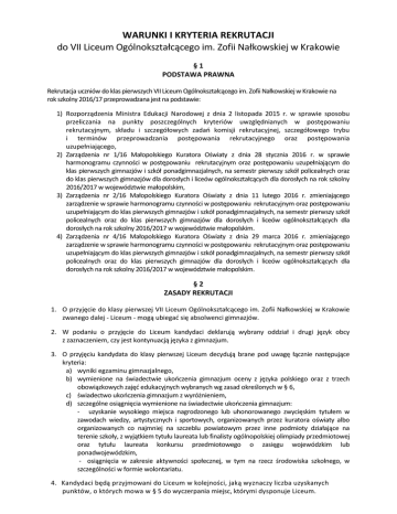 WARUNKI I KRYTERIA REKRUTACJI do VII Liceum Ogólnokształcącego im. Zofii Nałkowskiej w Krakowie §1 PODSTAWA PRAWNA Rekrutacja uczniów do klas pierwszych VII Liceum Ogólnokształcącego im. Zofii Nałkowskiej w Krakowie na rok szkolny 2016/17 przeprowadzana jest na podstawie: 1) Rozporządzenia Ministra Edukacji Narodowej z dnia 2 listopada 2015 r. w sprawie sposobu przeliczania na punkty poszczególnych kryteriów uwzględnianych w postępowaniu rekrutacyjnym, składu i szczegółowych zadań komisji rekrutacyjnej, szczegółowego trybu i terminów przeprowadzania postępowania rekrutacyjnego oraz postępowania uzupełniającego, 2) Zarządzenia nr 1/16 Małopolskiego Kuratora Oświaty z dnia 28 stycznia 2016 r. w sprawie harmonogramu czynności w postępowaniu rekrutacyjnym oraz postępowaniu uzupełniającym do klas pierwszych gimnazjów i szkół ponadgimnazjalnych, na semestr pierwszy szkół policealnych oraz do klas pierwszych gimnazjów dla dorosłych i liceów ogólnokształcących dla dorosłych na rok szkolny 2016/2017 w województwie małopolskim, 3) Zarządzenia nr 2/16 Małopolskiego Kuratora Oświaty z dnia 11 lutego 2016 r. zmieniającego zarządzenie w sprawie harmonogramu czynności w postępowaniu rekrutacyjnym oraz postępowaniu uzupełniającym do klas pierwszych gimnazjów i szkół ponadgimnazjalnych, na semestr pierwszy szkół policealnych oraz do klas pierwszych gimnazjów dla dorosłych i liceów ogólnokształcących dla dorosłych na rok szkolny 2016/2017 w województwie małopolskim. 4) Zarządzenia nr 4/16 Małopolskiego Kuratora Oświaty z dnia 29 marca 2016 r. zmieniającego zarządzenie w sprawie harmonogramu czynności w postępowaniu rekrutacyjnym oraz postępowaniu uzupełniającym do klas pierwszych gimnazjów i szkół ponadgimnazjalnych, na semestr pierwszy szkół policealnych oraz do klas pierwszych gimnazjów dla dorosłych i liceów ogólnokształcących dla dorosłych na rok szkolny 2016/2017 w województwie małopolskim. §2 ZASADY REKRUTACJI 1. O przyjęcie do klasy pierwszej VII Liceum Ogólnokształcącego im. Zofii Nałkowskiej w Krakowie zwanego dalej - Liceum - mogą ubiegać się absolwenci gimnazjów. 2. W podaniu o przyjęcie do Liceum kandydaci deklarują wybrany oddział i drugi język obcy z zaznaczeniem, czy jest kontynuacją języka z gimnazjum. 3. O przyjęciu kandydata do klasy pierwszej Liceum decydują brane pod uwagę łącznie następujące kryteria: a) wyniki egzaminu gimnazjalnego, b) wymienione na świadectwie ukończenia gimnazjum oceny z języka polskiego oraz z trzech obowiązkowych zajęć edukacyjnych wybranych wg zasad określonych w § 6, c) świadectwo ukończenia gimnazjum z wyróżnieniem, d) szczególne osiągnięcia wymienione na świadectwie ukończenia gimnazjum: - uzyskanie wysokiego miejsca nagrodzonego lub uhonorowanego zwycięskim tytułem w zawodach wiedzy, artystycznych i sportowych, organizowanych przez kuratora oświaty albo organizowanych co najmniej na szczeblu powiatowym przez inne podmioty działające na terenie szkoły, z wyjątkiem tytułu laureata lub finalisty ogólnopolskiej olimpiady przedmiotowej oraz tytułu laureata konkursu przedmiotowego o zasięgu wojewódzkim lub ponadwojewódzkim, - osiągnięcia w zakresie aktywności społecznej, w tym na rzecz środowiska szkolnego, w szczególności w formie wolontariatu. 4. Kandydaci będą przyjmowani do Liceum w kolejności, jaką wyznaczy liczba uzyskanych punktów, o których mowa w § 5 do wyczerpania miejsc, którymi dysponuje Liceum. 5. Laureaci lub finaliści ogólnopolskiej olimpiady przedmiotowej oraz laureaci konkursów przedmiotowych o zasięgu wojewódzkim lub ponadwojewódzkim są przyjmowani w pierwszej kolejności. §3 SZKOLNA KOMISJA REKRUTACYJNO – KWALIFIKACYJNA 1. W celu przeprowadzenia rekrutacji do klas pierwszych w VII Liceum dyrektor szkoły powołuje szkolną komisję rekrutacyjno - kwalifikacyjną, zwaną dalej komisją rekrutacyjną, wyznacza jej przewodniczącego i określa zadania członków komisji. 2. Do zadań komisji rekrutacyjnej należy w szczególności: a) podanie do wiadomości kandydatom informacji o warunkach rekrutacji, z uwzględnieniem kryteriów przyjęć zawartych w statucie Liceum, b) ustalenie na podstawie wyników postępowania kwalifikacyjnego i ogłoszenie listy kandydatów przyjętych do szkoły, c) sporządzenie protokołu postępowania kwalifikacyjnego. 3. Komisja rekrutacyjna kwalifikuje do każdej z klas liczbę uczniów ustaloną przez statut Liceum (34 uczniów) pomniejszoną o miejsca dla ewentualnych repetentów Liceum. 4. Decyzje komisji rekrutacyjnej umieszcza się na tablicy informacyjnej Liceum. §4 SKŁADANIE DOKUMENTÓW 1. Kandydaci do VII Liceum Ogólnokształcącego im. Zofii Nałkowskiej w Krakowie kończący gimnazjum składają wniosek o przyjęcie do szkoły pierwszego wyboru wraz z dokumentami potwierdzającymi spełnienie przez kandydata warunków branych pod uwagę w postępowaniu rekrutacyjnym w terminie od 11 kwietnia do 10 czerwca 2016 r. w Sekretariacie Liceum w godzinach: 9.00 - 15.00. 2. W terminie od 24 czerwca 2016 r. do 28 czerwca 2016 r. do godz. 15.00 należy dołączyć dokumenty: a) laureaci i finaliści konkursów przedmiotowych o zasięgu wojewódzkim i ponadwojewódzkim załączają do podania zaświadczenie wojewódzkiej komisji konkursowej, b) świadectwo ukończenia gimnazjum, c) zaświadczenie o wynikach egzaminu gimnazjalnego, d) opinię wydaną przez publiczną poradnię psychologiczno-pedagogiczną, w tym publiczną poradnię specjalistyczną, w sprawie pierwszeństwa w przyjęciu ucznia z problemami zdrowotnymi. 3. Dokumenty należy składać w kopercie (do pobrania w sekretariacie szkoły). 4. Kandydaci do szkół ponadgimnazjalnych będących w systemie rekrutacji elektronicznej dokonują rejestracji internetowej do wybranych szkół. W obrębie jednej szkoły mają możliwość wyboru dowolnej liczby oddziałów zgodnie z listą prefer