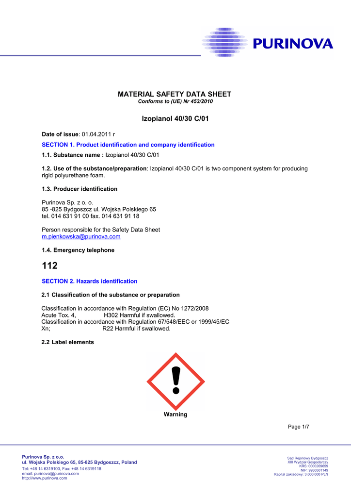 MATERIAL SAFETY DATA SHEET Conforms to (UE) Nr 453/2010 Izopianol 40/30 C/01 Date of issue: 01.04.2011 r SECTION 1. Product identification and company identification 1.1. Substance name : Izopianol 40/30 C/01 1.2. Use of the substance/preparation: Izopianol 40/30 C/01 is two component system for producing rigid polyurethane foam. 1.3. Producer identification Purinova Sp. z o. o. 85 -825 Bydgoszcz ul. Wojska Polskiego 65 tel. 014 631 91 00 fax. 014 631 91 18 Person responsible for the Safety Data Sheet [email protected] 1.4. Emergency telephone 112 SECTION 2. Hazards identification 2.1 Classification of the substance or preparation Classification in accordance with Regulation (EC) No 1272/2008 Acute Tox. 4, H302 Harmful if swallowed. Classification in accordance with Regulation 67/548/EEC or 1999/45/EC Xn; R22 Harmful if swallowed. 2.2 Label elements Warning Page 1/7 Purinova Sp. z o.o. ul. Wojska Polskiego 65, 85-825 Bydgoszcz, Poland Tel: +48 14 6319100, Fax: +48 14 6319118 email: [email protected] http://www.purinova.com Sąd Rejonowy Bydgoszcz XIII Wydział Gospodarczy KRS: 0000269659 NIP: 9930501149 Kapitał zakładowy: 3.000.000 PLN H302: Harmful if swallowed. P264 Wash hand thoroughly after handling. P270 Do not eat, drink or smoke when using this product. P301 + P312 IF SWALLOWED: Call a POISON CENTER or doctor/physician if you feel unwell. P302 + P352 IF ON SKIN: Wash with plenty of soap and water. P280 Wear protective gloves/protective clothing/eye protection/face protection. 2.3 Other hazards No data available SECTION 3. Elements of marking 3.1 Substances Not applicable 3.2 Mixtures Hazardous components NR WE Nr CAS Tris(2-chloro-1-methylethyl) phosphate Cyclohexyldimethylamine 237158-7 202715-5 13674-845 98-94-2 Hexanoic acid, 2-ethyl-, potassium salt - % (by weight) < 17% < 0,5% 3164-85-0 < 0,15% 221-625-7 Classification Acute Tox. 4 H302 Xn; R22 Flam. Liq. 3 H226 R10 Skin Corr. 1B H314 R34 R20/21 Acute Tox. Inha 3 H331 /22 Acute Tox. Derm 3 H311 R41 Acute Tox. Oral 3 H301 Eye Dam 1 H318 Eye Dam., 1, H318 Xi; R41 R43 Skin Sens., 1, H317 Repr. Cat. Repr., 2, H361d 3; R63 SECTION 4. First aid measures 4.1 Description of first aid measures If inhaled: Inhalation Not expected to present a significant inhalation hazard under anticipated conditions of normal use. At longest contact remove person to fresh air Keep him quiet and warm. Apply artificial respiration if necessary and get medical attention immediately. Skin contact Not expected to present a significant skin hazard under anticipated conditions of normal use. Remove contaminated clothing as needed, and wash skin thoroughly with soap and water. Do not use solvents. Get medical attention if irritation occurs. Eye contact In case of eye contact, immediately rinse with clean water for 10-20 minutes. Obtain medical attention. 4.2 Most important symptoms and effects, both acute and delayed : No data available Page 2/7 Purinova Sp. z o.o. ul. Wojska Polskiego 65, 85-825 Bydgoszcz, Poland Tel: +48 14 6319100, Fax: +48 14 6319118 email: [email protected] http://www.purinova.com Sąd Rejonowy Bydgoszcz XIII Wydział Gospodarczy KRS: 0000269659 NIP: 9930501149 Kapitał zakładowy: 3.000.000 PLN 4.3 Indication of any immediate medical attention and special treatment needed: If swallowed medical advice is required. SECTION 5. Firefighting measures 5.1 Extinguishing media Product is not classified as flammable. Extinguishing media :carbon dioxide, dry chemicals, foam 5.2 Special hazards arising from the mixture : Fire can produce dense smoke containing hazardous products of combustion (carbon oxides). Exposure to decomposition product may be hazardous. Do not enter fire area without proper protection. Fight fire from safe distance - protected location. Respiratory protection equipment may be required. 5.3 Advice for firefighters : Wear full firefighting turn-out gear (full Bunker gear), and respiratory protection (SCBA). DO NOT direct a solid stream of water or foam into hot, burning pools of liquid since this may cause frothing and increase fire intensity. Frothing can be violent and possibly endanger any firefighter standing too close to the burning liquid. Use water spray to cool fire exposed containers and structures until fire is out if it can be done with minimal risk. Avoid spreading burning material with water used for cooling purposes. SECTION 6. Accidental release measures 6.1 Personal precautions, protective equipment and emergency procedures: Slippery walking, spread granular cover or soak up. 6.2 Environmental precautions: Prevent spreading over a wide area (e.g. by containment or oil barriers). Do not let product enterdrains. Do not flush into surface water or sanitary sewer system. 6.3 Methods and material for containment and cleaning up: Keep in suitable, closed containers for disposal. Soak up with inert absorbent material (e.g. sand, silica gel, acid binder, universal binder, sawdust). 6.4 Reference to other sections No data available SECTION 7. Handling and storage 7.1 Precautions for safe handling Prevent unauthorized access. To avoid contact with the skin and the eyes Wear recommended personal protective equipment. Containers, which were opened, they ought to be the hermetically closed and held in the position which prevents leakage. 7.2 Conditions for safe storage, including any incompatibilities: Product is hygroscopic. Keep drums or containers tightly closed to prevent contamination. Store between 10 0C and 25 0C dry and ventilated place.Product is hygroscopic. Keep drums or containers tightly closed to prevent contamination. Store between 10 0C and 25 0C dry and ventilated place. Page 3/7 Purinova Sp. z o.o. ul. Wojska Polskiego 65, 85-825 Bydgoszcz, Poland Tel: +48 14 6319100, Fax: +48 14 6319118 email: [email protected] http://www.purinova.com Sąd Rejonowy Bydgoszcz XIII Wydział Gospodarczy KRS: 0000269659 NIP: 9930501149 Kapitał zakładowy: 3.000.000 PLN 7.3 Specific end use(s) Not applicable SECTION 8. Exp
