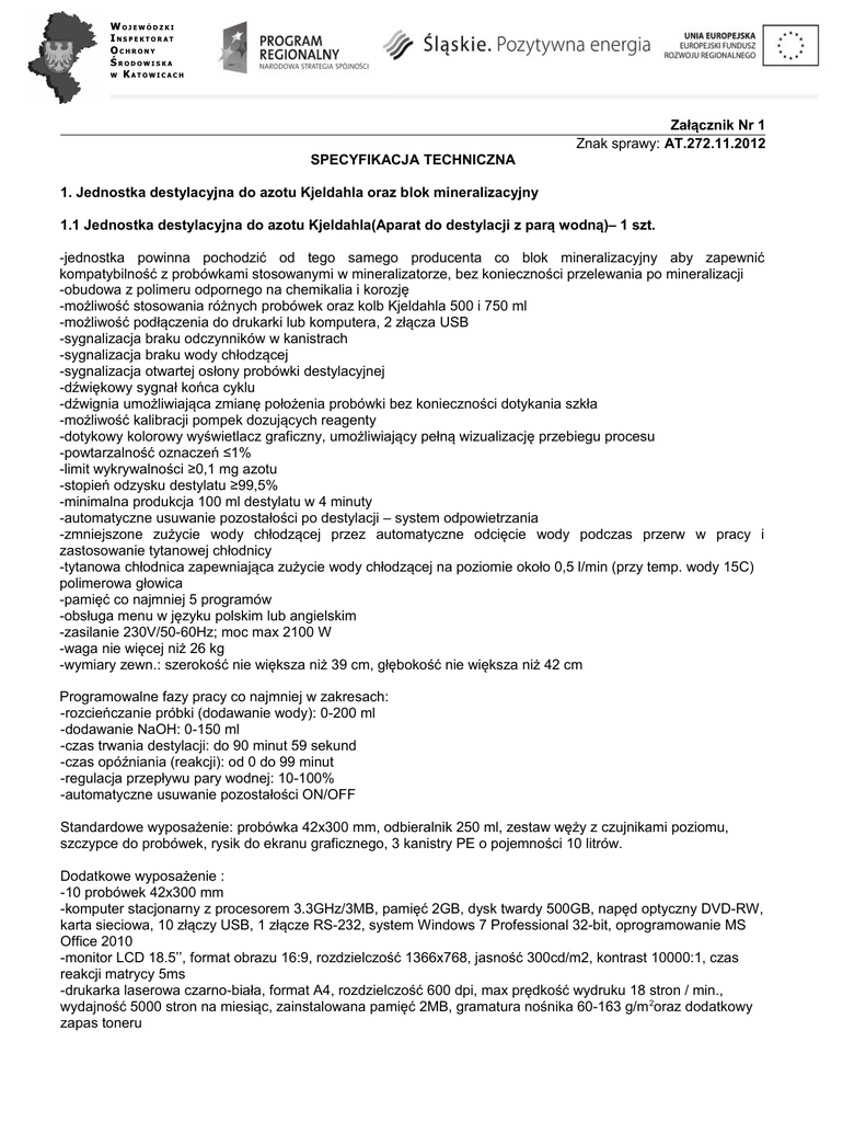 WOJEWÓDZKI INSPEKTORAT OCHRONY ŚRODOWISKA W KATOWICACH Załącznik Nr 1 Znak sprawy: AT.272.11.2012 SPECYFIKACJA TECHNICZNA 1. Jednostka destylacyjna do azotu Kjeldahla oraz blok mineralizacyjny 1.1 Jednostka destylacyjna do azotu Kjeldahla(Aparat do destylacji z parą wodną)– 1 szt. -jednostka powinna pochodzić od tego samego producenta co blok mineralizacyjny aby zapewnić kompatybilność z probówkami stosowanymi w mineralizatorze, bez konieczności przelewania po mineralizacji -obudowa z polimeru odpornego na chemikalia i korozję -możliwość stosowania różnych probówek oraz kolb Kjeldahla 500 i 750 ml -możliwość podłączenia do drukarki lub komputera, 2 złącza USB -sygnalizacja braku odczynników w kanistrach -sygnalizacja braku wody chłodzącej -sygnalizacja otwartej osłony probówki destylacyjnej -dźwiękowy sygnał końca cyklu -dźwignia umożliwiająca zmianę położenia probówki bez konieczności dotykania szkła -możliwość kalibracji pompek dozujących reagenty -dotykowy kolorowy wyświetlacz graficzny, umożliwiający pełną wizualizację przebiegu procesu -powtarzalność oznaczeń ≤1% -limit wykrywalności ≥0,1 mg azotu -stopień odzysku destylatu ≥99,5% -minimalna produkcja 100 ml destylatu w 4 minuty -automatyczne usuwanie pozostałości po destylacji – system odpowietrzania -zmniejszone zużycie wody chłodzącej przez automatyczne odcięcie wody podczas przerw w pracy i zastosowanie tytanowej chłodnicy -tytanowa chłodnica zapewniająca zużycie wody chłodzącej na poziomie około 0,5 l/min (przy temp. wody 15C) polimerowa głowica -pamięć co najmniej 5 programów -obsługa menu w języku polskim lub angielskim -zasilanie 230V/50-60Hz; moc max 2100 W -waga nie więcej niż 26 kg -wymiary zewn.: szerokość nie większa niż 39 cm, głębokość nie większa niż 42 cm Programowalne fazy pracy co najmniej w zakresach: -rozcieńczanie próbki (dodawanie wody): 0-200 ml -dodawanie NaOH: 0-150 ml -czas trwania destylacji: do 90 minut 59 sekund -czas opóźniania (reakcji): od 0 do 99 minut -regulacja przepływu pary wodnej: 10-100% -automatyczne usuwanie pozostałości ON/OFF Standardowe wyposażenie: probówka 42x300 mm, odbieralnik 250 ml, zestaw węży z czujnikami poziomu, szczypce do probówek, rysik do ekranu graficznego, 3 kanistry PE o pojemności 10 litrów. Dodatkowe wyposażenie : -10 probówek 42x300 mm -komputer stacjonarny z procesorem 3.3GHz/3MB, pamięć 2GB, dysk twardy 500GB, napęd optyczny DVD-RW, karta sieciowa, 10 złączy USB, 1 złącze RS-232, system Windows 7 Professional 32-bit, oprogramowanie MS Office 2010 -monitor LCD 18.5’’, format obrazu 16:9, rozdzielczość 1366x768, jasność 300cd/m2, kontrast 10000:1, czas reakcji matrycy 5ms -drukarka laserowa czarno-biała, format A4, rozdzielczość 600 dpi, max prędkość wydruku 18 stron / min., wydajność 5000 stron na miesiąc, zainstalowana pamięć 2MB, gramatura nośnika 60-163 g/m 2oraz dodatkowy zapas toneru 1.2 Blok mineralizacyjny(Mineralizator) – 1 szt. -blok mineralizacyjny powinien pochodzić od tego samego producenta co jednostka destylacyjna aby zapewnić kompatybilność z probówkami stosowanymi w mineralizatorze, bez konieczności przelewania po mineralizacji -zasilanie: 230V/50-60Hz; moc max 2300 W -czas osiągania temp. +420°C od temperatury otoczenia: max 22 min -aluminiowy blok grzejny na 20 probówek o wymiarach Ø 42 x 300 mm -automatyczne umieszczanie i podnoszenie probówek z bloku za pomocą windy bez konieczności manualnej obsługi urządzenia -sterownik mikroprocesorowy -graficzny wyświetlacz z możliwością planowania i monitorowania poszczególnych etapów mineralizacji -obudowa ze stali nierdzewnej pokryta farbą epoksydową -cyfrowy odczyt czasu mineralizacji i temp. w ˚C, -zakres regulacji temp. od otoczenia do 450˚C -54 programy mineralizacji w tym 24 własne programy użytkownika -4 profile czasowo-temperaturowe dla każdego programu -automatyczna kalibracja temperatury -stabilność i precyzja temp. bloku ±0,5˚C -stawiany czas pracy od 1 do 999 min. -alarm wizualny i dźwiękowy końca programu -menu w j. polskim -sygnalizacja awarii czujnika temperatury -interfejs USB -wymiary zewn. : szerokość nie większa niż 33 cm, głębokość nie większa niż 59 cm -waga: nie więcej niż 31 kg Standardowe wyposażenie: blok grzejny, kaseta na probówki wykonana ze stali nierdzewnej, winda ze stali nierdzewnej, kolektor oparów, tacka ociekowa ze stali nierdzewnej, wężyk, pompka wodna, Dodatkowe wyposażenie : -20 probówek szklanych 42x300mm, -2 opakowania katalizatora tabletkowego reakcji Kjeldahla (o składzie Cu – 3,5g siarczanu potasowego (K2SO4) + 0,4g siarczanu miedziowego (CuSO4•5H2O)) Wymagana gwarancja 24 miesiące Instalacja wraz ze szkoleniem Miejsce instalacji w Delegaturze WIOŚ Katowice w Bielsku Białej 2. Jednostka destylacyjna do azotu Kjeldahla 2.1 Jednostka destylacyjna do azotu Kjeldahla(Aparat do destylacji z parą wodną) – 1 szt. -obudowa z polimeru odpornego na chemikalia i korozję -możliwość stosowania różnych probówek oraz kolb Kjeldahla 500 i 750 ml -możliwość podłączenia do drukarki lub komputera, 2 złącza USB -sygnalizacja braku odczynników w kanistrach -sygnalizacja braku wody chłodzącej -sygnalizacja otwartej osłony probówki destylacyjnej -dźwiękowy sygnał końca cyklu -dźwignia umożliwiająca zmianę położenia probówki bez konieczności dotykania szkła -możliwość kalibracji pompek dozujących reagenty -dotykowy kolorowy wyświetlacz graficzny, umożliwiający pełną wizualizację przebiegu procesu -powtarzalność oznaczeń ≤1% -limit wykrywalności ≥0,1 mg azotu -stopień odzysku destylatu ≥99,5% -minimalna produkcja 100 ml destylatu w 4 minuty -automatyczne usuwanie pozostałości po destylacji – system odpowietrzania -zmniejszone zużycie wody chłodzącej przez automatyczne odcięcie wody podczas przerw w pracy i zastosowanie tytan