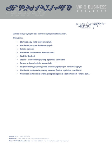 Zakres usługi wynajmu sali konferencyjnej w Kraków Airport. Oferujemy: • 12 miejsc przy stole konferencyjnym • Możliwość połączeń konferencyjnych • Światło dzienne • Możliwość zaciemnienia pomieszczenia • Rzutnik, flipchart • Laptop - za dodatkową opłatą, zgodnie z cennikiem • Parking w bezpośrednim sąsiedztwie • Salę konferencyjną w dogodnej lokalizacji przy węźle komunikacyjnym • Możliwość zamówienia przerwy kawowej (opłata zgodnie z cennikiem) • Możliwość zamówienia cateringu (opłata zgodnie z zamówieniem + marża 10%).