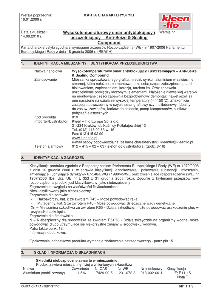 Wersja poprzednia: 16.01.2009 r. Data aktualizacji: 14.08.2010 r. KARTA CHARAKTERYSTYKI Wysokotemperaturowy smar antyblokuj cy i Wersja nr uszczelniaj cy – Anti-Seize & Sealing Compound Karta charakterystyki zgodna z wymogami przepisów Rozporz dzenia (WE) nr 1907/2006 Parlamentu Europejskiego i Rady z dnia 18 grudnia 2006 r. (REACH). 1. IDENTYFIKACJA MIESZANINY I IDENTYFIKACJA PRZEDSI BIORSTWA Nazwa handlowa Zastosowanie Kod produktu Importer/Dystrybutor Telefon alarmowy 2. Wysokotemperaturowy smar antyblokuj cy i uszczelniaj cy – Anti-Seize & Sealing Compound Mieszanka sproszkowanego grafitu, miedzi, cynku i aluminium w zawiesinie smarnej, która nało ona na montowane ze sob cz ci zabezpiecza przed blokowaniem, zapieczeniem, korozj , tarciem itp. Oraz zapewnia uszczelnienie pomi dzy ł czonymi elementami. Nało enie niewielkiej warstwy na montowane cz ci zapewnia bezproblemowy demonta , nawet je eli s one nara one na działanie wysokiej temperatury (+ 1150°C). Znakomicie zast puje powszechny w u yciu smar grafitowy czy molibdenowy. Idealny do zasuw, zawiasów, korków do chłodnic, pomp kompresorów, silników i poł cze elastycznych. 810 Kleen – Flo Europe Sp. z o.o. 31-234 Kraków, ul. Ku nicy Kołł tajowskiej 13 Tel. (012) 415 02 63 w. 15 Fax: 012 415 02 09 www.kleenflo.pl e-mail osoby odpowiedzialnej za kart charakterystyki: [email protected] 012 – 415 – 02 – 63 (telefon do dystrybutora) (godz. 8-16) IDENTYFIKACJA ZAGRO E Klasyfikacja produktu zgodnie z Rozporz dzeniem Parlamentu Europejskiego i Rady (WE) nr 1272/2008 z dnia 16 grudnia 2008 r. w sprawie klasyfikacji, oznakowania i pakowania substancji i mieszanin, zmieniaj ce i uchylaj ce dyrektywy 67/548/EWG i 1999/45/WE oraz zmieniaj ce rozporz dzenie (WE) nr 1907/2006 (Dz. Urz. UE nr L 353 z 31 grudnia 2008 roku). Zgodnie z kryteriami przepisów w/w rozporz dzenia produkt jest klasyfikowany, jako niebezpieczny Zagro enia ze wzgl du na wła ciwo ci fizykochemiczne: Niesklasyfikowany jako niebezpieczny Zagro enia dla zdrowia: - Rakotwórczy, kat. 2 ze zwrotem R45 – Mo e powodowa raka. - Mutagenny, kat. 2 ze zwrotem R46 - Mo e powodowa dziedziczne wady genetyczne. Xn – Mieszanina szkodliwa ze zwrotem R65 - Działa szkodliwie; mo e powodowa uszkodzenie płuc w przypadku połkni cia. Zagro enia dla rodowiska N – Niebezpieczny dla rodowiska ze zwrotem R51/53 - Działa toksycznie na organizmy wodne; mo e powodowa długo utrzymuj ce si niekorzystne zmiany w rodowisku wodnym. Patrz tak e punkt 12. Informacje dodatkowe: Opakowania jednostkowe produktu wymagaj znakowania ostrzegawczego - patrz pkt 15. 3. SKŁAD I INFORMACJA O SKŁADNIKACH Składniki niebezpieczne zawarte w mieszaninie: Produkt zawiera mieszanin ni ej wymienionych składników. Nazwa Zawarto Nr CAS Nr WE Aluminium (stabilizowany) 1-5% 7429-90-5 231-072-3 KARTA CHARAKTERYSTYKI Nr indeksowy 013-002-00-1 Klasyfikacja F; R11-15 Nota T str. 1 z 9 Wersja poprzednia: 16.01.2009 r. Data aktualizacji: 14.08.2010 r. KARTA CHARAKTERYSTYKI Wysokotemperaturowy smar antyblokuj cy i Wersja nr uszczelniaj cy – Anti-Seize & Sealing Compound Karta charakterystyki zgodna z wymogami przepisów Rozporz dzenia (WE) nr 1907/2006 Parlamentu Europejskiego i Rady z dnia 18 grudnia 2006 r. (REACH). 3. SKŁAD I INFORMACJA O SKŁADNIKACH Tristearynian glinu (*) Mied (*) Grafit (*) Ligroina 5-10 5-10% 10-30% 15-40% 637-12-7 7440-50-8 7792-42-5 8032-32-4 211-279-5 231-159-6 232-453-7 649-263-00-9 Rakotw. Kat. 2; R45 Muta. Kat. 2; R46 Xn; R65 Nota H i P F; R15-17 N; R50/53 N; R50/53 Cynk (niestabilizowany 1-5% 7440-66-6 231-175-3 030-001-00-1 proszek) Tlenek cynku 1-5% 1314-13-2 215-222-5 030-013-00-7 W punkcie 16 podano znaczenie zwrotów R. (*) – substancja niesklasyfikowana w tabeli 3.2 z zał cznika 6 do Rozporz dzenia Parlamentu Europejskiego i Rady (WE) nr 1272/2008 z dnia 16 grudnia 2008 r. w sprawie klasyfikacji, oznakowania i pakowania substancji i mieszanin, zmieniaj ce i uchylaj ce dyrektywy 67/548/EWG i 1999/45/WE oraz zmieniaj ce rozporz dzenie (WE) nr 1907/2006 (Dz. Urz. UE nr L 353 z 31 grudnia 2008 roku). 4. PIERWSZA POMOC Nara enie inhalacyjne Osob nara on wyprowadzi na wie e powietrze. Zapewni ciepło i spokój. W przypadku zatrzymania oddechu zastosowa sztuczne oddychanie. W przypadku wyst pienia zaburze oddechowych, osoba przeszkolona mo e poda tlen. Niezwłocznie wezwa lekarza. Osob nieprzytomn uło y i transportowa w pozycji bocznej ustalonej. Zanieczyszczenie oczu Usun soczewki kontaktowe, je li s i mo na je łatwo wyj . Przy podwini tych powiekach niezwłocznie płuka oczy bie c wod , przez co najmniej 15 minut. Zasi gn porady lekarza okulisty w przypadku utrzymywania si cech podra nienia oczu. Kontakt ze skór Odzie zanieczyszczon produktem niezwłocznie zdj . Skór zanieczyszczon produktem oczy ci mechanicznie i umy przez 5-10 minut du ilo ci wody z mydłem i dobrze spłuka . W przypadku utrzymywania si cech podra nienia skóry zasi gn porady lekarza. Zanieczyszczone ubranie upra przed ponownym u yciem. Połkni cie Przepłuka usta wod . Nie wywoływa wymiotów. Osobie nieprzytomnej nie podawa adnych rodków doustnie. Zapewni spokój i niezwłocznie zasi gn porady lekarza. Pokaza kart charakterystyki. 5. POST POWANIE W PRZYPADKU PO ARU Zalecenia ogólne: Zawiadomi otoczenie o awarii. Usun z obszaru zagro enia wszystkie osoby niebior ce udziału w likwidowaniu awarii. Wezwa Pa stwow Stra Po arn i Policj . Zalecane rodki ga nicze: Suche proszki ga nicze, ditlenek w gla (CO2), piana ga nicza. Zagro one po arem pojemniki chłodzi rozpylon wod . Nieodpowiednie rodki ga nicze: Zwarte strumienie wody. Szczególne zagro enie ze strony produktów spalania i wydzielaj cych si gazów: KARTA CHARAKTERYSTYKI str. 2 z 9 Wersja poprzednia: 16.01.2009 r. Data aktualizacji: 14.08.2010 r. KARTA CHARAKTERYSTYKI Wysokotemperaturowy smar antyblokuj cy i Wersja nr uszczelniaj cy – Anti-Seize & Sealing Compound Karta charakterystyki zgodna z wymogami przepisów Rozporz dzenia 