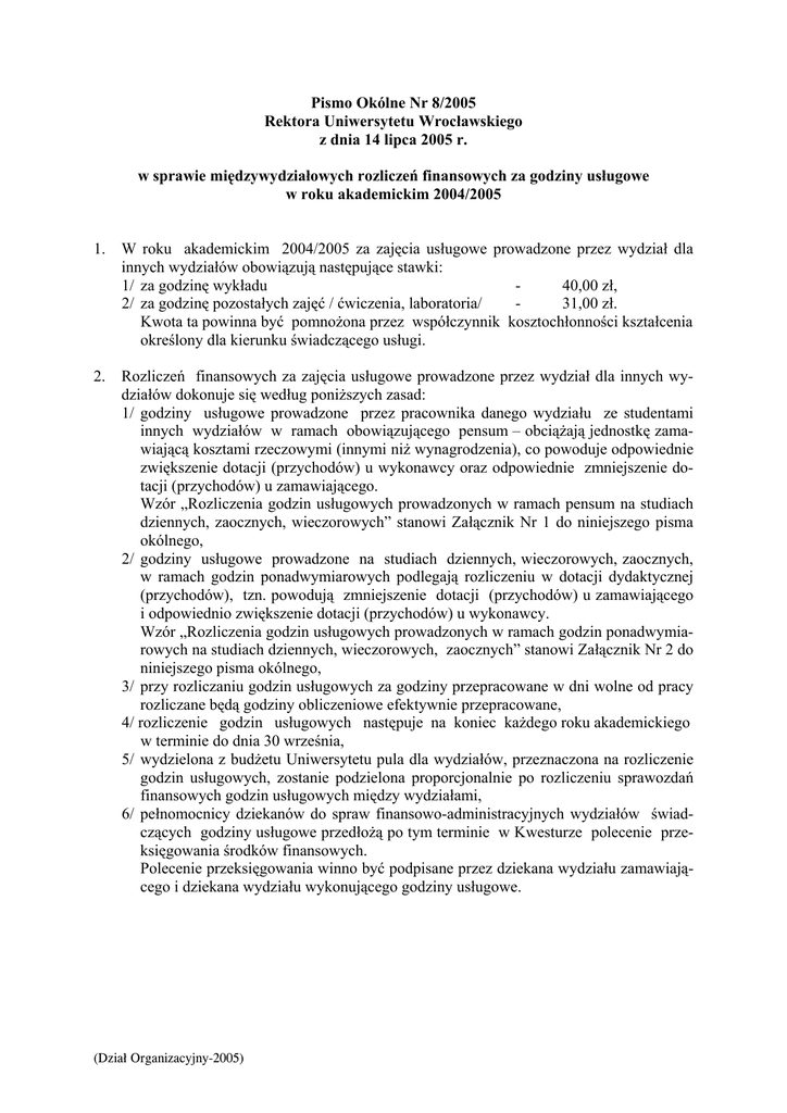 Pismo Okólne Nr 8/2005 Rektora Uniwersytetu Wrocławskiego z dnia 14 lipca 2005 r. w sprawie międzywydziałowych rozliczeń finansowych za godziny usługowe w roku akademickim 2004/2005 1. W roku akademickim 2004/2005 za zajęcia usługowe prowadzone przez wydział dla innych wydziałów obowiązują następujące stawki: 1/ za godzinę wykładu 40,00 zł, 2/ za godzinę pozostałych zajęć / ćwiczenia, laboratoria/ 31,00 zł. Kwota ta powinna być pomnożona przez współczynnik kosztochłonności kształcenia określony dla kierunku świadczącego usługi. 2. Rozliczeń finansowych za zajęcia usługowe prowadzone przez wydział dla innych wydziałów dokonuje się według poniższych zasad: 1/ godziny usługowe prowadzone przez pracownika danego wydziału ze studentami innych wydziałów w ramach obowiązującego pensum – obciążają jednostkę zamawiającą kosztami rzeczowymi (innymi niż wynagrodzenia), co powoduje odpowiednie zwiększenie dotacji (przychodów) u wykonawcy oraz odpowiednie zmniejszenie dotacji (przychodów) u zamawiającego. Wzór „Rozliczenia godzin usługowych prowadzonych w ramach pensum na studiach dziennych, zaocznych, wieczorowych” stanowi Załącznik Nr 1 do niniejszego pisma okólnego, 2/ godziny usługowe prowadzone na studiach dziennych, wieczorowych, zaocznych, w ramach godzin ponadwymiarowych podlegają rozliczeniu w dotacji dydaktycznej (przychodów), tzn. powodują zmniejszenie dotacji (przychodów) u zamawiającego i odpowiednio zwiększenie dotacji (przychodów) u wykonawcy. Wzór „Rozliczenia godzin usługowych prowadzonych w ramach godzin ponadwymiarowych na studiach dziennych, wieczorowych, zaocznych” stanowi Załącznik Nr 2 do niniejszego pisma okólnego, 3/ przy rozliczaniu godzin usługowych za godziny przepracowane w dni wolne od pracy rozliczane będą godziny obliczeniowe efektywnie przepracowane, 4/ rozliczenie godzin usługowych następuje na koniec każdego roku akademickiego w terminie do dnia 30 września, 5/ wydzielona z budżetu Uniwersytetu pula dla wydziałów, przeznaczona na rozliczenie godzin usługowych, zostanie podzielona proporcjonalnie po rozliczeniu sprawozdań finansowych godzin usługowych między wydziałami, 6/ pełnomocnicy dziekanów do spraw finansowo-administracyjnych wydziałów świadczących godziny usługowe przedłożą po tym terminie w Kwesturze polecenie przeksięgowania środków finansowych. Polecenie przeksięgowania winno być podpisane przez dziekana wydziału zamawiającego i dziekana wydziału wykonującego godziny usługowe. (Dział Organizacyjny-2005) (Dział Organizacyjny-2005) (Dział Organizacyjny-2005)