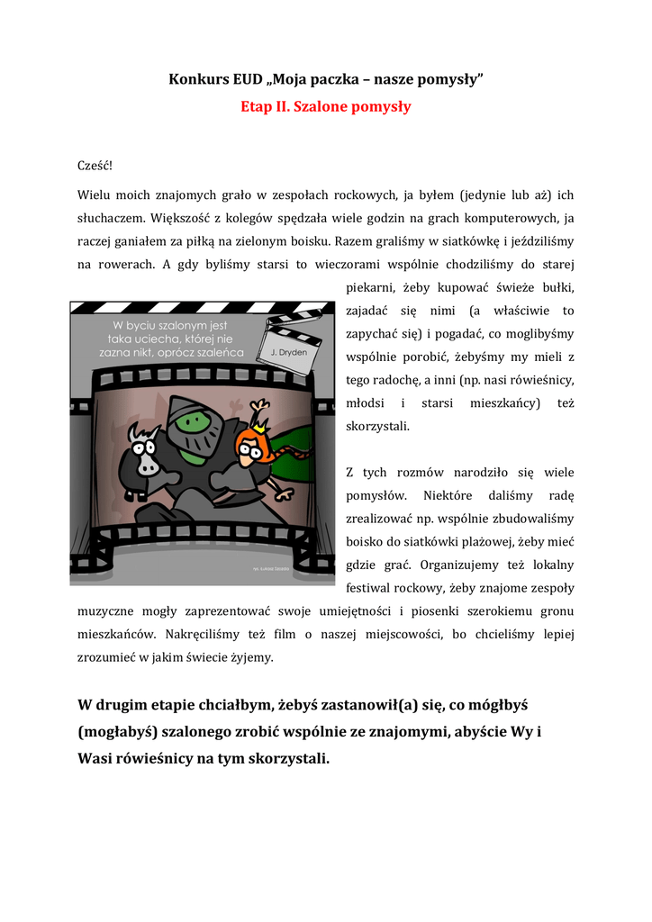 Konkurs EUD „Moja paczka – nasze pomysły” Etap II. Szalone pomysły Cześć! Wielu moich znajomych grało w zespołach rockowych, ja byłem (jedynie lub aż) ich słuchaczem. Większość z kolegów spędzała wiele godzin na grach komputerowych, ja raczej ganiałem za piłką na zielonym boisku. Razem graliśmy w siatkówkę i jeździliśmy na rowerach. A gdy byliśmy starsi to wieczorami wspólnie chodziliśmy do starej piekarni, żeby kupować świeże bułki, zajadać się nimi (a właściwie to zapychać się) i pogadać, co moglibyśmy wspólnie porobić, żebyśmy my mieli z tego radochę, a inni (np. nasi rówieśnicy, młodsi i starsi mieszkańcy) też skorzystali. Z tych rozmów narodziło się wiele pomysłów. Niektóre daliśmy radę zrealizować np. wspólnie zbudowaliśmy boisko do siatkówki plażowej, żeby mieć gdzie grać. Organizujemy też lokalny festiwal rockowy, żeby znajome zespoły muzyczne mogły zaprezentować swoje umiejętności i piosenki szerokiemu gronu mieszkańców. Nakręciliśmy też film o naszej miejscowości, bo chcieliśmy lepiej zrozumieć w jakim świecie żyjemy. W drugim etapie chciałbym, żebyś zastanowił(a) się, co mógłbyś (mogłabyś) szalonego zrobić wspólnie ze znajomymi, abyście Wy i Wasi rówieśnicy na tym skorzystali. Zadanie Przygotuj proszę 2-3-slajdową prezentację, w której przedstawisz 1 lub 2 pomysły na wspólne działania ze swoimi znajomymi. Pomysły powinny wynikać z Waszych wspólnych zainteresowań, a skorzystać na Waszych działaniach powinniście Wy i Wasi rówieśnicy. Instrukcja, czyli co i jak powinno znaleźć się na slajdach: - slajd tytułowy: nazwa konkursu, numer etapu, imię i nazwisko autora prezentacji - slajdy 2.-3.: przedstaw pomysł na wspólne działanie ze swoimi znajomymi; opis może być w dowolnej formie; zdjęcie lub rysunek na slajdzie na pewno doda kolorytu; - slajdy przygotuj na białym tle; slajd może zawierać 1-2 zdjęcia i maksymalnie 40 słów - jeśli w prezentacji umieścisz grafiki lub zdjęcia znalezione w internecie, pamiętaj by pod zdjęciem drobną czcionką podać adres strony, z której pochodzi - a jeśli chcesz wykorzystać zdjęcia ze swoimi znajomymi to zapytaj ich wcześniej o zgodę Jeśli masz jakiekolwiek trudności z przygotowaniem prezentacji, zapraszam na forum konkursu, gdzie postaram się odpowiedzieć na wszystkie pytania i wątpliwości Uczestników konkursu. Link do forum: www.uniwersytetdzieciecy.pl/forum/index/forum_id/5/category_id/97 Terminy i ogólne wymagania Na wykonanie i nadesłanie gotowej prezentacji masz czas do 29 listopada br, do godziny 20:00. Wasze prace będą opublikowane na stronie, gdzie wszyscy studenci EUD będą mogli je komentować. Gotowe prace w formie prezentacji PowerPoint (maksymalnie 3 slajdy) przesyłajcie na nasz adres mailowy: konkurs do 29 listopada (niedziela) do godz. 20. Regulamin konkursu dostępny jest na stronie: www.uniwersytetdzieciecy.pl/konkurs/index/id/91