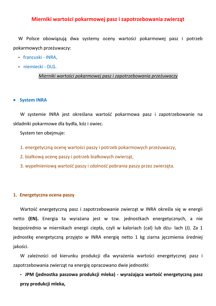 Mierniki wartości pokarmowej pasz i zapotrzebowania