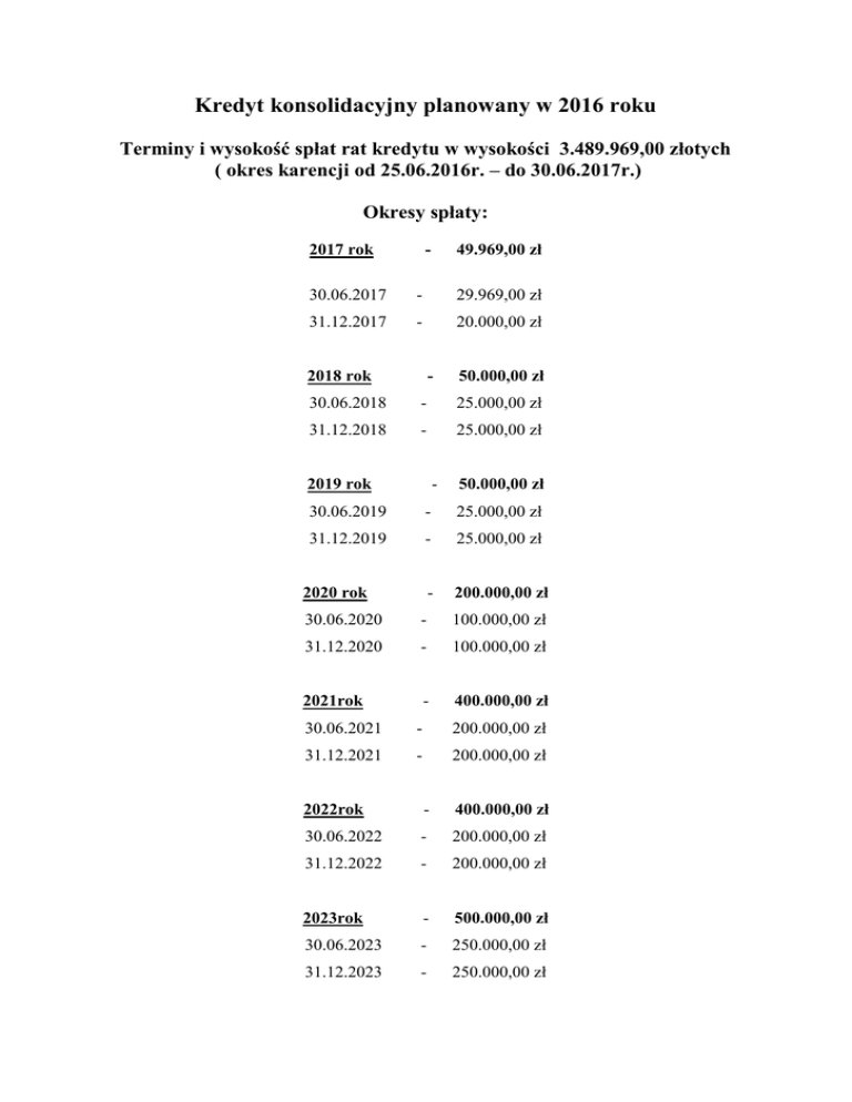 Kredyt konsolidacyjny planowany w 2016 roku Terminy i wysokość spłat rat kredytu w wysokości 3.489.969,00 złotych ( okres karencji od 25.06.2016r. – do 30.06.2017r.) Okresy spłaty: 2017 rok 49.969,00 zł - 30.06.2017 - 29.969,00 zł 31.12.2017 - 20.000,00 zł 2018 rok - 50.000,00 zł 30.06.2018 - 25.000,00 zł 31.12.2018 - 25.000,00 zł 2019 rok - 50.000,00 zł 30.06.2019 - 25.000,00 zł 31.12.2019 - 25.000,00 zł - 200.000,00 zł 2020 rok 30.06.2020 - 100.000,00 zł 31.12.2020 - 100.000,00 zł 2021rok - 400.000,00 zł 30.06.2021 - 200.000,00 zł 31.12.2021 - 200.000,00 zł 2022rok - 400.000,00 zł 30.06.2022 - 200.000,00 zł 31.12.2022 - 200.000,00 zł 2023rok - 500.000,00 zł 30.06.2023 - 250.000,00 zł 31.12.2023 - 250.000,00 zł 2024rok - 500.000,00 zł 30.06.2024 - 250.000,00 zł 31.12.2024 - 250.000,00 zł - 600.000,00 zł 2025rok 30.06.2025 - 200.000,00 zł 31.09.2025 - 200.000,00 zł 31.12.2025 - 200.000,00 zł 2026rok - 740.000,00 zł 30.06.2026 - 250.000,00 zł 31.09.2026 - 250.000,00 zł 31.12.2026 - 240.000,00 zł Skarbnik Gminy Wójt Gminy /-/ Irena Stańkowska /-/ Zdzisław Dulias