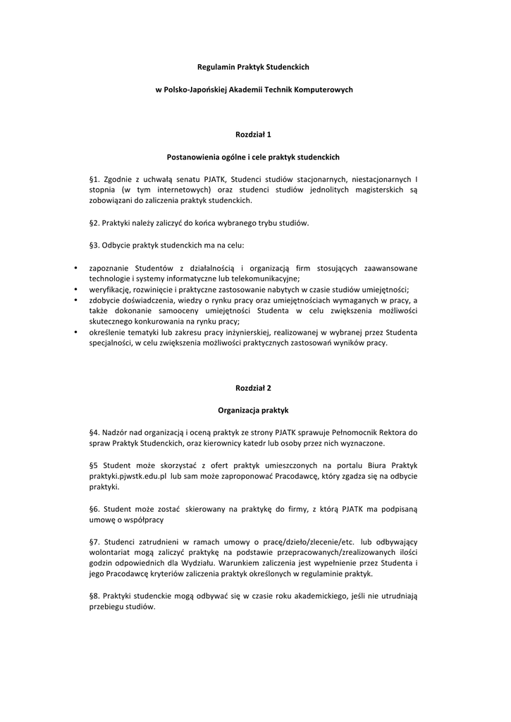 Regulamin Praktyk Studenckich w Polsko-‐Japońskiej Akademii Technik Komputerowych Rozdział 1 Postanowienia ogólne i cele praktyk studenckich §1. Zgodnie z uchwałą senatu PJATK, Studenci studiów stacjonarnych, niestacjonarnych I stopnia (w tym internetowych) oraz studenci studiów jednolitych magisterskich są zobowiązani do zaliczenia praktyk studenckich. §2. Praktyki należy zaliczyć do końca wybranego trybu studiów. §3. Odbycie praktyk studenckich ma na celu: • • • • zapoznanie Studentów z działalnością i organizacją firm stosujących zaawansowane technologie i systemy informatyczne lub telekomunikacyjne; weryfikację, rozwinięcie i praktyczne zastosowanie nabytych w czasie studiów umiejętności; zdobycie doświadczenia, wiedzy o rynku pracy oraz umiejętnościach wymaganych w pracy, a także dokonanie samooceny umiejętności Studenta w celu zwiększenia możliwości skutecznego konkurowania na rynku pracy; określenie tematyki lub zakresu pracy inżynierskiej, realizowanej w wybranej przez Studenta specjalności, w celu zwiększenia możliwości praktycznych zastosowań wyników pracy. Rozdział 2 Organizacja praktyk §4. Nadzór nad organizacją i oceną praktyk ze strony PJATK sprawuje Pełnomocnik Rektora do spraw Praktyk Studenckich, oraz kierownicy katedr lub osoby przez nich wyznaczone. §5 Student może skorzystać z ofert praktyk umieszczonych na portalu Biura Praktyk praktyki.pjwstk.edu.pl lub sam może zaproponować Pracodawcę, który zgadza się na odbycie praktyki. §6. Student może zostać skierowany na praktykę do firmy, z którą PJATK ma podpisaną umowę o współpracy §7. Studenci zatrudnieni w ramach umowy o pracę/dzieło/zlecenie/etc. lub odbywający wolontariat mogą zaliczyć praktykę na podstawie przepracowanych/zrealizowanych ilości godzin odpowiednich dla Wydziału. Warunkiem zaliczenia jest wypełnienie przez Studenta i jego Pracodawcę kryteriów zaliczenia praktyk określonych w regulaminie praktyk. §8. Praktyki studenckie mogą odbywać się w czasie roku akademickiego, jeśli nie utrudniają przebiegu studiów. Rozdział 3 Warunki zaliczenia praktyk §9. Zaliczenia praktyk studenckich dokonuje Pełnomocnik Rektora do spraw praktyk studenckich. §10.1. Warunkiem zaliczenia praktyki jest przedstawienie sprawozdania z praktyki oraz pozytywnej oceny dokonanej przez opiekuna praktyki wyznaczonego przez pracodawcę. §10.2. Sprawozdanie z praktyki powinno być przygotowane na formularzu pobranym ze strony Biura Karier i powinno zawierać: • • • • • okres trwania praktyki; nazwę jednostki organizacyjnej, w której Student odbywał praktykę; temat praktyki; opis zakresu powierzonych obowiązków i przebiegu praktyki; uwagi Studenta o przebiegu praktyki; • potwierdzenie odbycia praktyki oraz jej ocenę przez opiekuna praktyki. §10.3. Sprawozdanie jest nieważne bez podpisu i pieczątki opiekuna praktyki lub pracodawcy. §11. Sprawozdanie z praktyki jest oceniane przez Pełnomocnika Rektora do spraw Praktyk Studenckich albo Kierownika Katedry lub osobę przez niego wyznaczoną. Ocena sprawozdania jest umieszczana w indeksie (strona 82) pod tytułem „Praktyka studencka” (strona 82) z podanym wymiarem godzin odpowiadającym czasowi trwania praktyki na wybranym kierunku studiów. §12.1. Ustala się następujący wymiar czasu trwania praktyk: Studenci studiów stacjonarnych I stopnia, oraz studenci studiów jednolitych magisterskich, którzy rozpoczęli studia do roku 2008/2009 włącznie są zobowiązani do odbycia praktyk studenckich w następujących wymiarach czasowych: Wydział Informatyki (kierunek: Informatyka) w Warszawie, Gdańsku, Bytomiu 320 godzin Wydział Kultury Japonii (kierunek: Kulturoznawstwo) w Warszawie 120 godzin Wydział Sztuki Nowych Mediów (kierunek: Architektura Wnętrz) w Warszawie 120 godzin Wydział Sztuki Nowych Mediów (kierunek: Grafika) w Warszawie 120 godzin Wydział Sztuki Nowych Mediów (kierunek: Grafika) w Gdańsku 120 godzin Wydział Informatyki (kierunek: Grafika) w Bytomiu 120 godzin Wydział Zarządzania Informacją (kierunek: Zarządzanie) w Warszawie 120 godzin Studenci studiów stacjonarnych i niestacjonarnych I stopnia (w tym studenci internetowi), oraz studenci studiów jednolitych magisterskich, którzy rozpoczęli studia po roku 2008/2009 są zobowiązani do odbycia praktyk studenckich w następujących wymiarach czasowych: Wydział Informatyki (kierunek: Informatyka) w Warszawie, Gdańsku, Bytomiu 160 godzin Wydział Kultury Japonii (kierunek: Kulturoznawstwo) w Warszawie 120 godzin Wydział Sztuki Nowych Mediów (kierunek: Architektura Wnętrz) w Warszawie 200 godzin Wydział Sztuki Nowych Mediów (kierunek: Grafika) w Warszawie 120 godzin Wydział Sztuki Nowych Mediów (kierunek: Grafika) w Gdańsku 120 godzin Wydział Informatyki (kierunek: Grafika) w Bytomiu 120 godzin Wydział Zarządzania Informacją(kierunek: Zarządzanie) w Warszawie 120 godzin §13. Studenci zatrudnieni w ramach umowy o pracę/dzieło/zlecenie etc. lub odbywający wolontariat mogą uzyskać zaliczenie praktyki wypełniając sprawozdanie i dostarczając zaświadczenia o zatrudnieniu (kopie umów o pracę/dzieło/zlecenie/pracę) lub wolontariacie. Jeden z dokumentów musi zawierać pieczątkę i podpis Pracodawcy. §14.1. Praktyki powinny być rozliczone nie później niż miesiąc po ich ukończeniu. §15.Niedostarczenie przez praktykanta sprawozdania z praktyki lub zaświadczenia o zatrudnieniu lub wolontariacie w terminie umożliwiającym zaliczenie praktyk do końca semestru powoduje nie zaliczenie praktyki w tym semestrze. Praktyka może zostać zaliczona w semestrze następnym, pod warunkiem, że Student uzyska zaliczenie przed ukończeniem trybu studiów. Jeśli Student nie uzyska zaliczenia obowiązkowej ilości praktyk do końca trybu studiów nie uzyskuje absolutorium. §16. Tematyka praktyk musi być związana z kierunkiem studiów. Rozdział 4 Postanowienia końcowe §16. St