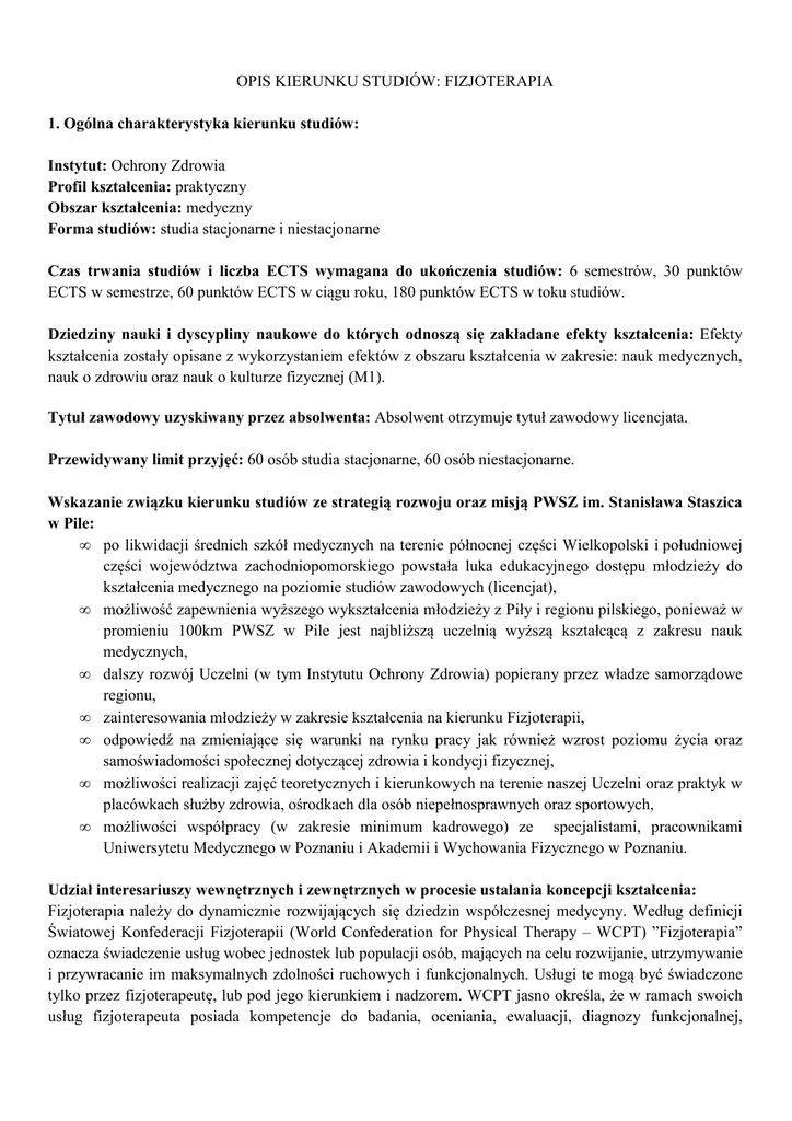 OPIS KIERUNKU STUDIÓW: FIZJOTERAPIA 1. Ogólna charakterystyka kierunku studiów: Instytut: Ochrony Zdrowia Profil kształcenia: praktyczny Obszar kształcenia: medyczny Forma studiów: studia stacjonarne i niestacjonarne Czas trwania studiów i liczba ECTS wymagana do ukończenia studiów: 6 semestrów, 30 punktów ECTS w semestrze, 60 punktów ECTS w ciągu roku, 180 punktów ECTS w toku studiów. Dziedziny nauki i dyscypliny naukowe do których odnoszą się zakładane efekty kształcenia: Efekty kształcenia zostały opisane z wykorzystaniem efektów z obszaru kształcenia w zakresie: nauk medycznych, nauk o zdrowiu oraz nauk o kulturze fizycznej (M1). Tytuł zawodowy uzyskiwany przez absolwenta: Absolwent otrzymuje tytuł zawodowy licencjata. Przewidywany limit przyjęć: 60 osób studia stacjonarne, 60 osób niestacjonarne. Wskazanie związku kierunku studiów ze strategią rozwoju oraz misją PWSZ im. Stanisława Staszica w Pile: • po likwidacji średnich szkół medycznych na terenie północnej części Wielkopolski i południowej części województwa zachodniopomorskiego powstała luka edukacyjnego dostępu młodzieży do kształcenia medycznego na poziomie studiów zawodowych (licencjat), • możliwość zapewnienia wyższego wykształcenia młodzieży z Piły i regionu pilskiego, ponieważ w promieniu 100km PWSZ w Pile jest najbliższą uczelnią wyższą kształcącą z zakresu nauk medycznych, • dalszy rozwój Uczelni (w tym Instytutu Ochrony Zdrowia) popierany przez władze samorządowe regionu, • zainteresowania młodzieży w zakresie kształcenia na kierunku Fizjoterapii, • odpowiedź na zmieniające się warunki na rynku pracy jak również wzrost poziomu życia oraz samoświadomości społecznej dotyczącej zdrowia i kondycji fizycznej, • możliwości realizacji zajęć teoretycznych i kierunkowych na terenie naszej Uczelni oraz praktyk w placówkach służby zdrowia, ośrodkach dla osób niepełnosprawnych oraz sportowych, • możliwości współpracy (w zakresie minimum kadrowego) ze specjalistami, pracownikami Uniwersytetu Medycznego w Poznaniu i Akademii i Wychowania Fizycznego w Poznaniu. Udział interesariuszy wewnętrznych i zewnętrznych w procesie ustalania koncepcji kształcenia: Fizjoterapia należy do dynamicznie rozwijających się dziedzin współczesnej medycyny. Według definicji Światowej Konfederacji Fizjoterapii (World Confederation for Physical Therapy – WCPT) ”Fizjoterapia” oznacza świadczenie usług wobec jednostek lub populacji osób, mających na celu rozwijanie, utrzymywanie i przywracanie im maksymalnych zdolności ruchowych i funkcjonalnych. Usługi te mogą być świadczone tylko przez fizjoterapeutę, lub pod jego kierunkiem i nadzorem. WCPT jasno określa, że w ramach swoich usług fizjoterapeuta posiada kompetencje do badania, oceniania, ewaluacji, diagnozy funkcjonalnej, prognozy, programowania postępowania, a także przeprowadzenia powtórnej oceny pacjenta na potrzeby prowadzonego procesu fizjoterapeutycznego. Przygotowując koncepcję kształcenia na kierunku fizjoterapia sugerowano się znacząco wskazówkami WCPT.. W procesie ustalania koncepcji kształcenia oraz przewidywanych efektów kształcenia na kierunku fizjoterapia uwzględniono również szereg opinii innych interesariuszy zewnętrznych tj. opiekunów praktyk zawodowych, pracowników szpitali klinicznych, przedstawicieli gabinetów fizjoterapeutycznych. Cenne były również uwagi dotyczące programów praktyk zawodowych, zajęć praktycznych oraz wyposażenia pracowni na kierunku fizjoterapia. W budowaniu koncepcji kształcenia kierunku fizjoterapia brali również udział interesariusze wewnętrzni tj. pracownicy dydaktyczni, studenci, władze instytutowe oraz władze Uczelni. Opinie interesariuszy wewnętrznych dotyczyły głównie programów nauczania (według Krajowych Ram Kwalifikacji, przewidywanych efektów kształcenia, pracowni, zajęć praktycznych oraz praktyk zawodowych). 2. Warunki rekrutacji na studia: Wymagania wstępne (oczekiwane kompetencje kandydata): - chęć poszerzania wiedzy z obszaru nauk medycznych, - chęć pracy z osobą niepełnosprawną, - umiejętność prezentacji wybranych czynności ruchowych. Zasady rekrutacji: • Podstawą przyjęcia na studia pierwszego stopnia jest posiadanie świadectwa dojrzałości, złożenie kompletu dokumentów w wyznaczonych terminach, spełnienie wymogów postępowania kwalifikacyjnego obowiązujących na danym kierunku studiów. • Na podstawie złożenia wymaganych dokumentów przyjmowani są na I rok studiów laureaci i finaliści olimpiad przedmiotowych stopnia centralnego zgodnie z uchwałą XXXIV/142/11 Senatu Państwowej Wyższej Szkoły Zawodowej im. Stanisława Staszica w Pile z dnia 19 maja 2011 r. • Warunkiem dopuszczenia do postępowania kwalifikacyjnego kandydatów jest: 1) zarejestrowanie się w systemie Internetowej Rejestracji Kandydatów; 2) złożenie w terminie kompletu dokumentów, w tym świadectwa dojrzałości wydanego zgodnie z obowiązującymi przepisami w tym zakresie. • Od kandydatów na studia, w procesie rekrutacji, wymagana jest następująca dokumentacja: 1) podanie o przyjęcie na I rok studiów na ustalonym formularzu, 2) oryginał lub odpis świadectwa dojrzałości, 3) świadectwo ukończenia szkoły średniej/ponadgimnazjalnej (oryginał lub kopia potwierdzona przez szkołę), 4) zaświadczenie lekarskie wystawione przez lekarza medycyny pracy stwierdzające brak przeciwwskazań do studiów na obranym kierunku – Instytut Ochrony Zdrowia 5) kserokopia dowodu osobistego poświadczona notarialnie lub przez pracownika sekretariatu właściwego Instytutu PWSZ im. Stanisława Staszica w Pile. 6) trzy fotografie o wymiarach 35 x 45 mm bez nakrycia głowy, na jasnym tle, 7) dowód opłaty rekrutacyjnej, 8) oświadczenie o spełnianiu warunków do podjęcia i kontynuowania studiów bez wnoszenia opłat, o którym mowa w art. 170 a ust. 9 ustawy z dnia 2