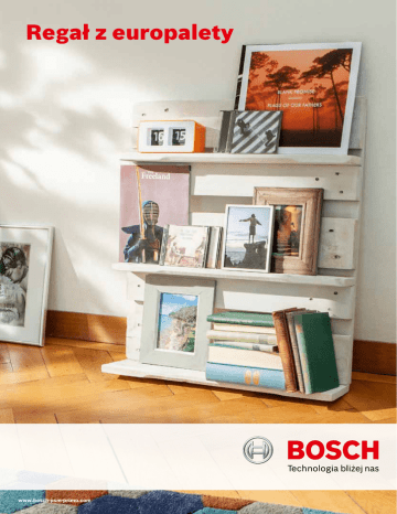 Regał z europalety www.bosch-psm-primo.com Regał z europalety: Etapy 1 Materiałem wyjściowym do budowy regału jest zwykła dostępna 2 Rozciąć paletę wzdłuż środkowych klocków. w handlu detalicznym europaleta. 3 Oddzielić górną część palety i deski dolne od klocków. 4 Oszlifować górną część palety i deski dolne. Zostaną one użyte do wykonania tylnej ścianki regału i półek. 5 Przymocować półki do tylnej ścianki regału za pomocą kątowników i śrub. www.bosch-psm-primo.com 6 Gotowy regał ponownie oszlifować i polakierować. Gotowe! Regał z europalety: Etapy Instrukcja budowy regału z palety Niewielki i niezajmujący zbyt wiele miejsca regał, wykonany z palety pozwoli Ci w indywidualny i przejrzysty sposób zaprezentować ulubione książki, obrazy i zdjęcia. Etap 1 Materiałem wyjściowym do budowy regału jest zwykła, w miarę możliwości sucha europaleta. Używaną można kupić już za parę złotych. Przed przystąpieniem do pracy europaletę należy Potrzebne elektronarzędzia: ● Szlifierka uniwersalna, np. PSM Primo ● Wyrzynarka, np. akumulatorowa piła uniwersalna PST 10,8 LI zamocować na dwóch kozłach. W razie braku kozłów, można ● Wkrętarka akumulatorowa, np. IXO posłużyć się dwoma krzesłami. ● Wiertarka ● Wałek do malowania lub system natryskowy Etap 2 Najpierw należy przeciąć paletę na dwie części. W tym celu należy Materiały dodatkowe na górnej i dolnej powierzchni palety zaznaczyć za pomocą listwy ● prostą linię, biegnącą wzdłuż zewnętrznej krawędzi środkowych 24 wkręty 3,5x20 ● 6 kątowników ● Po 3-4 arkusze papieru ściernego o ziarnistości klocków. Uwaga: Aby nie uszkodzić podłogi podczas przecinania palety, należy koniecznie wziąć pod uwagę głębokość cięcia tarczy bądź długość brzeszczotu. Dla pewności można położyć na 80 i 120 (np. doPSM Primo) podłodze grubą folię lub inną podkładkę. ● Lazura do drewna lub farba dyspersyjna Za pomocą wyrzynarki należy najpierw przeciąć wszystkie trzy ● Podkładka do ochrony podłogi deski ze strony dolnej, a następnie deski górne. Aby zachować prostą linię cięcia należy użyć szyny do cięcia lub prowadnicy, ● 2 kozły robocze Pozostałe narzędzia wykonanej z listwy, którą można zamocować za pomocą zacisków. ● Dłuto Teraz kolej na największą część palety. ● Młotek ciesielski ● Kleszcze ● Pędzel do lazury Etap 3 Paletę należy rozłożyć na części za pomocą młotka ciesielskiego lub dłuta. Dłuto z jak najdłuższą dźwignią należy zastosować w sytuacji, gdy drewno palety nie jest całkowicie suche i powierzchnię. Na zakończenie należy wybrać papier ścierny o gwoździe nie dają się wyjąć z klocków. W pierwszej kolejności większej ziarnistości (np. 120). Dzięki systemowi mocowania należy oddzielić górną część palety i deski dolne od łączących na rzepy papier można szybko wymienić i dokonać końcowej je klocków, wsuwając młotek lub dłuto między deskę i klocek i obróbki wszystkich płaszczyzn, narożników i krawędzi, ostrożnie podważając deskę wraz z gwoździami. W ten sposób w zależności od tego, jak gładka ma być powierzchnia w należy poluzować po kolei wszystkie klocki, aż górną część palety ostatecznym efekcie. Dzięki płycie szlifierskiej typu delta możliwe będzie można podnieść. Na zakończenie należy oddzielić dolne jest oszlifowanie wszystkich trudno dostępnych miejsc. deski, postępując w wyżej opisany sposób. Należy pamiętać, aby regularnie opróżniać pojemnik z mikrofiltrem, co pozwoli na stałą wydajność odsysania pyłu. Etap 4 Górna strona palety zostanie użyta jako tylna ścianka regału. Z Etap 5 desek dolnej części zostaną wykonane regały. Klocki nie będą Szerszą, środkową deskę dolnej części palety można potrzebne. zaadaptować jako najniższą półkę regału. W tym celu należy w Z poszczególnych elementów palety wystają długie gwoździe. niej po prostu nawiercić cztery dziury i przykręcić ją pod kątem Gwoździe górnej strony palety należy po prostu zagiąć, uderzając 90° do jednej z wąskich stron ścianki tylnej regału. w nie młotkiem. W tylnej ściance gotowego regału nie będzie Dwie pozostałe deski należy wsunąć do otworów w ściance ich widać, a nadal będą łączyć deski wierzchniej strony palety. Z tylnej, zostawiając przy tym zawsze odstęp o szerokości dwóch desek dolnej strony należy wybić gwoździe, uderzając młotkiem desek. Zamocować półki od spodu za pomocą kątowników i w czubek każdego gwoździa tak długo, aż wypadnie on z otworu. śrub. Przedtem jednak należy się upewnić, czy drewno palety jest naprawdę dobrze wyschnięte. Jeżeli nie, gwoździe lepiej będzie Etap 6 usunąć dłutem. Ostatni szlif: na koniec należy sprawdzić, czy wszystkie W następnej kolejności części regału należy oszlifować. krawędzie i kąty są dobrze oszlifowane. W razie potrzeby należy Najpierw trzeba użyć szlifierki PSM Primo z papierem ściernym dokonać poprawek za pomocą szlifierki PSM Primo z papierem o małej ziarnistości (np. 80), aby usunąć zadziory i wygładzić o dużej ziarnistości (np. 120). Po szlifowaniu należy przetrzeć mebel ściereczką i pokryć lazurą lub farbą w pożądanym kolorze. Gotowe! www.bosch-psm-primo.com