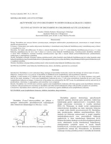 Nowiny Lekarskie 2007, 76, 2, 130-133 MONIKA RICHERT, JAN STYCZYŃSKI AKTYWNOŚĆ EX VIVO DECITABINY W OSTRYCH BIAŁACZKACH U DZIECI EX VIVO ACTIVITY OF DECITABINE IN CHILDHOOD ACUTE LEUKEMIAS Katedra i Klinika Pediatrii, Hematologii i Onkologii Akademia Medyczna w Bydgoszczy Kierownik Kliniki: prof. dr hab. n. med. Mariusz Wysocki Streszczenie Wstęp. Decitabina jest nowym lekiem cytostatycznym, analogiem nukleozydów pirymidynowych, stosowanym w terapii różnych chorób nowotworowych. Cel pracy. Celem pracy jest analiza aktywności decitabiny w komórkach ostrej białaczki limfoblastycznej i mieloblastycznej u dzieci w warunkach ex vivo. Metodyka. Do badań zakwalifikowano 22 dzieci z ostrymi białaczkami, w tym 17 z ostrą białaczką limfoblastyczną de novo, 3 z ostrą białaczką mieloblastyczną de novo oraz 2 dzieci ze wznową ostrej białaczki limfoblastycznej. Cytotoksyczność decitabiny określono w teście MTT. Dodatkowo oceniono korelację cytotoksyczności tego leku z innymi lekami przeciwbiałaczkowymi: prednizolonem, winkrystyną, L-asparaginazą i cytarabiną. Wyniki. Decitabina wykazała 14-krotnie większą cytotoksyczność wobec komórek ostrej białaczki limfoblastycznej niż wobec komórek ostrej białaczki mieloblastycznej. Komórki białaczkowe wykazują oporność krzyżową wobec decitabiny i innych badanych leków przeciwbiałaczkowych, z wyjątkiem cytarabiny. Wnioski. Decitabina wykazuje dobrą cytotoksyczność wobec komórek ostrej białaczki limfoblastycznej u dzieci. SŁOWA KLUCZOWE: ostra białaczka limfoblastyczna, dzieci, decitabina, oporność na cytostatyki. Summary Introduction. Decitabine is a new anticancer drug, analogue of pirymidine nucleoside, used in the therapy of various types of cancer. Objective. Analysis of ex vivo activity of decitabine in childhood acute lymphoblastic and myeloblastic leukemia. Methods. A total number of 22 children with acute leukemias, who were successfully tested for ex vivo drug resistance were qualified for the study, including 17 with acute lymphoblastic leukemia de novo, 3 with acute myeloblastic leukemia de novo and 2 acute lymphoblastic leukemia at relapse. Cytotoxicity of decitabine was estimated by the MTT assay. Its antileukemic activity and activity of prednisolone, vincristine, L-asparaginase and cytarabine were compared. Results. Decitabine was 14-fold more cytotoxic against acute lymphoblastic leukemia cells than against acute myeloblastic leukemia. Leukemic cells presented cross-resistance to decitabine and other tested antileukemic drugs with possible exception of cytarabine. Conclusions. Decitabine shows relatively good ex vivo cytotoxicity against childhood acute lymphoblastic leukemia. KEYWORDS: acute lymphoblastic leukemia, children, decitabine, drug resistance. Wstęp Decitabina (5-aza-2’-deeoxycytidine) jest jednym z analogów nukleozydów pirymidynowych wykazującym silne właściwości demetylujące in vitro (ryc. 1.) [1]. Ryc. 1. Wzór chemiczny decitabiny (z lewej) i cytarabiny. Decitabina poprzez demetylację specyficznych regionów genomu aktywuje geny sprzężone, reaktywuje transkrypcję genów supresorowych i wszystkich, które uległy czasowemu wyciszeniu w wyniku metylacji DNA [2]. Wykazano, że dzięki wyżej wspomnianym właściwościom decitabina ma duże znaczenie kliniczne w terapii wielu chorób nowotworowych [3]. Decitabina, jako nieodwracalny inhibitor metylotransferazy DNA, znalazła już kliniczne zastosowanie w terapii zespołów mielodysplastycznych oraz przewlekłych białaczek szpikowych w fazie transformacji blastycznej [4-5]. Podanie decitabiny skutkuje u tych chorych poprawą jakości życia, obniżeniem ryzyka transformacji białaczkowej, zmniejszeniem cytopenii nawet w trzech liniach komórkowych, wzrostem przeżywalności i zwiększeniem częstotliwości remisji [6]. Dowiedziono, że decitabina wykazuje swoistą cytotoksyczność w stosunku do komórek Aktywność ex vivo decitabiny w ostrych białaczkach u dzieci 131 białaczkowych, hamując komórki w fazie S oraz fazach G2 i M cyklu komórkowego [7]. W próbach klinicznych wykazano również działanie mielosupresyjne decitabiny, w związku z którym rozpatruje się jej wykorzystanie w terapii zapobiegającej wznowom u pacjentów po allogenicznych przeszczepach komórek macierzystych krwi obwodowej [8–9]. Wymienione aspekty działania decitabiny sugerują, iż jej zastosowanie może mieć kliniczne znaczenie w terapii innych chorób nowotworowych. poprzedniego odpowiednio w stosunku 1:4. Zakres testowanych stężeń wynosił 0,48–500 μg/ml. Cel pracy Przygotowane odpowiednio pod względem stężenia komórek białaczkowych próbki inkubowano na płytkach 96-dołkowych, do których wcześniej dodano po 20 ml roztworu cytostatyku do każdego dołka. Panele poddano 96-godzinnej inkubacji temperaturze 37°C w atmosferze wzbogaconej 5% CO2. Po zakończeniu inkubacji do wszystkich dołków dodano po 10 µl rozpuszczalnego bromku 3-4,5-dimethylthiazol-2-yl2,5-difenyl tetrazolium (MTT, Sigma). Po upływie kolejnych 4 godzin inkubacji w tych samych warunkach doszło do redukcji żółtego MTT do nierozpuszczalnego formazanu z wytworzeniem jego błękitnych kryształów. Formazan następnie rozpuszczono w 80 µl izopropanolu (Chemia Bydgoszcz). Po rozpuszczeniu kryształów zmierzono gęstość optyczną każdej próby przy pomocy czytnika ELISA (Assys GmbH, Eugendorf, Austria) przy długości fali 550 nm oraz długości fali referencyjnej 720 nm. Komputerowo wyznaczono ilości komórek, które przeżyły inkubację, a więc komórek opornych na dany lek; a także obliczono stężenia cytostatyku, w którym ginie 50% komórek białaczkowych (LC50, lethal concentration). Przyjęto następujące kryteria ważności testu MTT: 1. Odsetek blastów w zawiesinie komórek na początku testu: 90% w ALL, 75% w AML. 2. Odsetek blastów w zawiesinie po 96-godzinnej inkubacji: 70%. 3. Gęstość optyczna (OD, optical densit