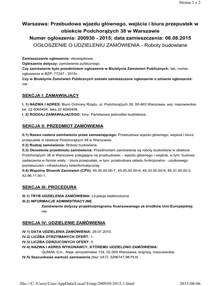 Strona 1 z 2 Warszawa: Przebudowa wjazdu głównego, wejścia i biura przepustek w obiekcie Podchorążych 38 w Warszawie Numer ogłoszenia: 200930 - 2015; data zamieszczenia: 06.08.2015 OGŁOSZENIE O UDZIELENIU ZAMÓWIENIA - Roboty budowlane Zamieszczanie ogłoszenia: obowiązkowe. Ogłoszenie dotyczy: zamówienia publicznego. Czy zamówienie było przedmiotem ogłoszenia w Biuletynie Zamówień Publicznych: tak, numer ogłoszenia w BZP: 77247 - 2015r. Czy w Biuletynie Zamówień Publicznych zostało zamieszczone ogłoszenie o zmianie ogłoszenia: nie. SEKCJA I: ZAMAWIAJĄCY I. 1) NAZWA I ADRES: Biuro Ochrony Rządu, ul. Podchorążych 38, 00-463 Warszawa, woj. mazowieckie, tel. 22 6065404, faks 22 6065408. I. 2) RODZAJ ZAMAWIAJĄCEGO: Inny: Państwowa jednostka budżetowa. SEKCJA II: PRZEDMIOT ZAMÓWIENIA II.1) Nazwa nadana zamówieniu przez zamawiającego: Przebudowa wjazdu głównego, wejścia i biura przepustek w obiekcie Podchorążych 38 w Warszawie. II.2) Rodzaj zamówienia: Roboty budowlane. II.3) Określenie przedmiotu zamówienia: Przedmiotem zamówienia są roboty budowlane w obiekcie Podchorążych 38 w Warszawie polegające na przebudowie: - wjazdu głównego i wejścia, w tym: budowa zadaszenia w formie wiaty; - biura przepustek, w tym: przebudowa układu funkcjonalno - użytkowego pomieszczeń i infrastruktury teleinformatycznej. II.4) Wspólny Słownik Zamówień (CPV): 45.00.00.00-7, 45.45.00.00-6, 45.33.00.00-9, 45.31.00.00-3, 42.96.11.00-1. SEKCJA III: PROCEDURA III.1) TRYB UDZIELENIA ZAMÓWIENIA: Licytacja elektroniczna III.2) INFORMACJE ADMINISTRACYJNE Zamówienie dotyczy projektu/programu finansowanego ze środków Unii Europejskiej: nie SEKCJA IV: UDZIELENIE ZAMÓWIENIA IV.1) DATA UDZIELENIA ZAMÓWIENIA: 29.07.2015. IV.2) LICZBA OTRZYMANYCH OFERT: 1. IV.3) LICZBA ODRZUCONYCH OFERT: 0. IV.4) NAZWA I ADRES WYKONAWCY, KTÓREMU UDZIELONO ZAMÓWIENIA: QUMAK S.A., Aleje Jerozolimskie 134, 02-305 Warszawa, kraj/woj. mazowieckie. IV.5) Szacunkowa wartość zamówienia (bez VAT): 3296747,98 PLN. file:///C:/Users/User/AppData/Local/Temp/200930-2015-1.html 2015-08-06 Strona 2 z 2 IV.6) INFORMACJA O CENIE WYBRANEJ OFERTY ORAZ O OFERTACH Z NAJNIŻSZĄ I NAJWYŻSZĄ CENĄ Cena wybranej oferty: 4055000,00 Oferta z najniższą ceną: 4055000,00 / Oferta z najwyższą ceną: 4055000,00 Waluta: PLN. file:///C:/Users/User/AppData/Local/Temp/200930-2015-1.html 2015-08-06