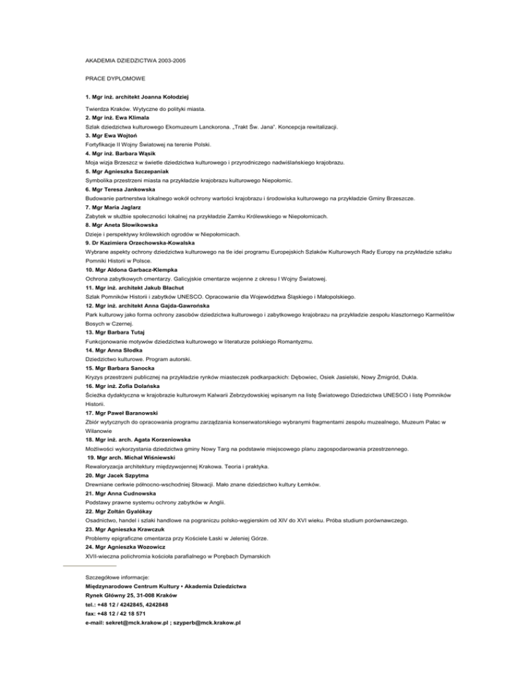 AKADEMIA DZIEDZICTWA 2003-2005 PRACE DYPLOMOWE 1