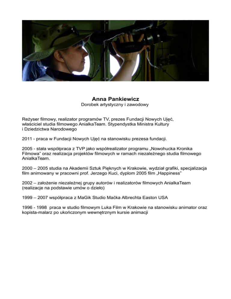 Anna Pankiewicz Dorobek artystyczny i zawodowy Reżyser filmowy, realizator programów TV, prezes Fundacji Nowych Ujęć, właściciel studia filmowego AnialkaTeam. Stypendystka Ministra Kultury i Dziedzictwa Narodowego 2011 - praca w Fundacji Nowych Ujęć na stanowisku prezesa fundacji. 2005 - stała współpraca z TVP jako współrealizator programu „Nowohucka Kronika Filmowa” oraz realizacja projektów filmowych w ramach niezależnego studia filmowego AnialkaTeam. 2000 – 2005 studia na Akademii Sztuk Pięknych w Krakowie, wydział grafiki, specjalizacja film animowany w pracowni prof. Jerzego Kuci, dyplom 2005 film „Happiness” 2002 – założenie niezależnej grupy autorów i realizatorów filmowych AnialkaTeam (realizacje na podstawie umów o dzieło) 1999 – 2007 współpraca z MaGik Studio Maćka Albrechta Easton USA 1996 - 1998 praca w studio filmowym Luka Film w Krakowie na stanowisku animator oraz kopista-malarz po ukończonym wewnętrznym kursie animacji OPIS DOROBKU Pełna filmografia filmy animowane KOMUKOK 2010/2011 projekt polsko-czeski (zakończony etap developmentu) POKIWANKA 2011 TWOJA MELANCHOLIA 2009 ANA DUE 2009 SIOŁEK 2008 SIECIAKI 2006/2007 TRIADA NOWOHUCKA 2007 HAPPINESS 2005 ZAWSZE BĘDZIE JUTRO 2003 CZERWONY KAPTUREK VEL DZIWNA HISTORIA 2002 DLA TWOJEJ MAMY 2002 Pełna filmografia filmy dokumentalne 2012 reżyseria filmu dokumentalnego „Żeby nie zapomnieć" prod. Muzeum Historyczne Miasta Krakowa 2010 film dokumentalny „Lipowa 4”. Film stanowi część ekspozycji stałej Oddziału MHK. współpraca reżyserska prod. Muzeum Historyczne Miasta Krakowa 2010 “ Przewroty cdn... “ film dokumentalny prod. Muzeum Miejskie w Wadowicach (reżyseria, scenariusz) 2008 reżyseria filmu edukacyjnego „Dźwięk” o zjawiskach fizycznych związanych z dźwiękiem z aktorskim udziałem 8-11-letnich dzieci. Film rozpowszechniany w szkołach podstawowych jako pomoc dydaktyczna do przedmiotu fizyka. Zrealizowany z udziałem pracowników krakowskiego Ogrodu Doświadczeń na zlecenie KZK w Krakowie. Programy TV 2005-2012 (współrealizator) program TVP „Nowohucka Kronika Filmowa” 36 wydań 2010/2011 (pomysł serii, reżyseria) „Twarze Małopolski” dokumentalno-popularyzatorki serial telewizyjny prod. Małopolski Instytut Kultury dla TVP 2011/2012 (pomysł serii, redakcja, reżyseria) “Klatka po klatce” prod. Fundacja Nowych Ujęć dla TVP Pozostałe 2008 Muzeum Etnograficzne im. Seweryna Udzieli w Krakowie – reklama telewizyjna wystawy „Andrzej Wajda – etnograficzny remanent”. (pomysł, reżyseria) 2008 reklama telewizyjna krakowskiego Ogrodu Doświadczeń (reżyseria) 2007 Małopolski Instytut Kultury — „Muzeobranie 2007” reklama telewizyjna (reżyseria, opracowanie plastyczne) 2006 telewizyjna reklama inwestycji drogowej „Monte Cassino – Kapelanka – Brożka” na zlecenie krakowskiego ZdiT (reżyseria) 2011 Reklama promocyjna dla Międzynarodowego Centrum Kultury (pomysł, reżyseria) 2010 Czołówka filmu dokumentalnego zrealizowanego dla MHK „Zagrajmy to jeszcze raz” (pomysł, animacja) 2009 Czołówka do filmu dokumentalnego zrealizowanego na zlecenia MHK „Nowa Huta labirynt pamięci” (pomysł, realizacja) 2007 oraz 2008 Reklama TV Województwa Małopolskiego „ Małopolska Idą ferie” (plastyka, reżyseria, animacja) 2010 Czołówka festiwalu OFAFA (pomysł, reżyseria, animacja) 2008 Film informacyjny animowany finansowany ze środków Europejskiego Funduszu Społecznego dla projektu „Partnerska interwencja dla rozwoju inicjatyw lokalnych metodą manufaktur integracyjbych” Warsztaty filmowe Warsztaty filmowe jedno oraz trzydniowe dla Społecznej szkoły Podstawowej nr3 w Krakowie 2007 i 2008 rok (pomysł warsztatów, instruktor) Warsztaty animacji w ramach festiwalu filmów animowanych PAF w Ołomuńcu (Republika Czeska) grudzień 2010 (pomysłodawca, instruktor, koordynator strona polska) Warsztaty filmowe realizowane w trakcie projektu Polska Szkoła Biznesu na zlecenie Małopolskiego Instytutu Kultury dla młodzieży w Andrychowie 2008 (instruktor) Warsztaty filmowe w ramach projektu rozwoju bibliotek na zlecenie Biblioteki Publicznej w Krynicy-Zdroju dla modzieży ponadgimnazjalnej 2011 (instruktor) Warsztaty filmowe na zlecenie Klubu Filmowego Lokator 2007 rok (pomysł, instruktor) Warsztaty filmowe w ramach projektu „Małopolskie dni dziedzictwa kulturowego” dla MIK 2005 i 2004 (instruktor) Warsztaty filmowe z filmu animowanego w ramach projektu „Akademia Młodego Widza” na zlecenie Ośrodka Kultury im CK Norwida od 2006 do obecnie