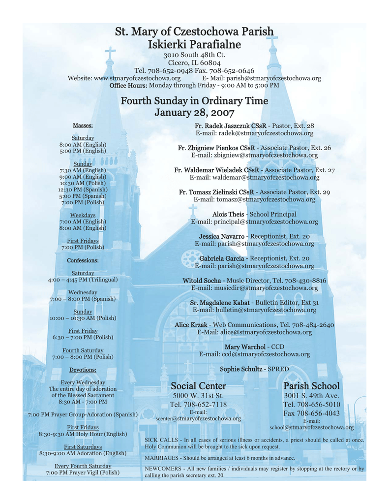 St. Mary of Czestochowa Parish Iskierki Parafialne 3010 South 48th Ct. Cicero, IL 60804 Tel. 708-652-0948 Fax. 708-652-0646 Website: www.stmaryofczestochowa.org E- Mail: [email protected] Office Hours: Monday through Friday - 9:00 AM to 5:00 PM Fourth Sunday in Ordinary Time January 28, 2007 Masses: Saturday 8:00 AM (English) 5:00 PM (English) Sunday 7:30 AM (English) 9:00 AM (English) 10:30 AM (Polish) 12:30 PM (Spanish) 5:00 PM (Spanish) 7:00 PM (Polish) Weekdays 7:00 AM (English) 8:00 AM (English) First Fridays 7:00 PM (Polish) Confessions: Saturday 4:00 – 4:45 PM (Trilingual) Wednesday 7:00 – 8:00 PM (Spanish) Sunday 10:00 – 10:30 AM (Polish) First Friday 6:30 – 7:00 PM (Polish) Fr. Radek Jaszczuk CSsR - Pastor, Ext. 28 E-mail: [email protected] Fr. Zbigniew Pienkos CSsR - Associate Pastor, Ext. 26 E-mail: [email protected] Fr. Waldemar Wieladek CSsR - Associate Pastor, Ext. 27 E-mail: [email protected] Fr. Tomasz Zielinski CSsR - Associate Pastor, Ext. 29 E-mail: [email protected] Alois Theis - School Principal E-mail: [email protected] Jessica Navarro - Receptionist, Ext. 20 E-mail: [email protected] Gabriela Garcia - Receptionist, Ext. 20 E-mail: [email protected] Witold Socha - Music Director, Tel. 708-430-8816 E-mail: [email protected] Sr. Magdalene Kabat - Bulletin Editor, Ext 31 E-mail: [email protected] Alice Krzak - Web Communications, Tel. 708-484-2640 E-Mail: [email protected] Fourth Saturday 7:00 – 8:00 PM (Polish) Mary Warchol - CCD E-mail: [email protected] Devotions: Sophie Schultz - SPRED Every Wednesday The entire day of adoration of the Blessed Sacrament 8:30 AM - 7:00 PM 7:00 PM Prayer Group-Adoration (Spanish) First Fridays 8:30-9:30 AM Holy Hour (English) First Saturdays 8:30-9:00 AM Adoration (English) Every Fourth Saturday 7:00 PM Prayer Vigil (Polish) Social Center Parish School 5000 W. 31st St. Tel. 708-652-7118 3001 S. 49th Ave. Tel. 708-656-5010 Fax 708-656-4043 E-mail: [email protected] E-mail: [email protected] SICK CALLS - In all cases of serious illness or accidents, a priest should be called at once. Holy Communion will be brought to the sick upon request. MARRIAGES - Should be arranged at least 6 months in advance. NEWCOMERS - All new families / individuals may register by stopping at the rectory or by calling the parish secretary ext. 20. Sunday Iskierki Parafialne MASS INTENTIONS January 28, Fourth Sunday in Ordinary Time 7:30 †Bernard Pugno (Marcy Pugno family) 9:00 †Edward Beckman (niece Ann) †Walentyna Burczyk (Henry Glowacki) 10:30 O szczęśliwe rozwiazanie dla Agaty †Janusz Ślęzak †Robert Kuzara (Dolores Kuzara) †Casmer Matysiak (Dolores Kuzara) †Edward Koch (Dolores Kuzara) †Zofia †Karolina Chowaniec 12:30 †Rafael Chavez (Hilda Martinez Chavez) †Juan Antonio Muniz (su mama) †Juan Manuel Muniz (su mama) †Alicia Muniz (su mama) †Maria Hernandez (su mama) 5:00 Por los feligreses 7:00 O łaski i siłę ducha dla syna †Bronisław Nieradka January 29, Monday, Weekday 7:00 Bronisław Nieradka 8:00 Rita I Tesar January 30, Tuesday, Weekday ..7:00 †Bronisław Nieradka 8:00 †Cecilia Beckman (Grandaughter Ann) January 31, Wednesday, John Bosco, priest 7:00 †Bronisław Nieradka 8:00 †Emily Cwiok (Carolyn Cwiok DeCesari) February 1, Thursday, Weekday 7:00 †Anthony Poplawski (family) 8:00 †Bronisław Nieradka February 2, First Friday, Presentation of the Lord 7:00 †John E. Kociolko 8:00 †Agnes Warchol (Balla Family) ..8:30 Adoration 6:30 Spanish Mass 8:00 Polish Mass †Bronisław Nieradka February 3, Saturday, Blaise, bishop and martyr 8:00 †Bronisław Nieradka 8:30 Adoration 1PM Wedding Mass: Katarzyna Borzecka & Dariusz Karpiuk 5:00 †Rita Roszyk †Jack Sitar (Mother E. Sitar) †Pat Locke (Mother E. Sitar) †Leonarda Aguirre (friends) February 4, Fifth Sunday in Ordinary Time 7:30 †David Wisniewski (Parents, Marie & Eugene) †Joseph & Robert Wozniak (family) †Bernard Pugno (Odelia Gozdiak, Mel Lozin) 9:00 Parishioners 10:30 O szczęśliwe rozwiązanie dla Anny †Janusz Ślęzak †Edward Ptak †Kazimierz Maturski ( 4 rocz. śmierci) 12:30 †Juana Castro (sus hijos) 5:00 Por los feligreses 7:00 O dobry i błogosławiony czas starośći dla mamy †Bronisław Nieradka Lector Schedule Saturday, February 3, 2007 5PM Marissa Martinez, Sr. Magdalene Sunday, February 4, 2007 7:30 John Kociolko 9:00 Kim Tross, Nicole Perez 10:30 Waldemar Lipka, Violette Bielobradek 12:30 Marisol Ortiz, Javier Sanchez, Roberto Pasillas, Manuel Naula 5:00 Linda Ramirez, Maria Rodriguez, Trinidad Torrez 7:00 - Eucharistic Ministers Saturday, February 3, 2007 5PM Joanne & Larry Napoletano, Sunday, February 4, 2007 7:30 Ed Hennessy 9:00 Irene Saldana, Vicente Saldana Rita Mejka, Georgia Czarnecki Larry Napoletano, Christine Zaragoza 10:30 Priests & Polish ministers 12:30 Mario Segoviano,Mariana Garcia 5:00 Enrique Garcia, Maria Cruz Rodriguez 7:00 Priests WEDDING BANNS There is a promise of marriage between: III. Katarzyna Borzecka & Dariusz Karpiuk II. Cesława Bielak & Marek Turza. II. Nikki Herman & Edgar R. Gonzalez We welcome in Baptism….. Diego Abraham Ortiz St. Mary of Czestochowa Sunday Collection January 21, 2007 1/20 5:00PM $642.00 1/21 7:30AM $391.00 9:00AM $1,404.00 10:30AM $1,697.00 12:30PM $1,307.31 5:00PM $231.50 7:00PM $129.00 TOTAL $5,801.81 What is the Annual Catholic Appeal? The Roman Catholic Archdiocese of Chicago as is the case in most (arch) dioceses in the U.S., conducts an annual campaign to help fund the work of its departments, agencies and offices. Without such campaigns, the training, ministry, education and administrative services provided by the Archdiocese would have to be funded almost totally through taxation of parish income. While direct contributions made to annual appeals do not come out of parish income, a higher tax would. This would cripple parishes economically. The people of every parish and mission in the Archdiocese are asked, once a year, to make a significant fina