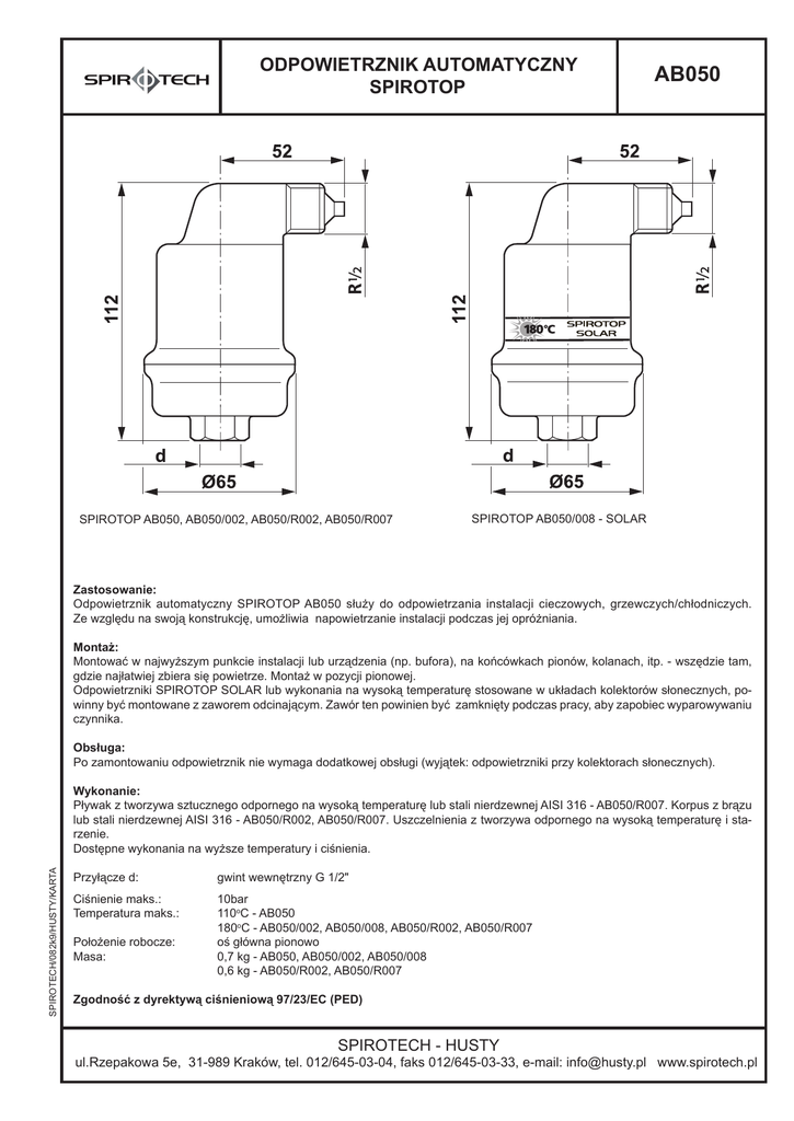 ODPOWIETRZNIK AUTOMATYCZNY SPIROTOP SPIROTOP AB050, AB050/002, AB050/R002, AB050/R007 AB050 SPIROTOP AB050/008 - SOLAR Zastosowanie: Odpowietrznik automatyczny SPIROTOP AB050 służy do odpowietrzania instalacji cieczowych, grzewczych/chłodniczych. Ze względu na swoją konstrukcję, umożliwia napowietrzanie instalacji podczas jej opróżniania. Montaż: Montować w najwyższym punkcie instalacji lub urządzenia (np. bufora), na końcówkach pionów, kolanach, itp. - wszędzie tam, gdzie najłatwiej zbiera się powietrze. Montaż w pozycji pionowej. Odpowietrzniki SPIROTOP SOLAR lub wykonania na wysoką temperaturę stosowane w układach kolektorów słonecznych, powinny być montowane z zaworem odcinającym. Zawór ten powinien być zamknięty podczas pracy, aby zapobiec wyparowywaniu czynnika. Obsługa: Po zamontowaniu odpowietrznik nie wymaga dodatkowej obsługi (wyjątek: odpowietrzniki przy kolektorach słonecznych). SPIROTECH/082k9/HUSTY/KARTA Wykonanie: Pływak z tworzywa sztucznego odpornego na wysoką temperaturę lub stali nierdzewnej AISI 316 - AB050/R007. Korpus z brązu lub stali nierdzewnej AISI 316 - AB050/R002, AB050/R007. Uszczelnienia z tworzywa odpornego na wysoką temperaturę i starzenie. Dostępne wykonania na wyższe temperatury i ciśnienia. Przyłącze d: gwint wewnętrzny G 1/2" Ciśnienie maks.: Temperatura maks.: 10bar 110oC - AB050 180oC - AB050/002, AB050/008, AB050/R002, AB050/R007 oś główna pionowo 0,7 kg - AB050, AB050/002, AB050/008 0,6 kg - AB050/R002, AB050/R007 Położenie robocze: Masa: Zgodność z dyrektywą ciśnieniową 97/23/EC (PED) SPIROTECH - HUSTY ul.Rzepakowa 5e, 31-989 Kraków, tel. 012/645-03-04, faks 012/645-03-33, e-mail: [email protected] www.spirotech.pl