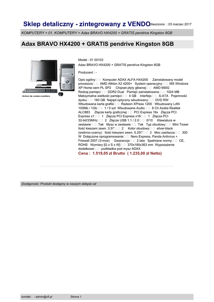 Sklep detaliczny - zintegrowany z VENDOUtworzono : 03 marzec 2017 KOMPUTERY > 01. KOMPUTERY > Adax BRAVO HX4200 + GRATIS pendrive Kingston 8GB Adax BRAVO HX4200 + GRATIS pendrive Kingston 8GB Model : 01 00103 Adax BRAVO HX4200 + GRATIS pendrive Kingston 8GB Producent : Opis ogólny Komputer ADAX ALFA HX4200 Zainstalowany model procesora AMD Athlon X2 4200+ System operacyjny MS Windows XP Home oem PL SP2 Chipset płyty głównej AMD 690G Rodzaj pamięci DDR2 Dual Pamięć zainstalowana 1024 MB Maksymalna wielkość pamięci 4 GB Interfejs S-ATA Pojemność dysku 160 GB Napęd optyczny wbudowany DVD RW Wbudowana karta grafiki Radeon XPress 1200 Wbudowany LAN 100Mb / 1Gb 1 / 0 szt Wbudowane Audio 8 Ch Azalia Realtek ALC883 Złącze karty graficznej PCI Express 16x Złącza PCI Express x1 1 Złącza PCI Express x16 1 Złącza PCI 32-bit/33MHz 2 Złącze USB 1.1 / 2.0 0/10 Klawiatura w zestawie Tak Mysz w zestawie Tak Typ obudowy Mini Tower Ilość kieszeni zewn. 3.5\" 2 Kolor obudowy silver-black (srebrno-czarny) Ilość kieszeni zewn. 5.25\" 2 Moc zasilacza 300 W Dołączone oprogramowanie Nero Express, Panda Antivirus + Firewall 2007 (3-mce) Gwarancja 2 lata Spełniane normy CE, ROHS Wymiary [G x S x W] 370x180x363 mm Wyposażenie dodatkowe podkładka pod mysz ADAX Cena : 1.519,05 zł Brutto ( 1.235,00 zł Netto) Dostępność: Produkt dostępny w naszym sklepie od kontakt : - [email protected] Strona 1
