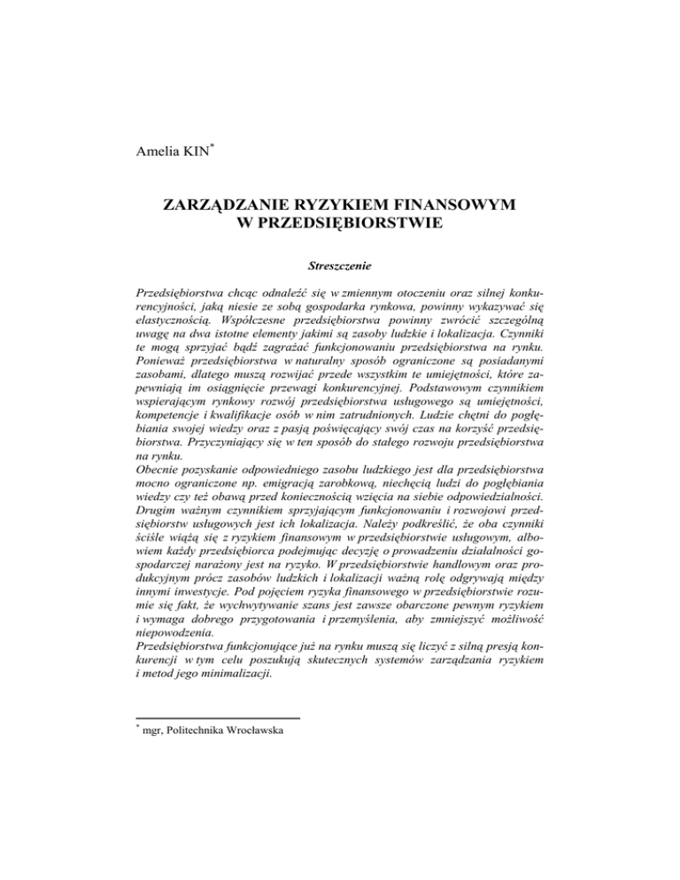 Amelia KIN Zarządzanie ryzykiem finansowym w przedsiębiorstwie