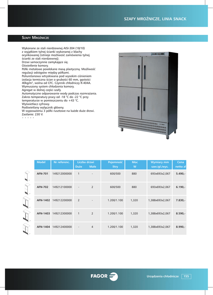 SZAFY MROŹNICZE, LINIA SNACK Szafy Mroźnicze Wykonane ze stali nierdzewnej AISI-304 (18/10) z wyjątkiem tylnej ścianki wykonanej z blachy ocynkowanej (istnieje możliwość zamówienia tylnej ścianki ze stali nierdzewnej). Drzwi samoczynnie zamykające się. Oświetlenie komory. Półki metalowe powlekane masą plastyczną. Możliwość regulacji odstępów między półkami. Poliuretanowa wtryskiwana pod wysokim ciśnieniem izolacja termiczna ścian o grubości 60 mm, gęstości 40kg/m3, wolna od CFC. Czynnik chłodniczy R-404A. Wymuszony system chłodzenia komory. Agregat w dolnej części szafy. Automatyczne odparowanie wody podczas rozmrażania. Zakres temperatury pracy od -18 °C do -22 °C przy temperaturze w pomieszczeniu do +43 °C. Wyświetlacz cyfrowy. Podświetlany wyłącznik główny. W wyposażeniu 3 półki rusztowe na każde duże drzwi. Zasilanie: 230 V. ••••• Model Nr referenc. Liczba drzwi Pojemność Moc Wymiary mm Cena Duże Małe litry W szer./gł./wys. netto zł AFN-701 149212000000 1 - 600/500 880 693x693x2,067 5.490,- AFN-702 149212100000 - 2 600/500 880 693x693x2,067 6.190,- AFN-1402 149212200000 2 - 1.200/1.100 1,320 1,388x693x2,067 7.830,- AFN-1403 149212300000 1 2 1.200/1.100 1,320 1,388x693x2,067 8.590,- AFN-1404 149212400000 - 4 1.200/1.100 1,320 1,388x693x2,067 8.990,- Urządzenia chłodnicze 155 SZAFY MROŹNE, LINIA GN 2/1 Szafy Mroźne, Linia GN 2/1 Wymuszony system chłodzenia komory. Wewnętrzne narożniki z zaokrąglonymi krawędziami. Zakres temperatury pracy od -18 °C do -22 °C przy temperaturze w pomieszczeniu do +43 °C. Wyświetlacz cyfrowy. Wykonane z zewnątrz i wewnątrz ze stali nierdzewnej AISI-304 (18/10) z wyjątkiem tylnej ścianki wykonanej z blachy ocynkowanej (istnieje możliwość zamówienia tylnej ścianki ze stali nierdzewnej). Nogi z regulowaną wysokością. Drzwi samoczynnie zamykające się. Poliuretanowa wtryskiwana pod wysokim ciśnieniem izolacja termiczna ścian o grubości 60 mm, gęstości 40kg/m3, wolna od CFC. W wyposażeniu 3 półki rusztowe GN 2/1 na każde duże drzwi. Wyłącznik wentylatora. Automatyczne odparowanie wody podczas rozmrażania. Możliwość regulacji odstępów między półkami. Półki metalowe powlekane masą plastyczną. Podświetlany wyłącznik główny. Zasilanie: 230 V. ••••• Model Ne referenc. Drzwi duże małe Pojemność Moc Wymiary mm Cena litry W szer./gł./wys. netto zł AFN-801 149222000000 1 - 700/600 880 710x800x2,010 5.600,- AFN-802 149222100000 - 2 700/600 880 710x800x2,010 6.310,- AFN-1602 149222200000 2 - 1.400/1.200 1,320 1,400x800x2,010 7.990,- AFN-1603 149222300000 1 2 1.400/1.200 1,320 1,400x800x2,010 8.770,- AFN-1604 149222400000 - 4 1.400/1.200 1,320 1,400x800x2,010 9.200,- 160 Urządzenia chłodnicze SZAFY CHŁODNICZE, LINIA GN 2/1 Szafa Chłodniczo-Mroźna, Linia GN 2/1 Dwie niezależne komory (chłodnicza i mroźna) z oddzielnymi kompresorami, parownikami i sterowaniem. Wewnętrzne narożniki z zaokrąglonymi krawędziami. Wyświetlacz cyfrowy. Wykonane z zewnątrz i wewnątrz ze stali nierdzewnej AISI-304 (18/10) z wyjątkiem tylnej ścianki wykonanej z blachy ocynkowanej (istnieje możliwość zamówienia tylnej ścianki ze stali nierdzewnej). Nogi z regulowaną wysokością. Drzwi samoczynnie zamykające się. Poliuretanowa wtryskiwana pod wysokim ciśnieniem izolacja termiczna ścian o grubości 60 mm, gęstości 40kg/m3, wolna od CFC. Wewnętrzne oświetlenie. W wyposażeniu 3 półki rusztowe GN 2/1 na każde drzwi. Wyłącznik wentylatora. Automatyczne odparowanie wody podczas rozmrażania. Możliwość regulacji odstępów między półkami. Półki metalowe powlekane masą plastyczną. Podświetlany wyłącznik główny. Zasilanie: 230 V. Komora chłodnicza: Wymuszony obieg powietrza w komorze. Zakres temperatury pracy od 0 °C do +8 °C przy temperaturze w pomieszczeniu do +43 °C. Komora mroźna: Wymuszony obieg powietrza w komorze. Zakres temperatury pracy od -18 °C do -22 °C przy temperaturze w pomieszczeniu do +43 °C. ••••• Model Nr referencyjny AF-1602 MIX 149411000000 Liczba drzwi komór Pojemność Moc Wymiary mm Cena chłodniczej mroźnej litry W szer./gł./wys. netto zł 2 x 700/600 1,364 1,400x800x2,010 1 1 9.900,- Urządzenia chłodnicze 161