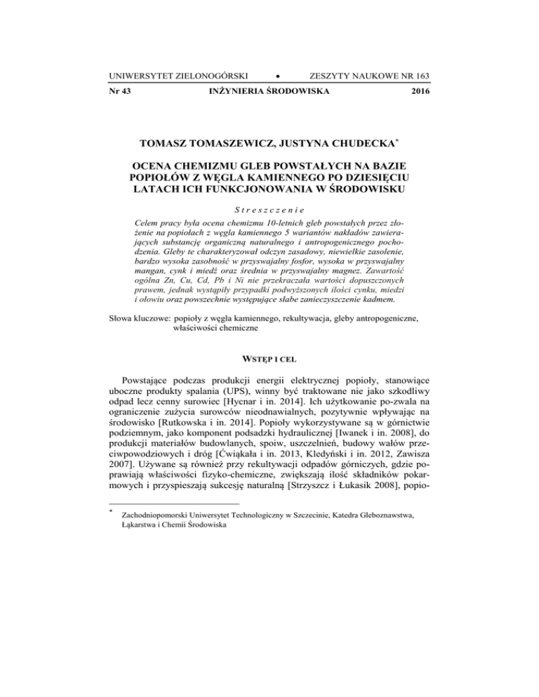 UNIWERSYTET ZIELONOGÓRSKI Nr 43 ZESZYTY NAUKOWE NR 163 INŻYNIERIA ŚRODOWISKA 2016 TOMASZ TOMASZEWICZ, JUSTYNA CHUDECKA* OCENA CHEMIZMU GLEB POWSTAŁYCH NA BAZIE POPIOŁÓW Z WĘGLA KAMIENNEGO PO DZIESIĘCIU LATACH ICH FUNKCJONOWANIA W ŚRODOWISKU Streszczenie Celem pracy była ocena chemizmu 10-letnich gleb powstałych przez złożenie na popiołach z węgla kamiennego 5 wariantów nakładów zawierających substancję organiczną naturalnego i antropogenicznego pochodzenia. Gleby te charakteryzował odczyn zasadowy, niewielkie zasolenie, bardzo wysoka zasobność w przyswajalny fosfor, wysoka w przyswajalny mangan, cynk i miedź oraz średnia w przyswajalny magnez. Zawartość ogólna Zn, Cu, Cd, Pb i Ni nie przekraczała wartości dopuszczonych prawem, jednak wystąpiły przypadki podwyższonych ilości cynku, miedzi i ołowiu oraz powszechnie występujące słabe zanieczyszczenie kadmem. Słowa kluczowe: popioły z węgla kamiennego, rekultywacja, gleby antropogeniczne, właściwości chemiczne WSTĘP I CEL Powstające podczas produkcji energii elektrycznej popioły, stanowiące uboczne produkty spalania (UPS), winny być traktowane nie jako szkodliwy odpad lecz cenny surowiec [Hycnar i in. 2014]. Ich użytkowanie po-zwala na ograniczenie zużycia surowców nieodnawialnych, pozytywnie wpływając na środowisko [Rutkowska i in. 2014]. Popioły wykorzystywane są w górnictwie podziemnym, jako komponent podsadzki hydraulicznej [Iwanek i in. 2008], do produkcji materiałów budowlanych, spoiw, uszczelnień, budowy wałów przeciwpowodziowych i dróg [Ćwiąkała i in. 2013, Kledyński i in. 2012, Zawisza 2007]. Używane są również przy rekultywacji odpadów górniczych, gdzie poprawiają właściwości fizyko-chemiczne, zwiększają ilość składników pokarmowych i przyspieszają sukcesję naturalną [Strzyszcz i Łukasik 2008], popio* Zachodniopomorski Uniwersytet Technologiczny w Szczecinie, Katedra Gleboznawstwa, Łąkarstwa i Chemii Środowiska Ocena chemizmu gleb … 75 łowanie służyło rekultywacyjnym gleb poddanych niszczącemu działaniu Zakładów Azotowych w Puławach [Dyguś i in. 2012]. Innym sposobem zagospodarowania popiołów jest wypełnianie wyrobisk, po wydobyciu żwiru [Koćmit i in. 2007], czy też węgla brunatnego [Pozzi i Mzyk 2012]. Innym sposobem zagospodarowania popiołów jest ich zastosowanie w rolnictwie i leśnictwie. Może być to stosowanie w dawkach melioracyjnych, o długotrwałym wpływie na gleby i roślinność [Ciećko i in. 2009, Maciak i Liwski 1981], jak też aplikacja w dawkach nawozowych [Meller 1999, Podlasińska 2003, Właśniewski 2009]. Jednak część popiołów nadal podlega składowaniu. Charakteryzują się wówczas one bardzo duża pyłową uciążliwością dla środowiska. Powoduje to konieczność szybkiego utrwaleniu powierzchni składowiska i zainicjowania procesów glebotwórczych tworzących warunki do wzrostu i rozwoju pokrywy roślinnej [Siuta i Dyguś 2015]. Wśród sposobów do tego prowadzących można wyróżnić: ‒ metodę polegającą na naprawie wadliwego chemizmu skały popiołowej poprzez nawożenie mineralne w odpowiedniej ilości i proporcjach [Bender i Gilewska 2004, Gilewska 2004]; ‒ techniczne odtwarzanie gleb polegające na nawiezieniu warstwy próchnicznej lub materiałów mineralnych [Bender i Gilewska 2004, Siuta i in. 2008, Woch 2012, Wróbel i in. 2006]; ‒ tworzenie wierzchniej warstwy z mieszaniny popiołu i substancji organicznych (kompostów, osadów ściekowych, torfu, itp.) [Koćmit i in. 2006, Klimont 2011, Siuta i in. 2008, Siuta i Dyguś 2015]. Celem niniejszej pracy była ocena właściwości chemicznych gleb powstałych na bazie popiołów ze spalenia węgla kamiennego w różnych wariantach doświadczenia po 10 latach od jego założenia. METODYKA W roku 2003 na terenie Z.E. „Dolna Odra” w Nowym Czarnowie (woj. zachodniopomorskie) założono doświadczenie dotyczące sposobu zagospodarowania zwałowisk popiołów z węgla kamiennego. Na podłożu popiołowym złożono 40-centymetrową warstwę żyzną, zwaną dalej nadkładem, zastosowaną w pięciu wariantach mieszanin różnych materiałów (tab. 1). Następnie obiekt podzielono na poletka doświadczalne i wprowadzono roślinność, w tym mieszanki traw [Czyż i Kitczak 2007]. Jesienią 2013 roku pobrano próbki zbiorcze z sześciu poletek doświadczalnych. Pięć z nich, o nr 1-5, zawierało gleby antropogeniczne utworzone przez nałożenie na popiół nadkładów w wariantach I-V, a na szóstym poletku (nr 30), traktowanym jako kontrola, znajdował się tylko popiół bez nadkładu (tab. 2-5). Z poletek o nr 1-5 pobrano próbki z warstw: 0-40 cm (nadkładu) i 40-60 cm 76 T. Tomaszewicz, J. Chudecka (popiołu), a na poletku kontrolnym – z warstwy 0-20 cm, zawierającej próchnicę, oraz z warstwy bezpróchnicznej 20-50 cm. Próbki glebowe wysuszono, roztarto i oznaczono w nich: uziarnienie metodą areometryczną Casagrande`a w modyfikacji Prószyńskiego (nazewnictwo grup granulometrycznych ustalono według PTG 2009); straty materiału na żarzeniu w temperaturze 550C, przyjęte za zawartość materii organicznej (OM); zawartość CaCO3 metodą Scheiblera; pHKCl potencjometrycznie w roztworze o stężeniu 1 mol KCl·dm–3; zasolenie konduktometrycznie jako przewodność elektrolityczną (EC) zawiesiny wodno-glebowej o stosunku wagowym gleba/woda, jak 1:2,5; ogólną zawartość C, N i S z użyciem elementarnego analizatora CHNS; ilość przyswajalnych form P i K metodą Egnehra-Riehma oraz Mg metodą Schachtschabela; zawartość rozpuszczalnych w 1M HCl form Mn, Zn i Cu metodą ASA oraz ogólną zawartość Zn, Cu, Cd, Pb i Ni metodą ASA po mineralizacji w mieszaninie (1:1) stężonych kwasów azotowego (V) i chlorowego (VII). Tabela 1. Skład nadkładów (0-40 cm) zastosowanych w doświadczeniu w Z.E. Dolna Odra [Koćmit i in. 2006] Table 1. The composition of surface layers (0-40 cm) used in experiment in Z.E. Dolna 