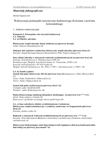 Turystyka Kulturowa, www.turystykakulturowa.org Nr 6/2011 (czerwiec 2011) Materiały faktograficzne Michał Stępniewski Waloryzacja potencjału turystyczno-kulturowego Kościana i powiatu kościańskiego 1. Ankieta waloryzacyjna Kategoria I: Potencjalne cele turystyki kulturowej I.A: Zabytki: I.A. a) Obiekty sakralne: Historyczny zespół sakralny dużej wielkości (za pierwsze dwa)(6) Lubiń: Klasztor Benedyktynów (6) Mniejszy lub częściowo zachowany historyczny zespół sakralny (pierwsze dwa) (3) Kościan: Zespół dawnego klasztoru Bernardynów (Plac Paderewskiego) (3) Inny obiekt sakralny o znacznych walorach architektonicznych (za pierwsze trzy) (4) Kościan: Kościół farny p.w. Wniebowzięcia NMP (4) Bronikowo (gm. Śmigiel), kościół drewniany św. Franciszka, XVIII w.(4) Krzywiń: kościół gotycki z XV-XVI wieku.(4) Śmigiel: kościół cmentarny pw. Św. Wita z 1769 r., odrestaurowany w 1908 r. (0) I.A. b) Zamki i pałace: Zamek lub pałac historyczny ZD (Za pierwsze trzy) (3) Kopaszewo: Pałac Skórzewskich (3) Czacz: Pałac Szołdrskich i Żółtowskich (3) Turew: Pałac Chłapowskich (3) Zamek lub pałac stylizowany(za pierwsze dwa)* (2) Czempiń: pałac Szołdrskich(0) Wonieść : pałac Wedermayerów (0) Ruina historycznego zamku/grodu/pałacu niedostępne (za pierwsze trzy****) (1) Osiek: Ruiny pałacu w Osieku (0) Bruszczewo: grodzisko wczesnego okresu epoki brązu (0) I.A. c) Inne zabytkowe obiekty architektoniczne i techniczne: Historyczny zespół urbanistyczny z rynkiem, zachowany we fragmentach (pierwsze dwa) (3) Kościan, okolice rynku (3) Budynek o znacznych walorach architektonicznych (za pierwsze trzy ****) (3) Kościan: Dom Masztalerza (budynek o konstrukcji szachulcowej) (3)udynek o konstrukcji szachulcowej) (3) Historyczna funkcjonująca stale linia kolejowa lub żeglugowa (lub przystanki pośrednie linii stałej) (za pierwszy przystanek**6) 41 Turystyka Kulturowa, www.turystykakulturowa.org Nr 6/2011 (czerwiec 2011) Śmigiel : Śmigielska Kolej Wąskotorowa (6) Historyczna funkcjonująca sezonowo linia kolejowa lub żeglugowa (lub przystanki pośrednie linii stałej) (za pierwszy przystanek**4) Krzywiń: Krzywińska Kolej Drezynowa (0) I.A. d) Obiekty militarne Ruiny fortyfikacji miejskich (1) Kościan, fragmenty murów miejskich (1) Dodatkowe punkty za obiekty dziedzictwa kulturowego Obiekt będący na polskie liście Pomników Historii ZD ( dodatkowo jeśli nie znajduje się on na liście UNESCO (15) Lubiń: Klasztor Benedyktynów, Pomnik Historii (15) Dodatkowe punkty za wszystkie obiekty wpisanych powyżej klas: Za bardzo dobry stan konserwacji i estetyki najważniejszych trzech obiektów (element uznaniowy) można doliczyć w sumie od 1 do 2 punktów dla całego regionu) Stan konserwacji głównych obiektów bardzo dobry (2) I.B. Miejsca historyczne lub znaczące: I.B. a) Budowle historyczne i monumenty: Pomniki lub obiekty małej architektury o znaczeniu lokalnym (do trzech****) (1) Kościan: Figura Pana Jezusa (1) Kościan: Pomnik 1939-1945 (1) Kościan: Pomnik Jana Pawła II (1) Kościan: Pomnik Józefa Surzyńskiego(0) Miejsca związane z biografią osób o krajowym znaczeniu ZD (2) Kopaszewo - pałac: Adam Mickiewicz, Helena Modrzejewska (2) Miejsca związane z biografią osób o regionalnym znaczeniu (pierwsze dwa) (1) Turew – miejsce urodzenia- Dezyderego Chłapowskiego, generała, pioniera wielkopolskiej pracy organicznej działacz (1) Kokorzyn – miejsce urodzenia Andrzeja z Kokorzyna: teologa, pisarza, profesora i rektora Akademii Krakowskiej(1) I.B. b) Cmentarze historyczne Pojedyncze miejsce pochówku osobistości znanej w skali regionu (do trzech) (1) Rąbiń: nekropolia rodu Chłapowskich (1) Inny cmentarz zabytkowy z ciekawymi obiektami sztuki sepulkralnej*** (do dwóch) ZD(1) Dawny cmentarz żydowski w Kościanie (1) I.B. c) Budowle współczesne Budowle współczesne o wysokiej wartości architektonicznej (do trzech**) (1) Kościan: ratusz zbudowany w połowie XIX wieku (1) I.C. Pojedyncze dzieła sztuki: 42 Turystyka Kulturowa, www.turystykakulturowa.org Nr 6/2011 (czerwiec 2011) Pojedyncze obiekty sztuki o znaczeniu regionalnym (do trzech*) (3) Kościan: renesansowy ołtarz główny w kościele farnym z 1620r. (3) I.D. Muzea i wystawy (w tym skanseny, galerie, muzea techniki) Muzea o znaczeniu lokalnym (do trzech***) (2) Kościan: Muzeum Regionalne w Kościanie (2) Lokalne izby pamięci, ogólnodostępne prywatne kolekcje pamiątek (do trzech****) (1) Kopaszewo (pałac): izby pamięci A. Mickiewicza i H. Modrzejewskiej (1) Inne muzea typy skansenowskiego (za pierwsze dwa) (6) Cichowo: Skansen filmowy Soplicowo, miejsce realizacji filmu „Pan Tadeusz” (6) Zorganizowane w ostatnim roku wystawy czasowe o zasięgu krajowym (w sumie za pierwsze trzy) (4) Kościan: Wystawa z okazji 600-lecia bitwy pod Grunwaldem i 110 rocznicy pierwszego wydania powieści Henryka Sienkiewicza "Krzyżacy". Wystawa zorganizowana we współpracy z Muzeum Literackim Henryka Sienkiewicza w Poznaniu. (4) Zorganizowane w ostatnim roku wystawy czasowe o zasięgu regionalnym* (w sumie za pierwsze trzy) (2) Kościan: "Zwierzęta na monetach i banknotach państw świata" ze zbiorów Z. Pniewskiego(0) Kościan: "Zagłada polskich elit. Akcja AB-Katyń" (0) Kościan: Broń strzelecka na przestrzeni wieków(0) I.E. Eventy kulturowe: Regularne eventy kultury masowej o znaczeniu krajowym (do trzech) (4) Kościan: Międzynarodowe Spotkania Folklorystyczne ,,Pociągiem do folkloru’’(6) Regularne eventy kultury wysokiej o znaczeniu regionalnym (do dwóch) (4) Kościan: Kościański Koncert Noworoczny- kościół Farny(4) Regularne eventy kultury masowej o znaczeniu regionalnym (do trzech) (4) Kościan: festiwal ,,Kościan smakuje’’(4) Kościan: Turniej Dudziarzy Wielkopolskich (4) Kościan: Dni Kościana (4) I.F. Funkcjonujące zakłady przemysłowe z oferta turystyczną: Brak obiektów w tej kategorii I.G. Kulturowo znacząca oferta przyrodnicza: Park