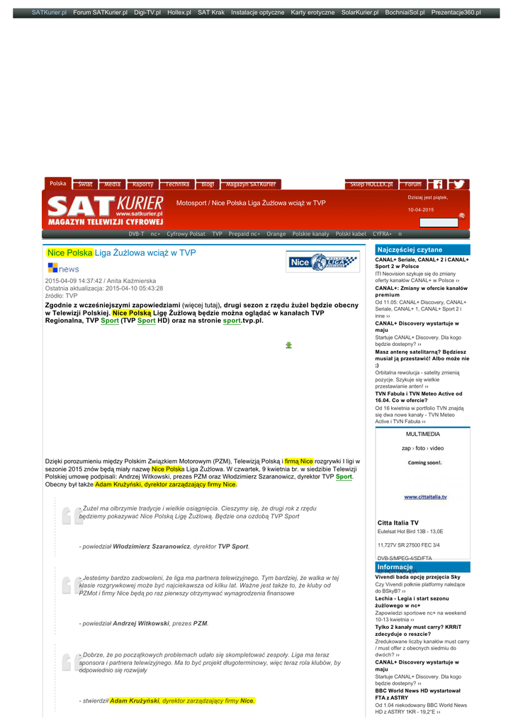 SATKurier.pl Forum SATKurier.pl Digi-TV.pl Hollex.pl SAT Krak Instalacje optyczne Karty erotyczne SolarKurier.pl BochniaiSol.pl Prezentacje360.pl Polska Świat Media Raporty Technika Blogi Magazyn SATKurier Sklep HOLLEX.pl Forum Dzisiaj jest piątek, Motosport / Nice Polska Liga Żużlowa wciąż w TVP 10-04-2015 DVB‐T nc+ Cyfrowy Polsat TVP Prepaid nc+ Orange Polskie kanały Polski kabel CYFRA+ n Nice Polska Liga Żużlowa wciąż w TVP 2015-04-09 14:37:42 / Anita Kaźmierska Ostatnia aktualizacja: 2015-04-10 05:43:28 źródło: TVP Zgodnie z wcześniejszymi zapowiedziami (więcej tutaj), drugi sezon z rzędu żużel będzie obecny w Telewizji Polskiej. Nice Polską Ligę Żużlową będzie można oglądać w kanałach TVP Regionalna, TVP Sport (TVP Sport HD) oraz na stronie sport.tvp.pl. Najczęściej czytane CANAL+ Seriale, CANAL+ 2 i CANAL+ Sport 2 w Polsce ITI Neovision szykuje się do zmiany oferty kanałów CANAL+ w Polsce ›› CANAL+: Zmiany w ofercie kanałów premium Od 11.05: CANAL+ Discovery, CANAL+ Seriale, CANAL+ 1, CANAL+ Sport 2 i inne ›› CANAL+ Discovery wystartuje w maju Startuje CANAL+ Discovery. Dla kogo będzie dostepny? ›› Masz antenę satelitarną? Będziesz musiał ją przestawić! Albo może nie ;) Orbitalna rewolucja - satelity zmienią pozycje. Szykuje się wielkie przestawianie anten! ›› TVN Fabuła i TVN Meteo Active od 16.04. Co w ofercie? Od 16 kwietnia w portfolio TVN znajdą się dwa nowe kanały - TVN Meteo Active i TVN Fabuła ›› MULTIMEDIA zap › foto › video Dzięki porozumieniu między Polskim Związkiem Motorowym (PZM), Telewizją Polską i firmą Nice rozgrywki I ligi w sezonie 2015 znów będą miały nazwę Nice Polska Liga Żużlowa. W czwartek, 9 kwietnia br. w siedzibie Telewizji Polskiej umowę podpisali: Andrzej Witkowski, prezes PZM oraz Włodzimierz Szaranowicz, dyrektor TVP Sport. Obecny był także Adam Krużyński, dyrektor zarządzający firmy Nice. - Żużel ma olbrzymie tradycje i wielkie osiągnięcia. Cieszymy się, że drugi rok z rzędu będziemy pokazywać Nice Polską Ligę Żużlową. Będzie ona ozdobą TVP Sport Citta Italia TV Eutelsat Hot Bird 13B - 13,0E - powiedział Włodzimierz Szaranowicz, dyrektor TVP Sport. 11,727V SR 27500 FEC 3/4 DVB-S/MPEG-4/SD/FTA Informacje - Jesteśmy bardzo zadowoleni, że liga ma partnera telewizyjnego. Tym bardziej, że walka w tej klasie rozgrywkowej może być najciekawsza od kilku lat. Ważne jest także to, że kluby od PZMot i firmy Nice będą po raz pierwszy otrzymywać wynagrodzenia finansowe - powiedział Andrzej Witkowski, prezes PZM. - Dobrze, że po początkowych problemach udało się skompletować zespoły. Liga ma teraz sponsora i partnera telewizyjnego. Ma to być projekt długoterminowy, więc teraz rola klubów, by odpowiednio się rozwijały - stwierdził Adam Krużyński, dyrektor zarządzający firmy Nice. ID: HCITTAITALIA Vivendi bada opcję przejęcia Sky Czy Vivendi połknie platformy należące do BSkyB? ›› Lechia - Legia i start sezonu żużlowego w nc+ Zapowiedzi sportowe nc+ na weekend 10-13 kwietnia ›› Tylko 2 kanały must carry? KRRiT zdecyduje o reszcie? Zredukowane liczby kanałów must carry / must offer z obecnych siedmiu do dwóch? ›› CANAL+ Discovery wystartuje w maju Startuje CANAL+ Discovery. Dla kogo będzie dostepny? ›› BBC World News HD wystartował FTA z ASTRY Od 1.04 niekodowany BBC World News HD z ASTRY 1KR - 19,2°E ›› Dzięki centralizacji praw rozgrywki będzie transmitować Telewizja Polska. - W każdej kolejce jeden mecz na żywo pokaże TVP Regionalna (w niedziele o 13:15), powszechnie dostępna w naziemnej telewizji cyfrowej. Dzięki temu możliwość obejrzenia transmisji z Nice Polskiej Ligi Żużlowej będzie więc miało praktycznie każde gospodarstwo w Polsce posiadające odbiornik telewizyjny - zapewnia TVP. Spotkania (w większości także na żywo) będzie pokazywać również TVP Sport oraz będą dostępne na stronie sport.tvp.pl. W sumie będzie 18 transmisji: 14 z rundy zasadniczej, po dwa spotkania półfinałowe i finałowe. Dodatkowo w ramach podpisanego porozumienia, Telewizja Polska pokaże także mecze reprezentacji Polski (pierwszy 19 kwietnia br.: Polska - Team Słowiański; transmisja w TVP Regionalnej od godziny 13:15). Nice Polska Liga Żużlowa będzie także odpowiednio promowana w serwisach sportowych Telewizji Polskiej, a podsumowanie każdej kolejki znajdzie się w „Sportowej Niedzieli”, emitowanej w TVP Info i TVP Sport. W zeszłym sezonie w TVP Regionalnej przeprowadzono 17 transmisji, a średnia wyniosła 159 tys. widzów (udziały 1,63 proc.). Rekordowe było spotkanie GKM Grudziądz - PGE Marma Rzeszów z 29 czerwca 2014 roku: średnia wyniosła 218 tys., udziały 2,41 proc. Równoległe transmisje były przeprowadzane w TVP Sport - średnia wyniosła 74 tys. (udziały 0,75 proc.); rekord to mecz Orzeł Łódź - GKM Grudziądz - 120 tys. (1,24 proc.) [dane za TVP]. W niedzielę, 12 kwietnia br. pierwszy mecz Nice Polskiej Ligi Żużlowej (1. kolejka z 6 kwietnia br. została przełożona na 17 maja br. ze względu na niesprzyjającą aurę) - o godzinie 13:15 w TVP Regionalnej, TVP Sport, a także na stronie sport.tvp.pl będzie można zobaczyć spotkanie ROW Rybnik - Wanda Instal Kraków. Mecz skomentuje Rafał Darżynkiewicz wraz z Tomaszem Bajerskim - drużynowym mistrzem Polski 2001 i uczestnikiem cyklu Grand Prix 2003. Studio poprowadzi Sebastian Parfjanowicz, a reporterem będzie Filip Czyszanowski. Plan transmisji: - niedziela, 12 kwietnia 2015 roku o 13:15, TVP Sport, sport.tvp.pl, Nice Polska Liga Żużlowa: ROW Rybnik Wanda Instal Kraków, - niedziela, 19 kwietnia 2015 roku o 13:15, TVP Regionalna, żużel: Polska - Team Słowiański, - niedziela, 26 kwietnia 2015 roku o 13:15, TVP Regionalna, sport.tvp.pl (w TVP Sport o 18:45), Nice Polska Liga Żużlowa: Orzeł Łódź - Łączyńscy-Carbon Start Gniezno, - niedziela, 10 maja 2015 roku o 13:15, TVP