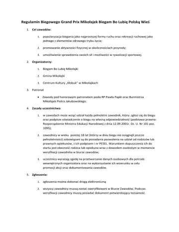 Regulamin Biegowego Grand Prix Mikołajek Biegam Bo Lubię Polską Wieś 1. Cel zawodów: 1. popularyzacja biegania jako najprostszej formy ruchu oraz rekreacji ruchowej jako jednego z elementów zdrowego trybu życia; 2. promowanie aktywności fizycznej w okolicznościach przyrody; 3. umożliwienie sprawdzenia swoich sił i możliwości w rywalizacji sportowej. 2. Organizatorzy: 1. Biegam Bo Lubię Mikołajki 2. Gmina Mikołajki 3. Centrum Kultury „Kłobuk” w Mikołajkach 3. Patronat Zawody pod honorowym patronatem posła RP Pawła Papki oraz Burmistrza Mikołajek Piotra Jakubowskiego. 4. Zasady uczestnictwa: 1. w zawodach może wziąć udział każdy pełnoletni zawodnik, który: zgłosi się do biegu oraz podpisze oświadczenie o biegu na własną odpowiedzialność (podstawa prawna: Rozporządzenie Ministra Edukacji Narodowej z dnia 12.09.2001r. Dz. U. Nr 101 poz. 1095); 2. zawodnicy w wieku poniżej 18 lat (którzy w dniu biegu nie osiągnęli jeszcze pełnoletniości) zobowiązani są do posiadania pozwolenia na udział od rodziców lub prawnych opiekunów, z ich podpisem i nr PESEL. Warunkiem dopuszczenia ich do startu jest obecność rodzica lub opiekuna wraz z dowodem osobistym w momencie weryfikacji zawodnika w biurze zawodów; 3. uczestnicy wyrażają zgodę na przetwarzanie danych osobowych dla potrzeb wewnętrznych organizatora oraz na wykorzystanie ich wizerunku w celu promocji akcji oraz dokumentowania zawodów. 5. Zgłoszenia: 1. zgłoszenia można dokonać drogą elektroniczną 2. wszyscy zawodnicy muszą zostać zweryfikowani w Biurze Zawodów. Podczas weryfikacji zawodnicy muszą posiadać dokument potwierdzający tożsamość. 6. Termin i miejsce: 1. Woźnice – 25 czerwca 2016 – Inauguracja !!! 2. Lubiewo – 24 lipca 2016 3. Faszcze – 6 sierpnia 2016 4. Stare Sady – 20 sierpnia 2016 5. Zełwagi – 27 sierpnia 2016 – Finał !!! 7. Trasa: 1. trasa biegu prowadzi po drogach gminnych; 2. dystans biegu: do 5km; 8. Pomiar czasu: 1. podstawą klasyfikacji jest elektroniczny pomiar czasu. 9. Klasyfikacja końcowa: 3. 1. warunkiem sklasyfikowania w klasyfikacji końcowej Grand Prix jest udział w co najmniej 3 z 5 biegów ; 2. w klasyfikacji generalnej Grand Prix Mikołajek po wszystkich edycjach wyróżnione będą kategorie OPEN, kategorie wiekowe w klasyfikacji indywidualnej, klasyfikacja drużynowa - najlepsza rodzina Klasyfikacja indywidualna: kategorie OPEN: kobiet i mężczyzn; kategorie wiekowe: K16 (16-34 lat), K30 (35-49 lat), K50 (50lat i starsze), M16 (16-34 lat), M30 (35-49 lat), M50 (50lat i starsi); przynależności do poszczególnych kategorii wiekowych decyduje rok urodzenia w chwili rozpoczęcia cyklu; kategorie zostaną utworzone tylko w przypadku sklasyfikowania w nich co najmniej 3 zawodników/zawodniczek, w przeciwnym razie zawodnicy zostają przyłączeni do kategorii młodszej; klasyfikacja generalna zostanie utworzona na podstawie punktów zdobytych w czterech najlepszych biegach danego zawodnika; punkty przyznawane będą za miejsca zajęte w poszczególnych biegach według systemu: 1 miejsce – 1 punkt, 2 miejsce – 2 punkty, ..., 100 miejsce – 100 punktów; 4. zwycięzcą zostaje osoba która uzbiera najmniejszą liczbę punktów uwzględniając wyniki z czterech najlepszych startów; w przypadku zdobycia przez zawodników takiej samej liczby punktów o zajętym miejscu decyduje najlepszy uzyskany czas w całym cyklu. Klasyfikacja drużynowa: najlepsza rodzina – może zostać zgłoszona dowolna ilość członków rodziny. Reprezentować będą jedno nazwisko np. Kowalski Team do klasyfikacji końcowej brane będą indywidualne wyniki 3 najlepszych sklasyfikowanych zawodników w tym jeden zawodnik musi być płci przeciwnej np. ( dwóch panów i jedna pani). Dane o przynależności do rodziny należy potwierdzić na specjalnym oświadczeniu dostępnym w biurze zawodów. Najlepszy klub - może zostać zgłoszona dowolna ilość członków klubu, do klasyfikacji końcowej brane będą indywidualne wyniki 3 najlepszych sklasyfikowanych zawodników 10. Nagrody: o w kat. OPEN – za zajęcie I miejsca voucher pobytowy do jednego z hoteli w Polsce. puchary oraz nagrody rzeczowe lub finansowe (zostaną podane do wiadomości przed ostatnim biegiem) dla 3 najlepszych zawodników; o w kat. wiekowych – puchary lub statuetki oraz nagrody rzeczowe dla 3 najlepszych zawodników; o w klasyfikacji drużynowej – puchary dla 3 najlepszych drużyn; o oprócz nagród dla najlepszych zawodników przewidujemy również wyróżnienie w postaci pamiątkowej statuetki oraz nagrody rzeczowej dla najstarszej zawodniczki oraz najstarszego zawodnika ; o nagrody nie dublują się. Zawodnicy nagrodzeni w kat. OPEN nie będą dekorowani w kategoriach wiekowych; o wszyscy uczestnicy, którzy ukończą przynajmniej 4 z 6 biegów otrzymają pamiątkowy medal; o podczas każdego z biegów będą odbywały się losowania nagród podczas których każdy z uczestników będzie miał szanse na zdobycie nagród – liczba nagród w danym biegu będzie uzależniona od zamożności gospodarza. 11. Zasady finansowania: o Opłata startowa 15 zł za jeden bieg lub wpłata jednorazowa 50 zł za wszystkie zawody. o koszty organizacji pokrywają organizatorzy. 12. Numery startowe: o numery odbieramy w biurze zawodów podczas weryfikacji 13. Postanowienia końcowe: o zawody odbywać się będą bez względu na warunki atmosferyczne; o obowiązek ubezpieczenia od następstw nieszczęśliwych wypadków leży w gestii zawodników; o organizatorzy nie odpowiadają za rzeczy pozostawione bez opieki; o uczestnik startuje wyłącznie na własną odpowiedzialność i ponosi związane z tym ryzyko. Wszyscy Uczestnicy przyjmują do wiadomości, że udział w Biegu wiąże się z wysiłkiem fizycznym i pociąga za sobą naturalne ryzyko i zagrożenie wypadkami, możliwość odniesienia obrażeń ciała i urazów fizycznych (w tym śmierci). Przekazanie Organizatorowi prawidłowo wype